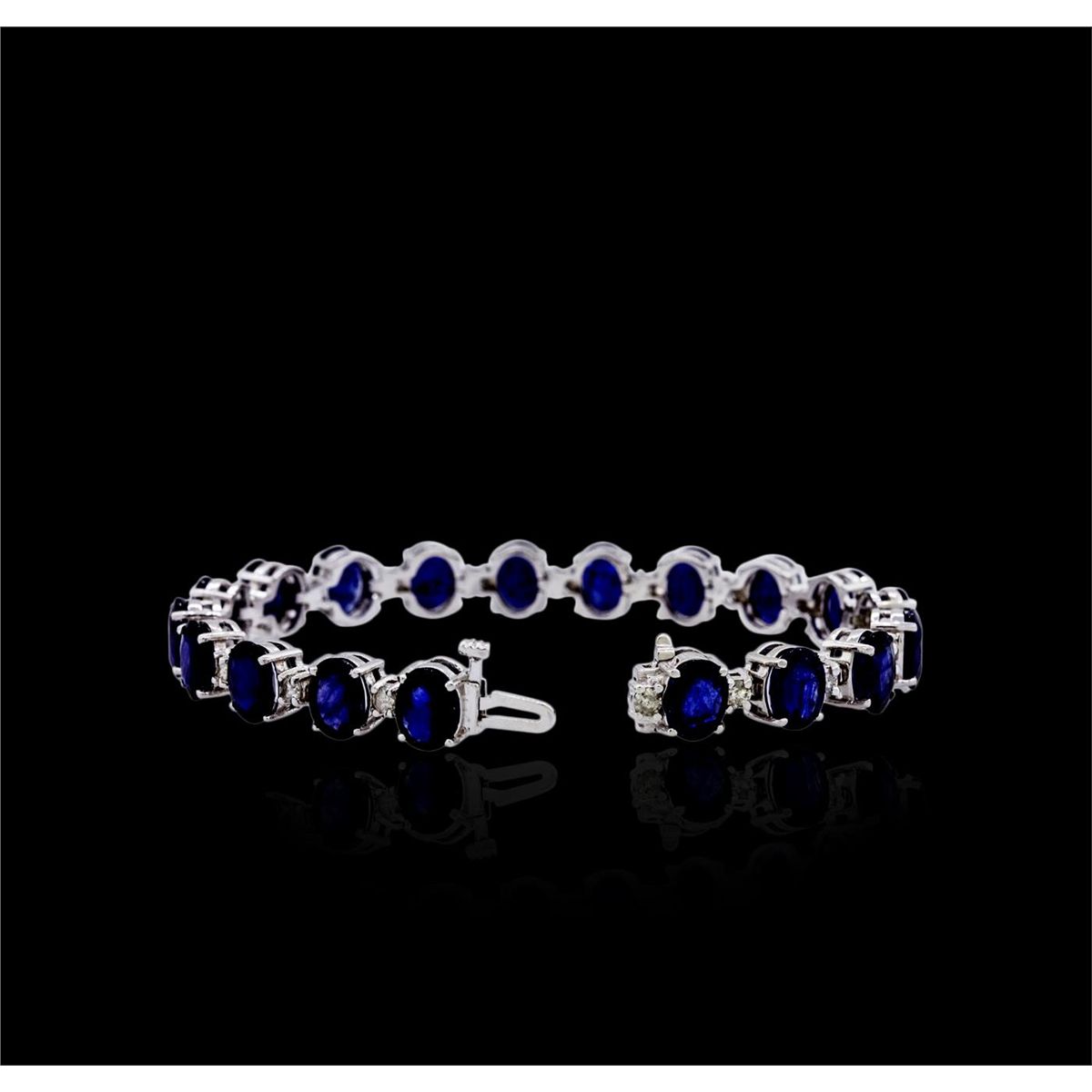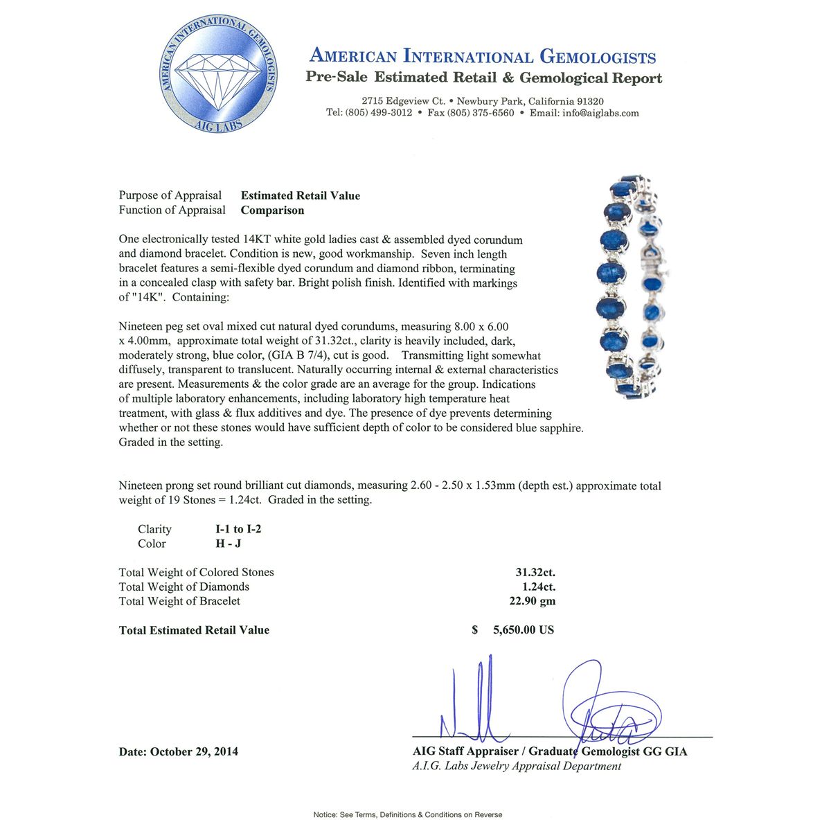 One electronically tested 14KT white gold ladies cast & assembled dyed corundum and diamond bracelet. Seven inch length bracelet features a semi-flexible dyed corundum and diamond ribbon, terminating in a concealed clasp with safety bar. Bright polish finish. Identified with markings of "14K". Condition is new, good workmanship. Containing: Nineteen peg set oval mixed cut natural dyed corundums, measuring 8.00 x 6.00 x 4.00mm, approximate total weight of 31.32ct., clarity is heavily included, dark, moderately strong, blue color, (GIA B 7/4), cut is good. Transmitting light somewhat diffusely, transparent to translucent. Naturally occurring internal & external characteristics are present. Measurements & the color grade are an average for the group. Indications of multiple laboratory enhancements, including laboratory high temperature heat treatment, with glass & flux additives and dye. The presence of dye prevents determining whether or not these stones would have sufficient depth of color to be considered blue sapphire. Graded in the setting. Nineteen prong set round brilliant cut diamonds, measuring 2.60 - 2.50 x 1.53mm (depth est.) approximate total weight of 19 Stones = 1.24ct. Graded in the setting. Clarity: I-1 to I-2. Color: H - J. Total Weight of Colored Stones 31.32ct. Total Weight of Diamonds 1.24ct. Total Weight of Bracelet 22.90 grams. AIG Appraised at $5,650.00.