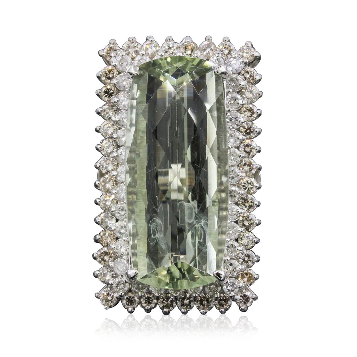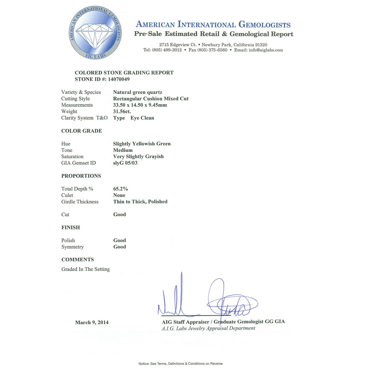 One electronically tested 14KT white gold ladies cast green quartz and diamond ring with a bright polish finish. Condition is new, good workmanship. The featured green quartz is set within two tiered diamond bezels, completed by a three and one-half millimeter wide band. Identified with markings of "K14". Containing: One prong set rectangular cushion mixed cut natural green quartz, measuring 33.50 x 14.50 x 9.45mm, 10%. bulge factor, approximate weight of 31.56ct., clarity is eye clean, medium, very slightly grayish, slightly yellowish green color, (GIA slyG 5/3), cut is good. Transmitting light with no distortion, transparent. Graded in the setting. Forty prong set round brilliant cut diamonds, measuring 2.80 - 2.70 x 1.65mm (depth est.) approximate. Total Weight of 40 Stones = 3.14ct. Color grade is an average for the group. Graded in the setting. Clarity: SI-1 to I-1 Thirty-Six prong set round brilliant cut diamonds, measuring 2.40 - 2.30 x 1.41mm (depth est.) approximate. Total Weight of 36 Stones = 1.81ct. Graded in the setting. Clarity: I-1 to I-2. Color: G - I. Total Weight of Colored Stones 31.56ct. Total Weight of Diamonds 4.95ct. Total Weight of Ring 24.80 grams. AIG Appraised at $14,645.00.