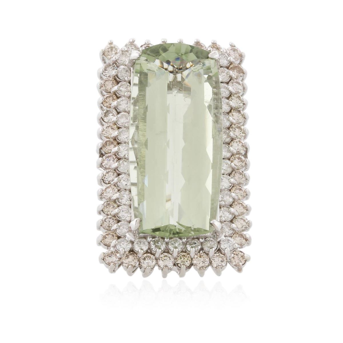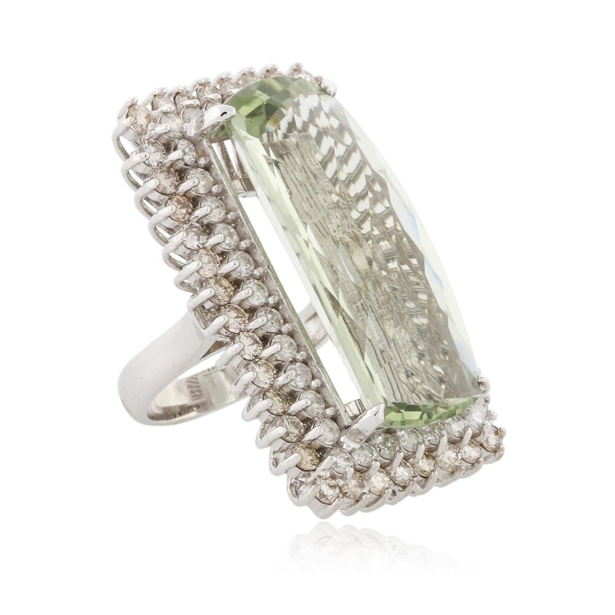 One electronically tested 14KT white gold ladies cast green quartz and diamond ring with a bright polish finish. Condition is new, good workmanship. The featured green quartz is set within two tiered diamond bezels, completed by a three and one-half millimeter wide band. Identified with markings of "K14". Containing: One prong set rectangular cushion mixed cut natural green quartz, measuring 33.50 x 14.50 x 9.45mm, 10%. bulge factor, approximate weight of 31.56ct., clarity is eye clean, medium, very slightly grayish, slightly yellowish green color, (GIA slyG 5/3), cut is good. Transmitting light with no distortion, transparent. Graded in the setting. Forty prong set round brilliant cut diamonds, measuring 2.80 - 2.70 x 1.65mm (depth est.) approximate. Total Weight of 40 Stones = 3.14ct. Color grade is an average for the group. Graded in the setting. Clarity: SI-1 to I-1 Thirty-Six prong set round brilliant cut diamonds, measuring 2.40 - 2.30 x 1.41mm (depth est.) approximate. Total Weight of 36 Stones = 1.81ct. Graded in the setting. Clarity: I-1 to I-2. Color: G - I. Total Weight of Colored Stones 31.56ct. Total Weight of Diamonds 4.95ct. Total Weight of Ring 24.80 grams. AIG Appraised at $14,645.00.