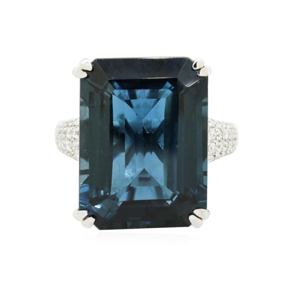 One electronically tested 14KT white gold ladies cast blue topaz and diamond ring with a bright polish finish. The featured blue topaz is supported by a lattice under gallery and diamond set shoulders, completed by a three millimeter wide band. Identified with markings of "14K". Condition is new, good workmanship. Containing: One prong set rectangular step cut natural blue topaz, measuring 20.20 x 15.50 x 9.00mm, 6% bulge factor, approximate weight of 31.63ct., clarity is eye clean, type I, dark, very slightly grayish, greenish blue color, (GIA gB 7/3), cut is good. Transmitting light with no distortion, transparent. Refractive index testing results of 1.61 to 1.62. This is a conclusive result for topaz. Graded in the setting. A deposit of a thin layer has been applied to the topaz to produce the intense color effect. The process utilizes a very high temperature treatment, diffusion of ions into the topaz, plus in some cases neutron bombardment has been used to create the color center. Diffusion processes causes the added ions to become part of the crystal surface with no distinct boundary. Do not put a gem treated in this manner into an ultrasonic cleaner. Sixty prong set round brilliant cut diamonds, measuring 1.60 - 1.40 x 0.90mm (depth est.) approximate total weight of 60 Stones = 0.83ct. Graded in the setting. Clarity: SI-1 to I-1. Color: G - I. Total Weight of Colored Stones 31.63ct. Total Weight of Diamonds 0.83ct. Total Weight of Ring 12.19 grams. AIG Appraised at $4,835.00.