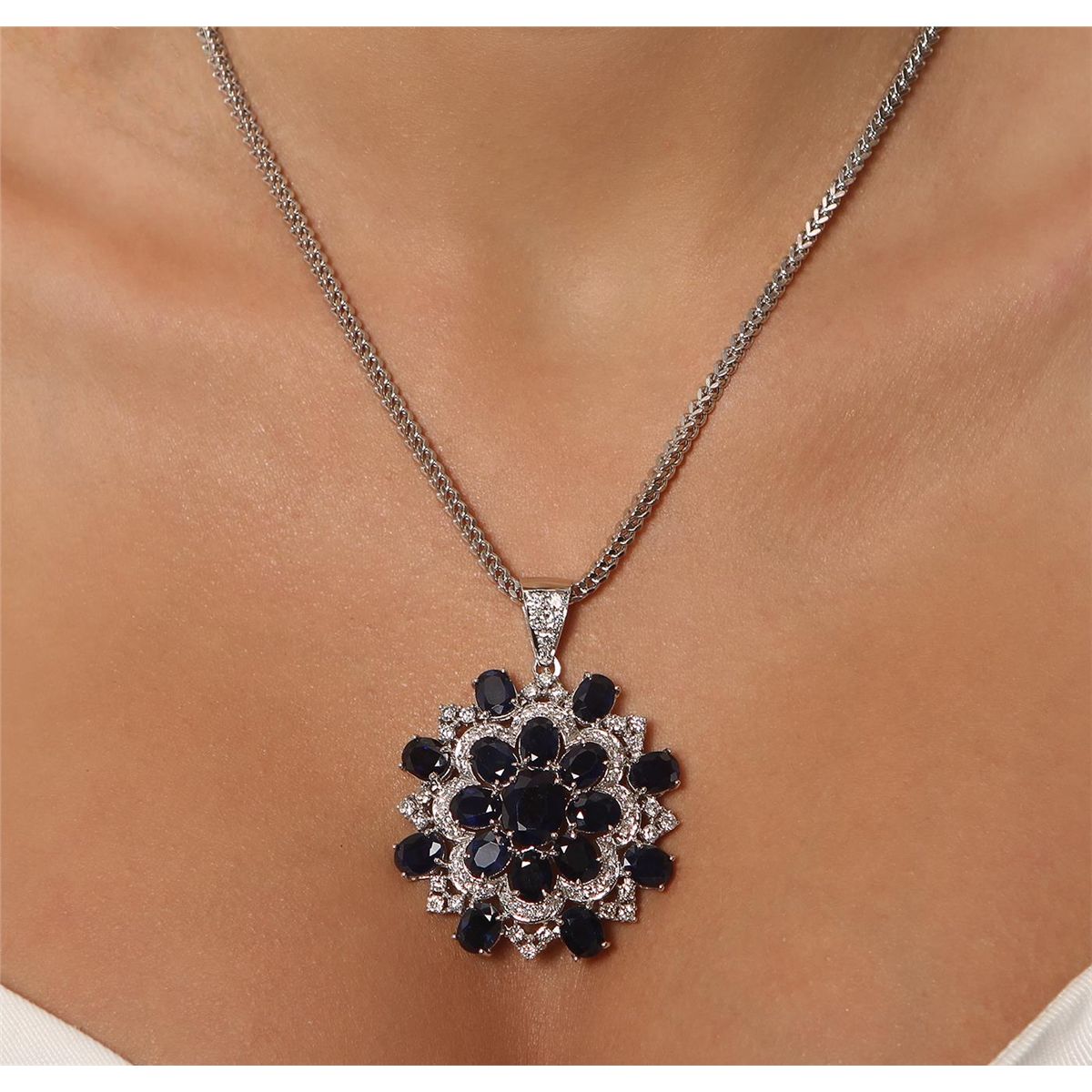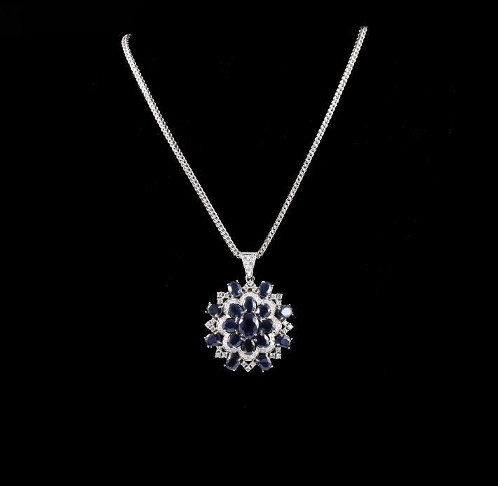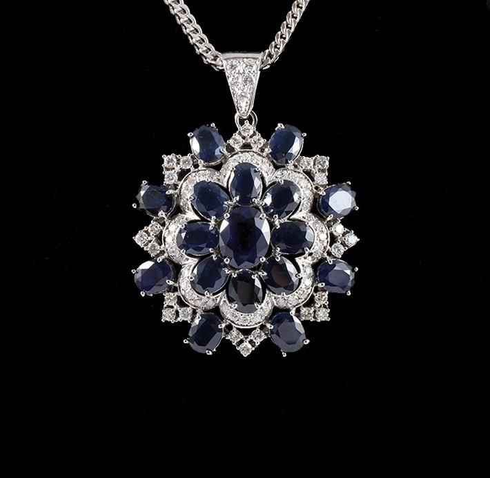 One electronically tested 14KT white gold ladies cast & assembled sapphire and diamond pendant with chain. The pendant features a stylized sapphire and diamond floret, completed by a diamond set bail. The pendant is supported by an eighteen inch length 14KT white gold designer style chain, terminating in a lobster claw clasp. Bright polish finish. Identified with markings of "K14". Containing: One prong set oval mixed cut natural blue sapphire, measuring 12.00 x 9.50 x 6.00mm, approximate weight of 5.55ct., clarity is severely included, type II, dark, very slightly grayish, violetish blue color, (GIA vB 7/3), cut is good. Transmitting light very diffusely, opaque. Naturally occurring internal & external characteristics are present. Graded in the setting. Sixteen prong set oval mixed cut natural blue sapphires, measuring 8.00 x 6.00 x 3.90mm, approximate total weight of 26.79ct., clarity is heavily included, type II, medium, very slightly grayish, violetish blue color, (GIA vB 5/3), cut is good. Transmitting light somewhat diffusely, transparent to translucent. Naturally occurring internal & external characteristics are present, including partial color zoning. Measurements & the color grade are an average for the group. Graded in the setting. Sixty-nine prong and bezel set round brilliant cut diamonds, measuring 2.50 - 2.20 x 1.41mm (depth est.) approximate total weight of 69 Stones = 3.25ct. Graded in the setting. Clarity SI-1 to I-1. Color G - I. Total Weight of Colored Stones 32.34ct. Total Weight of Diamonds 3.25ct. Total Weight of Pendant With Chain 34.06gm. AIG Appraised at $23,710.00.