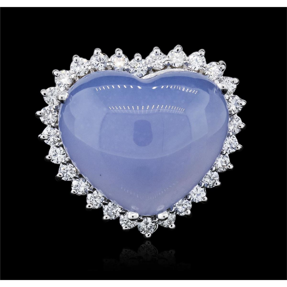 One electronically tested 14KT white gold ladies cast chalcedony and diamond ring with a bright polish finish. Identified with markings of "14K". Condition is new. Containing: One prong set heart cabochon cut natural agate, measuring 29.80 x 16.40 x 9.50mm, approximate weight of 32.59ct., clarity is severely included, medium light, very slightly grayish, violet color, (GIA V 4/3), cut is good. Twenty-Eight prong set round brilliant cut diamonds, measuring 1.80 - 1.80 x 1.08mm (depth est.) approximate total weight of 28 Stones = 0.60ct. Clarity: SI-2. Color: J, Cut is Good. Colored gemstones are presumed to have been subjected to commonly used enhancement processes. All diamonds and colored gemstones are graded in the mounting, unless otherwise stated. Total Weight of Colored Stones 32.59ct. Total Weight of Diamonds 0.60ct. Total Weight of Ring 11.80 grams. GGL Appraised at $4,050.00.