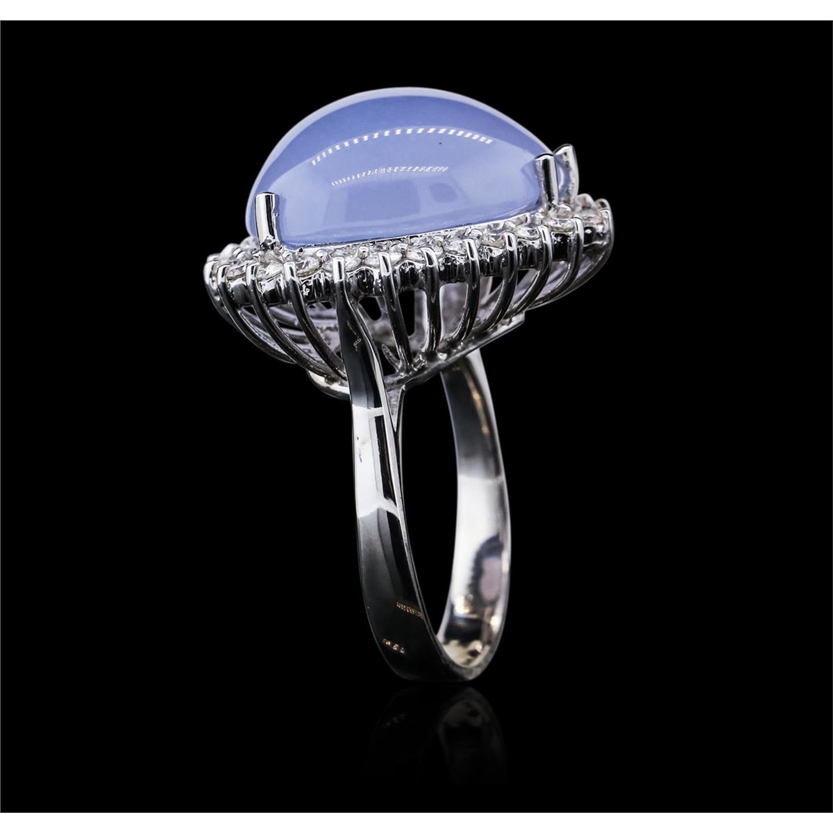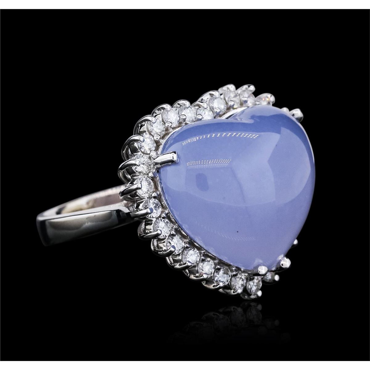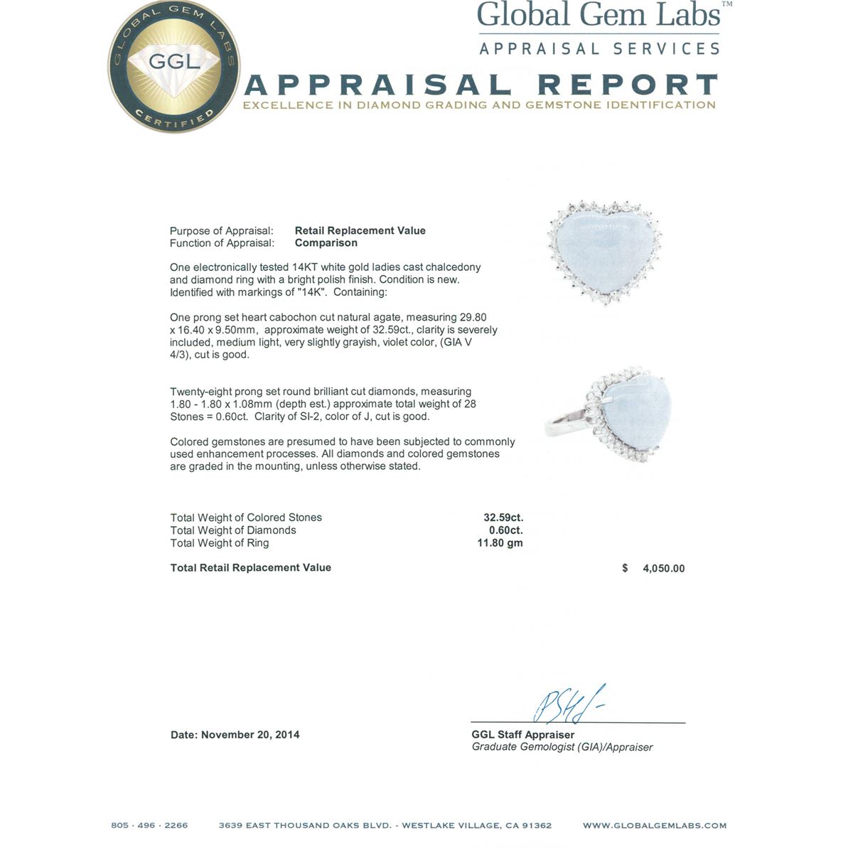 One electronically tested 14KT white gold ladies cast chalcedony and diamond ring with a bright polish finish. Identified with markings of "14K". Condition is new. Containing: One prong set heart cabochon cut natural agate, measuring 29.80 x 16.40 x 9.50mm, approximate weight of 32.59ct., clarity is severely included, medium light, very slightly grayish, violet color, (GIA V 4/3), cut is good. Twenty-Eight prong set round brilliant cut diamonds, measuring 1.80 - 1.80 x 1.08mm (depth est.) approximate total weight of 28 Stones = 0.60ct. Clarity: SI-2. Color: J, Cut is Good. Colored gemstones are presumed to have been subjected to commonly used enhancement processes. All diamonds and colored gemstones are graded in the mounting, unless otherwise stated. Total Weight of Colored Stones 32.59ct. Total Weight of Diamonds 0.60ct. Total Weight of Ring 11.80 grams. GGL Appraised at $4,050.00.