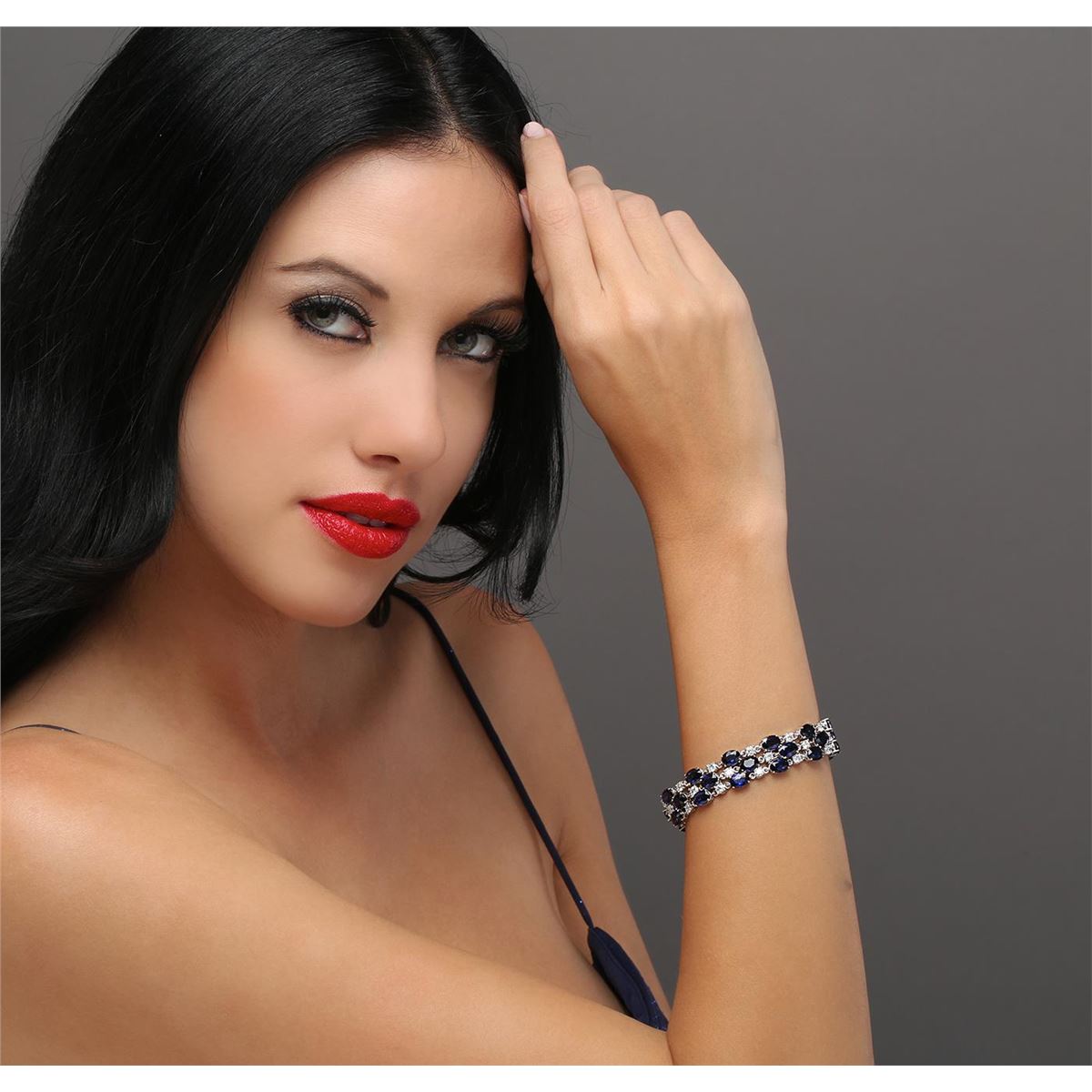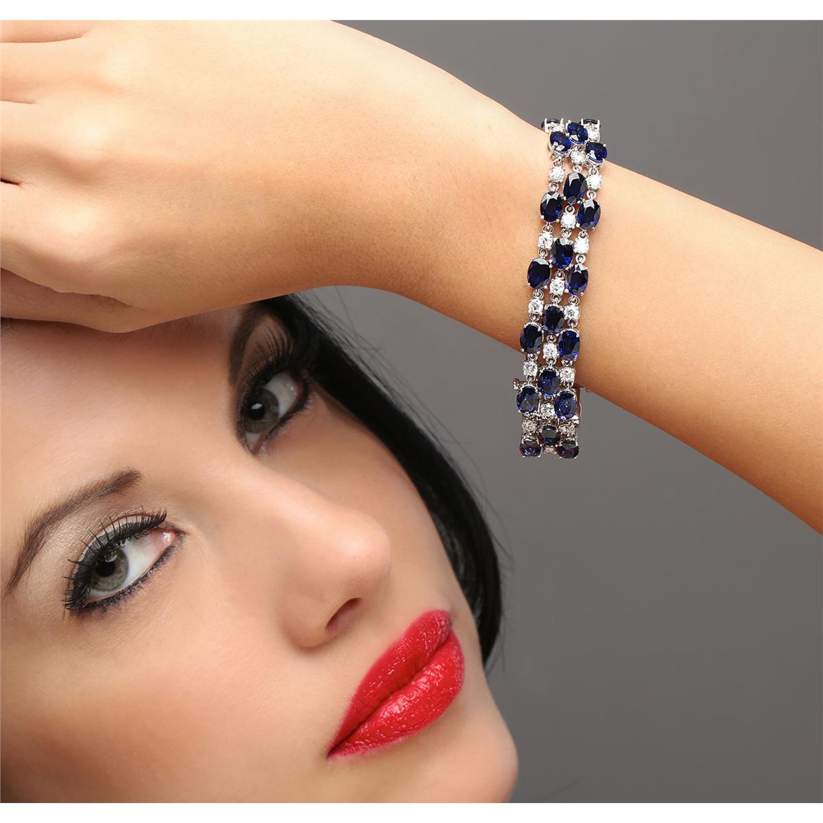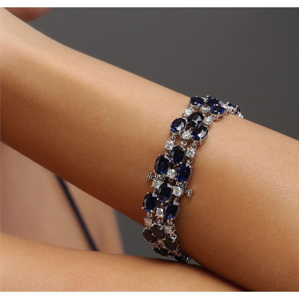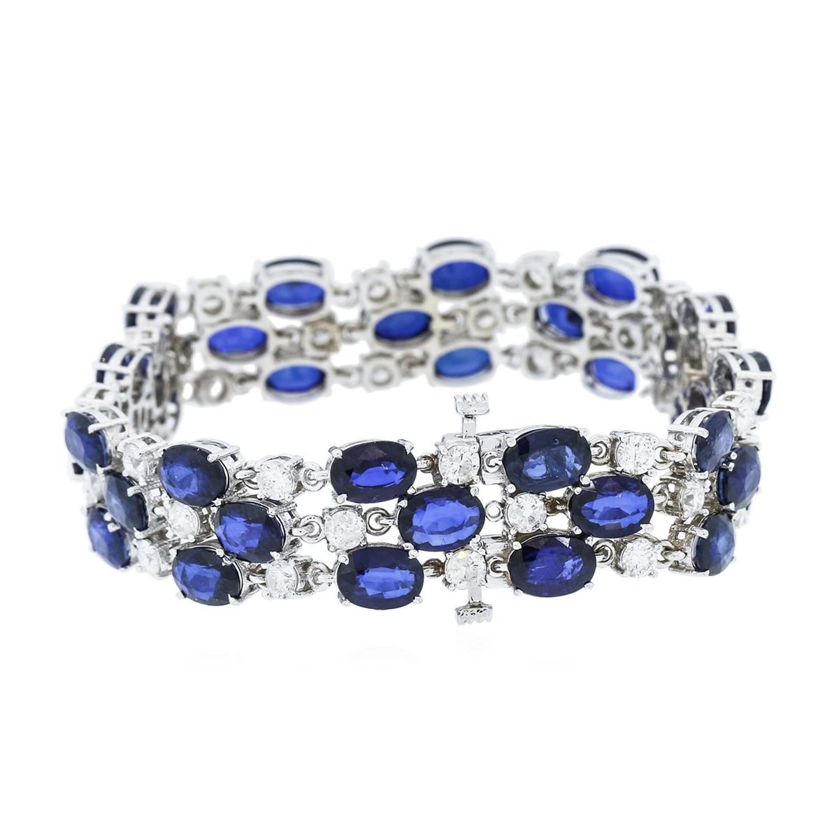 One electronically tested 14KT white gold ladies cast sapphire and diamond bracelet with a hidden box clasp with a bright polish finish. Measurements: 7" in length. Condition is new. Containing: Thirty-six prong set oval modified brilliant cut natural blue sapphires, measuring 6.80 x 5.00 x 3.25mm, approximate total weight of 33.48ct., clarity is slightly included, type II, medium dark, moderately strong, blue color, (GIA B 6/4), cut is good. Thirty-Six prong set round brilliant cut diamonds, measuring 3.00 - 3.00 x 1.80mm (depth est.) approximate total weight of 36 Stones = 3.56ct. Clarity: SI-2 to I-1. Color: I - J, Cut is Good. Colored gemstones are presumed to have been subjected to commonly used enhancement processes. All diamonds and colored gemstones are graded in the mounting, unless otherwise stated. Total Weight of Colored Stones 33.48ct. Total Weight of Diamonds 3.56ct. Total Weight of Bracelet 25.70 grams. GGL Appraised at $15,665.00.