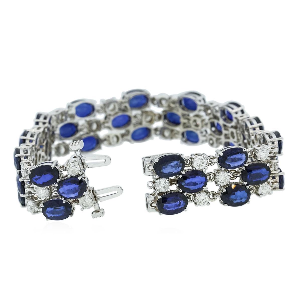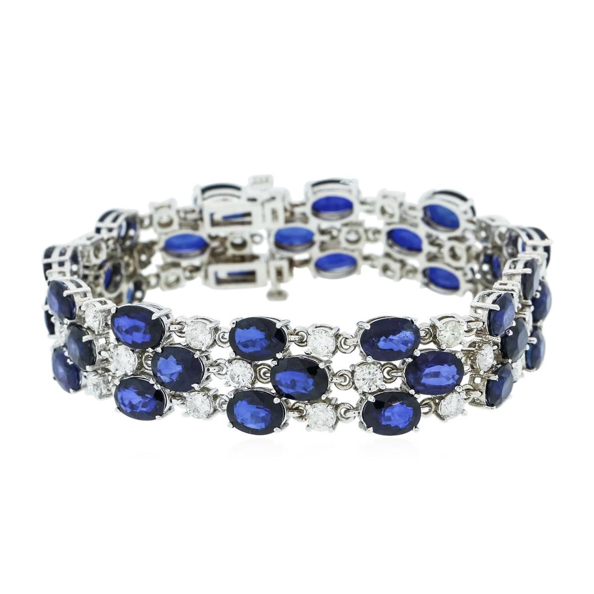 One electronically tested 14KT white gold ladies cast sapphire and diamond bracelet with a hidden box clasp with a bright polish finish. Measurements: 7" in length. Condition is new. Containing: Thirty-six prong set oval modified brilliant cut natural blue sapphires, measuring 6.80 x 5.00 x 3.25mm, approximate total weight of 33.48ct., clarity is slightly included, type II, medium dark, moderately strong, blue color, (GIA B 6/4), cut is good. Thirty-Six prong set round brilliant cut diamonds, measuring 3.00 - 3.00 x 1.80mm (depth est.) approximate total weight of 36 Stones = 3.56ct. Clarity: SI-2 to I-1. Color: I - J, Cut is Good. Colored gemstones are presumed to have been subjected to commonly used enhancement processes. All diamonds and colored gemstones are graded in the mounting, unless otherwise stated. Total Weight of Colored Stones 33.48ct. Total Weight of Diamonds 3.56ct. Total Weight of Bracelet 25.70 grams. GGL Appraised at $15,665.00.