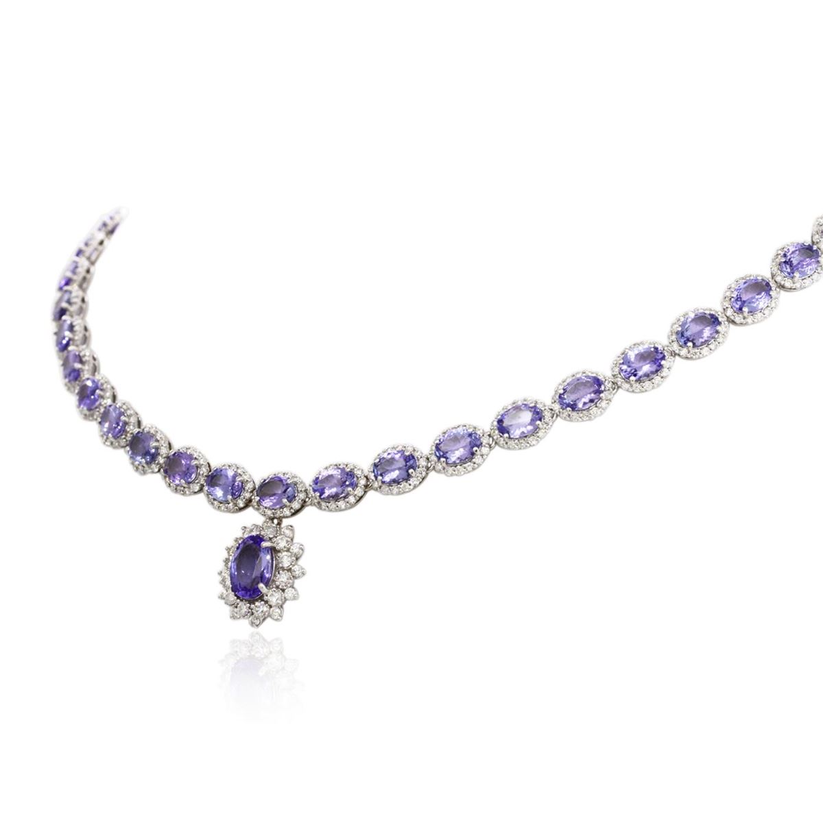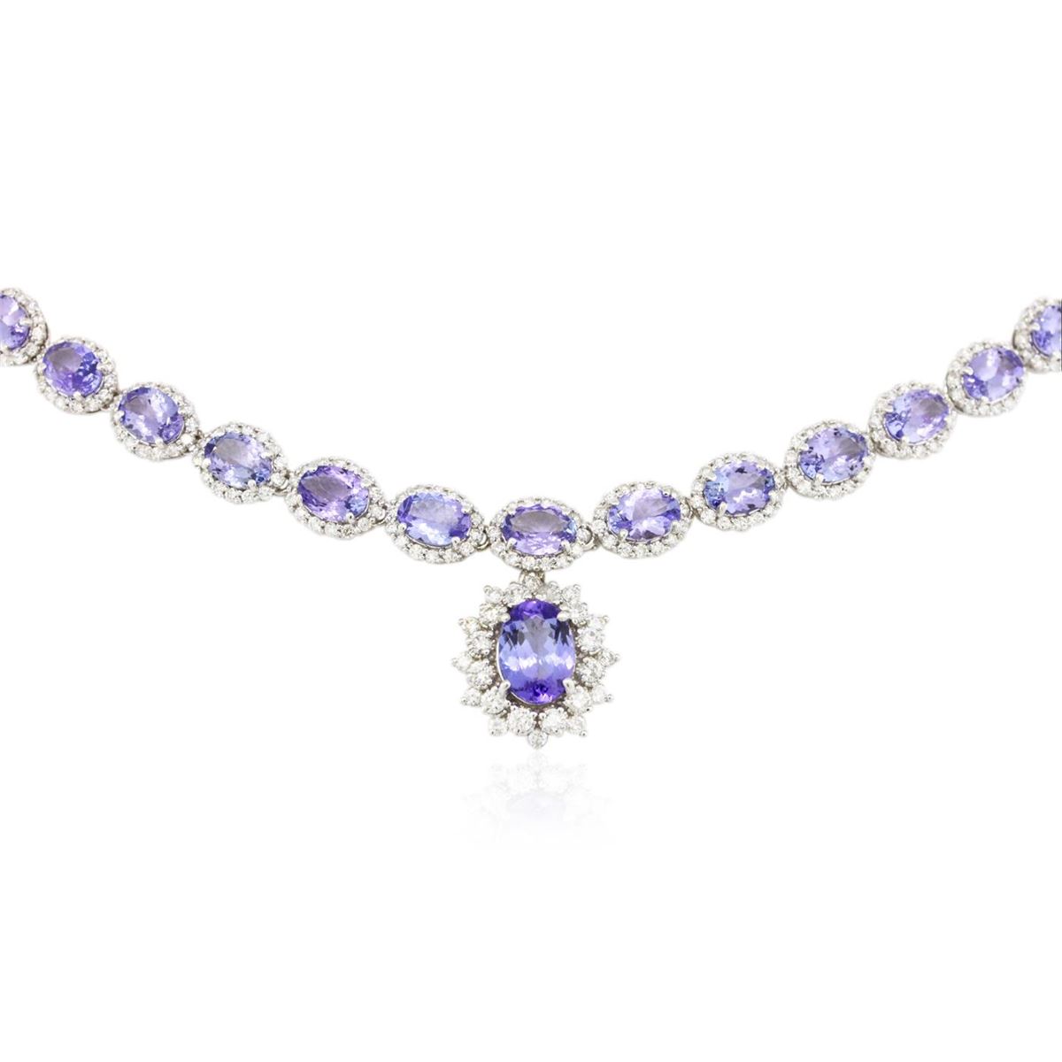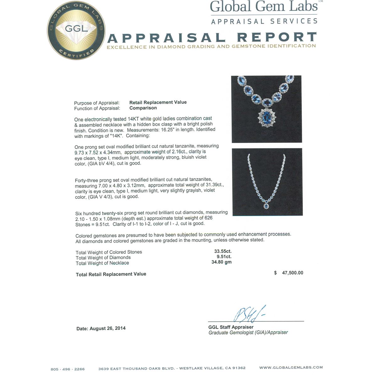 One electronically tested 14KT white gold ladies combination cast & assembled necklace with a hidden box clasp with a bright polish finish. Measurements: 16.25" in length. Identified with markings of "14K". Condition is new. Containing: One prong set oval modified brilliant cut natural tanzanite, measuring 9.73 x 7.52 x 4.34mm, approximate weight of 2.16ct., clarity is eye clean, type I, medium light, moderately strong, bluish violet color, (GIA bV 4/4), cut is good. Forty-three prong set oval modified brilliant cut natural tanzanites, measuring 7.00 x 4.80 x 3.12mm, approximate total weight of 31.39ct., clarity is eye clean, type I, medium light, very slightly grayish, violet color, (GIA V 4/3), cut is good. Six Hundred Twenty-Six prong set round brilliant cut diamonds, measuring 2.10 - 1.50 x 1.08mm (depth est.) approximate total weight of 626 Stones = 9.51ct. Clarity: I-1 to I-2. Color: I - J, Cut is Good. Colored gemstones are presumed to have been subjected to commonly used enhancement processes. All diamonds and colored gemstones are graded in the mounting, unless otherwise stated. Total Weight of Colored Stones 33.55ct. Total Weight of Diamonds 9.51ct. Total Weight of Necklace 34.80 grams. GGL Appraised at $47,500.00.