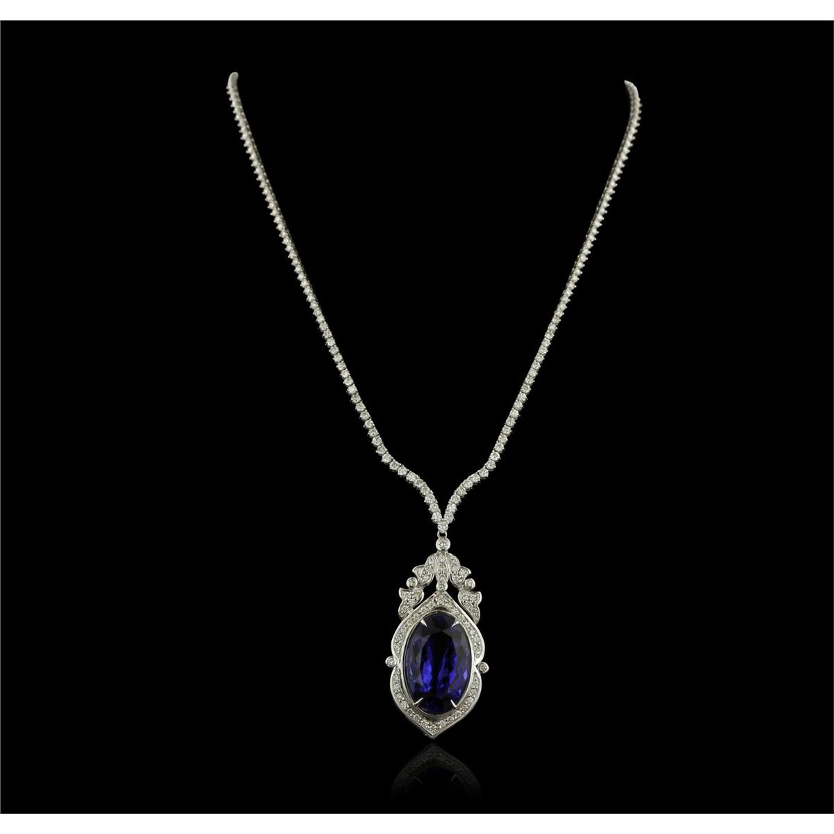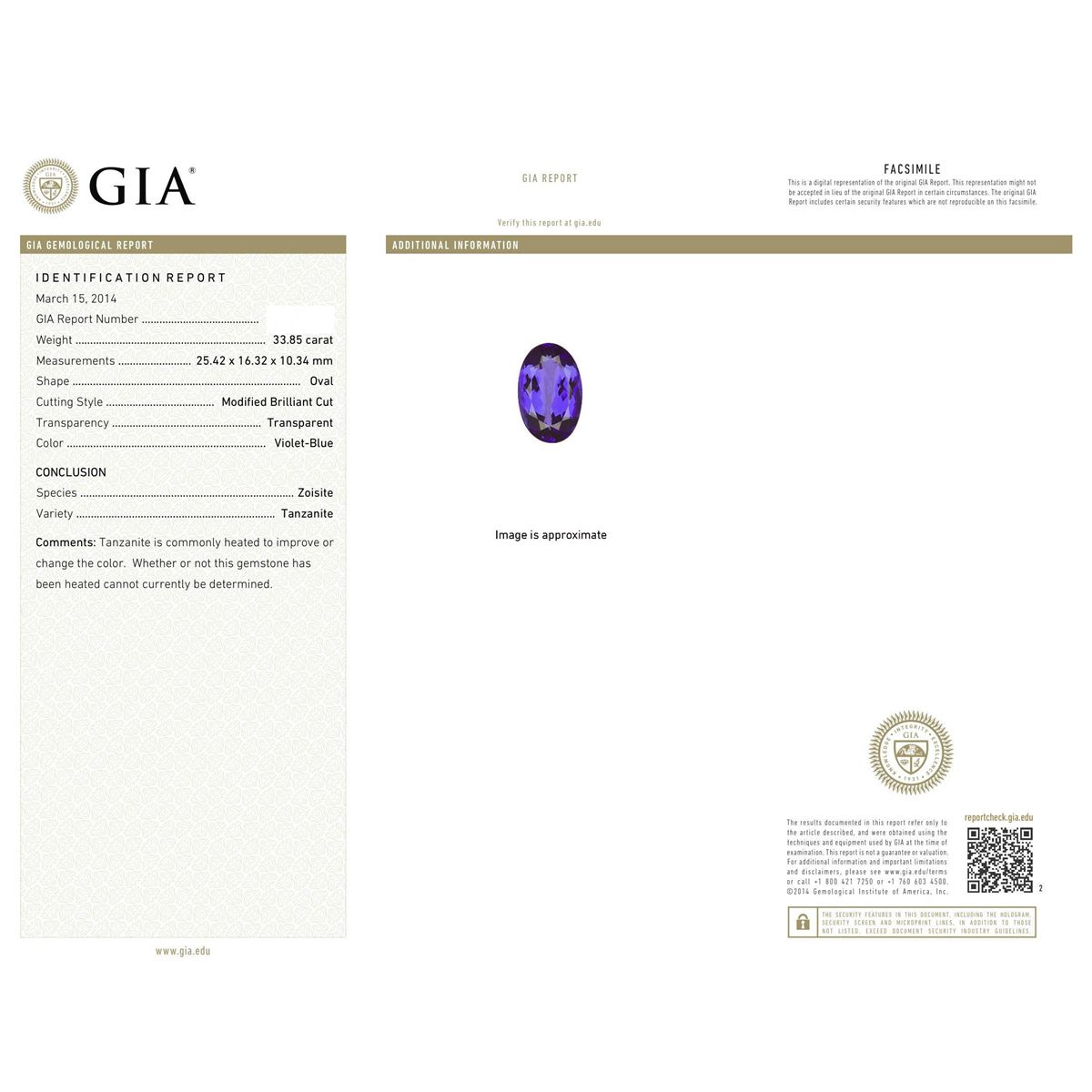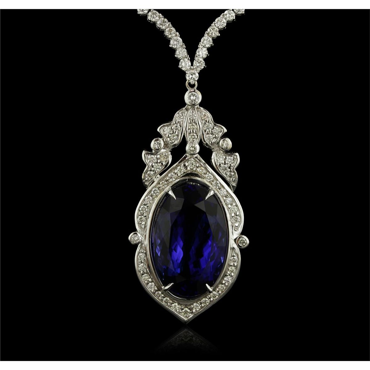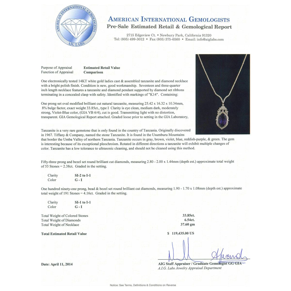 One electronically tested 14KT white gold ladies cast & assembled tanzanite and diamond necklace with a bright polish finish. Condition is new, good workmanship. Seventeen and three-quarter inch length necklace features a tanzanite and diamond pendant supported by diamond set ribbons terminating in a concealed clasp with safety. Identified with markings of "K14". Containing: One prong set oval modified brilliant cut natural tanzanite, measuring 25.42 x 16.32 x 10.34mm, 8%. bulge factor, exact weight 33.85ct., type I Clarity is eye clean, medium dark, moderately strong, Violet-Blue color, (GIA VB 6/4), cut is good. Transmitting light with no distortion, transparent. GIA Gemological Report attached. Graded loose prior to setting in the GIA Laboratory, Report #6157953503.Tanzanite is a very rare gemstone that is only found in the country of Tanzania. Originally discovered in 1967. Tiffany & Company, named the stone Tanzanite. It is found in the Usumburu Mountains that border the Umba Valley of northern Tanzania. Tanzanite occurs in gray, brown, violet, blue, reddish-purple, & green. The gem is interesting because of its exceptional pleochroism. Rotated in different directions a tanzanite will exhibit multiple changes of color. Tanzanite has a low tolerance to ultrasonic cleaning, and should not be cleaned using this method. Fifty-Three prong and bezel set round brilliant cut diamonds, measuring 2.80 - 2.00 x 1.44mm (depth est.) approximate. Total Weight of 53 Stones = 2.38ct. Graded in the setting. Clarity: SI-2 to I-1. Color: G - I One Hundred Ninety-One prong, bead & bezel set round brilliant cut diamonds, measuring 1.90 - 1.70 x 1.08mm (depth est.) approximate. Total Weight of 191 Stones = 4.16ct. Graded in the setting. Clarity: SI-1 to I-1. Color: G - I. Total Weight of Colored Stones 33.85ct. Total Weight of Diamonds 6.54ct. Total Weight of Necklace 37.60 grams. AIGAppraised at $119,435.00.