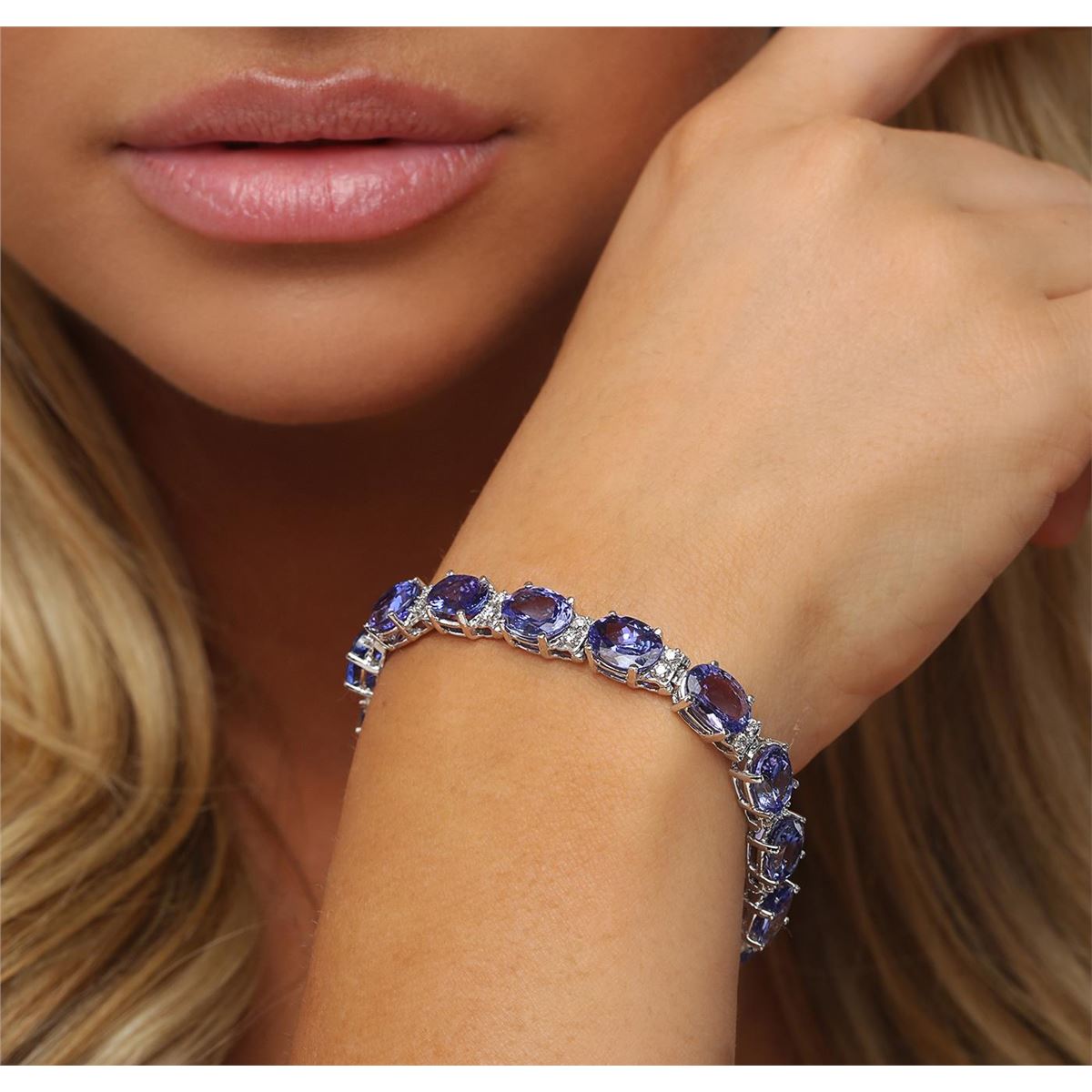 One electronically tested 14KT white gold ladies cast & assembled tanzanite and diamond bracelet with a bright polish finish. Seven and one-quarter inch length bracelet features a flexible tanzanite and diamond duo ribbon, terminating in a concealed clasp with safety. Identified with markings of 14K. Condition is new, good workmanship. Containing: Fifteen prong set oval mixed cut natural tanzanites, measuring 9.75 x 6.90 x 4.90mm, approximate total weight of 34.30ct., clarity is eye clean, type I, medium dark, very slightly grayish, bluish violet color, (GIA bV 6/3), cut is good. Transmitting light with no distortion, transparent. Measurements & the color grade are an average for the group. Graded in the setting. Tanzanite is a very rare gemstone that is only found in the country of Tanzania. Originally discovered in 1967. Tiffany & Company, named the stone Tanzanite. It is found in the Usumburu Mountains that border the Umba Valley of northern Tanzania. Tanzanite occurs in gray, brown, violet, blue, reddish-purple, & green. The gem is interesting because of its exceptional pleochroism. Rotated in different directions a tanzanite will exhibit multiple changes of color. Tanzanite has a low tolerance to ultrasonic cleaning, and should not be cleaned using this method. Thirty prong set round brilliant cut diamonds, measuring 1.70 - 1.60 x 0.99mm (depth est.) approximate total weight of 30 Stones = 0.59ct. Graded in the setting. Clarity: SI-1 to I-1. Color: G - I. Total Weight of Colored Stones 34.30ct. Total Weight of Diamonds 0.59ct. Total Weight of Bracelet 20.85 grams. AIG Appraised at $27,445.00.
