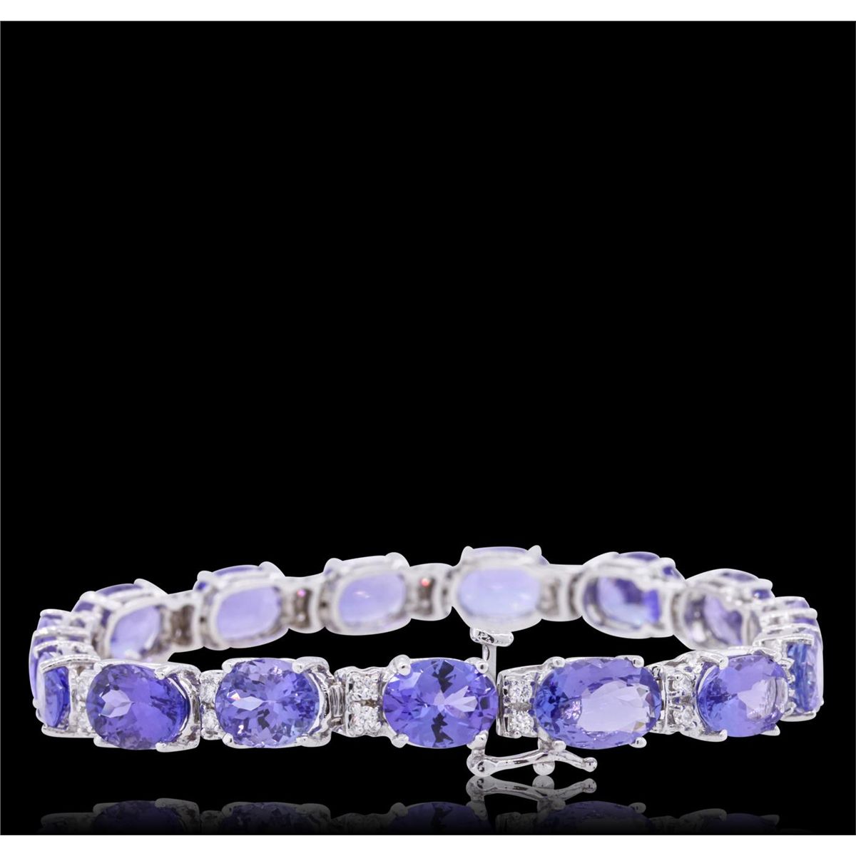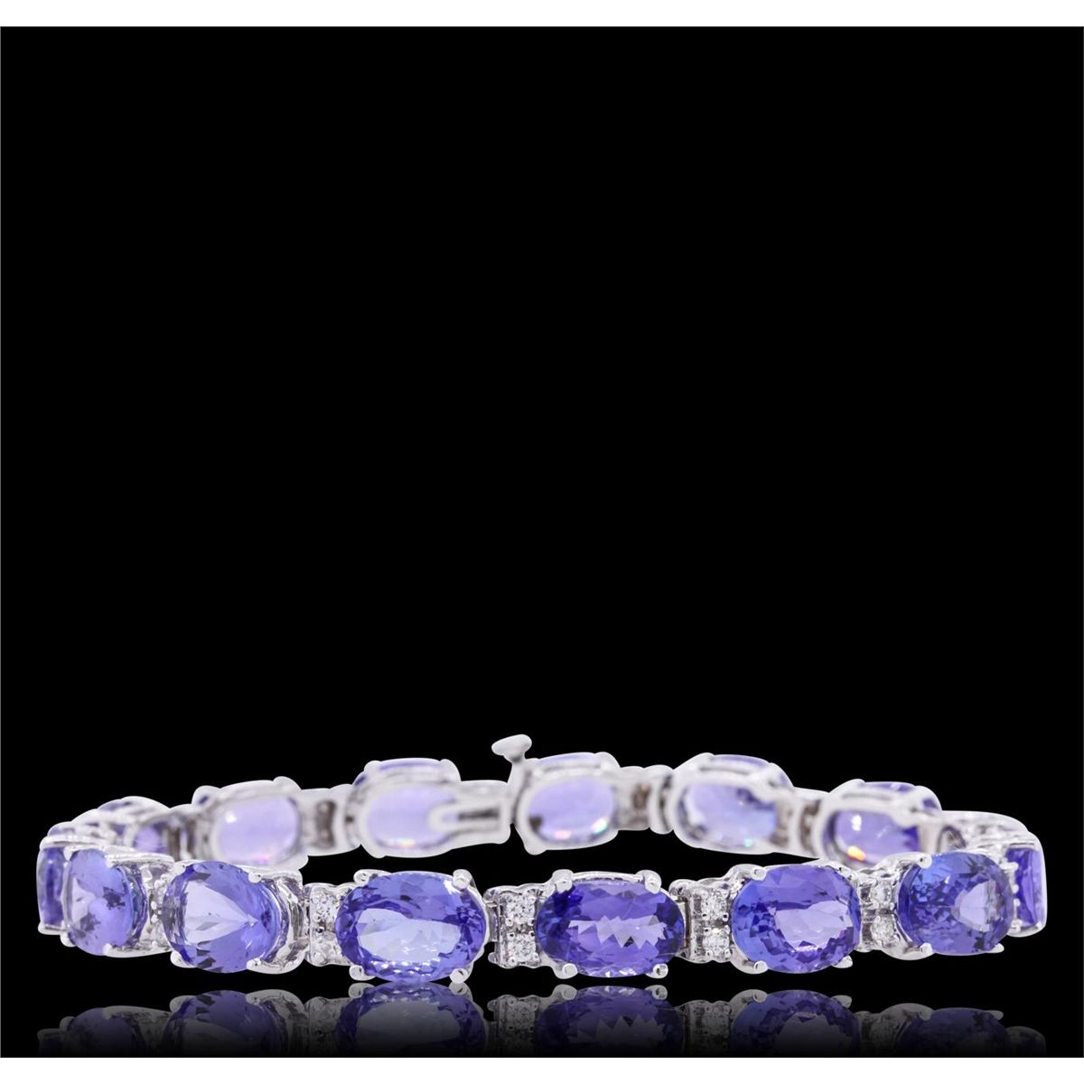 One electronically tested 14KT white gold ladies cast & assembled tanzanite and diamond bracelet with a bright polish finish. Seven and one-quarter inch length bracelet features a flexible tanzanite and diamond duo ribbon, terminating in a concealed clasp with safety. Identified with markings of 14K. Condition is new, good workmanship. Containing: Fifteen prong set oval mixed cut natural tanzanites, measuring 9.75 x 6.90 x 4.90mm, approximate total weight of 34.30ct., clarity is eye clean, type I, medium dark, very slightly grayish, bluish violet color, (GIA bV 6/3), cut is good. Transmitting light with no distortion, transparent. Measurements & the color grade are an average for the group. Graded in the setting. Tanzanite is a very rare gemstone that is only found in the country of Tanzania. Originally discovered in 1967. Tiffany & Company, named the stone Tanzanite. It is found in the Usumburu Mountains that border the Umba Valley of northern Tanzania. Tanzanite occurs in gray, brown, violet, blue, reddish-purple, & green. The gem is interesting because of its exceptional pleochroism. Rotated in different directions a tanzanite will exhibit multiple changes of color. Tanzanite has a low tolerance to ultrasonic cleaning, and should not be cleaned using this method. Thirty prong set round brilliant cut diamonds, measuring 1.70 - 1.60 x 0.99mm (depth est.) approximate total weight of 30 Stones = 0.59ct. Graded in the setting. Clarity: SI-1 to I-1. Color: G - I. Total Weight of Colored Stones 34.30ct. Total Weight of Diamonds 0.59ct. Total Weight of Bracelet 20.85 grams. AIG Appraised at $27,445.00.