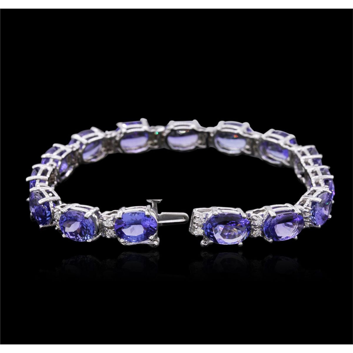 One electronically tested 14KT white gold ladies cast & assembled tanzanite and diamond bracelet with a bright polish finish. Seven and one-quarter inch length bracelet features a flexible tanzanite and diamond duo ribbon, terminating in a concealed clasp with safety. Identified with markings of 14K. Condition is new, good workmanship. Containing: Fifteen prong set oval mixed cut natural tanzanites, measuring 9.75 x 6.90 x 4.90mm, approximate total weight of 34.30ct., clarity is eye clean, type I, medium dark, very slightly grayish, bluish violet color, (GIA bV 6/3), cut is good. Transmitting light with no distortion, transparent. Measurements & the color grade are an average for the group. Graded in the setting. Tanzanite is a very rare gemstone that is only found in the country of Tanzania. Originally discovered in 1967. Tiffany & Company, named the stone Tanzanite. It is found in the Usumburu Mountains that border the Umba Valley of northern Tanzania. Tanzanite occurs in gray, brown, violet, blue, reddish-purple, & green. The gem is interesting because of its exceptional pleochroism. Rotated in different directions a tanzanite will exhibit multiple changes of color. Tanzanite has a low tolerance to ultrasonic cleaning, and should not be cleaned using this method. Thirty prong set round brilliant cut diamonds, measuring 1.70 - 1.60 x 0.99mm (depth est.) approximate total weight of 30 Stones = 0.59ct. Graded in the setting. Clarity: SI-1 to I-1. Color: G - I. Total Weight of Colored Stones 34.30ct. Total Weight of Diamonds 0.59ct. Total Weight of Bracelet 20.85 grams. AIG Appraised at $27,445.00.
