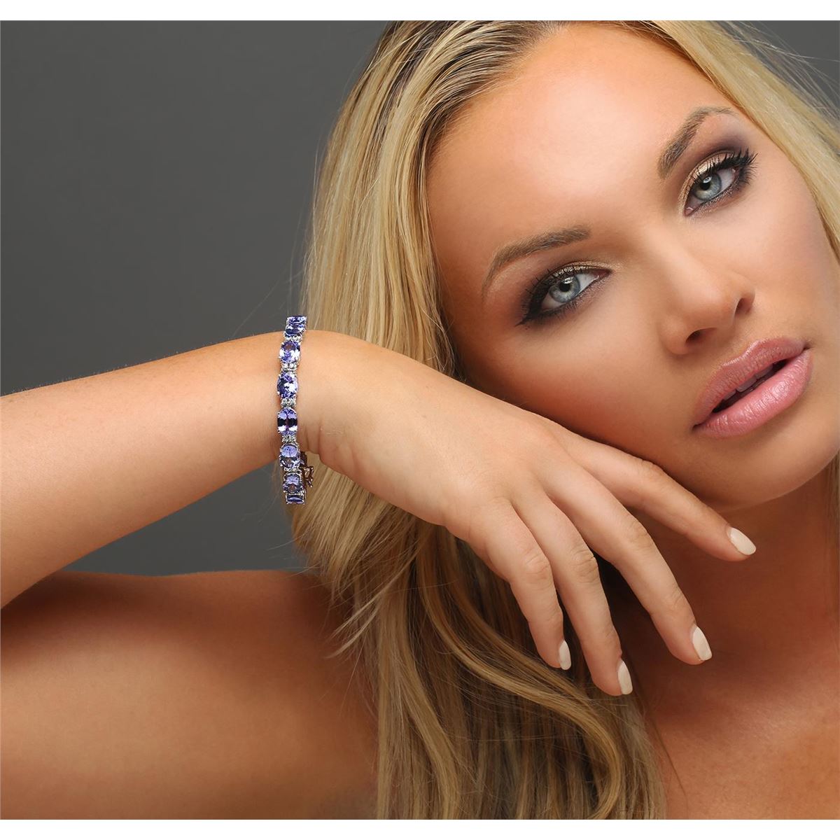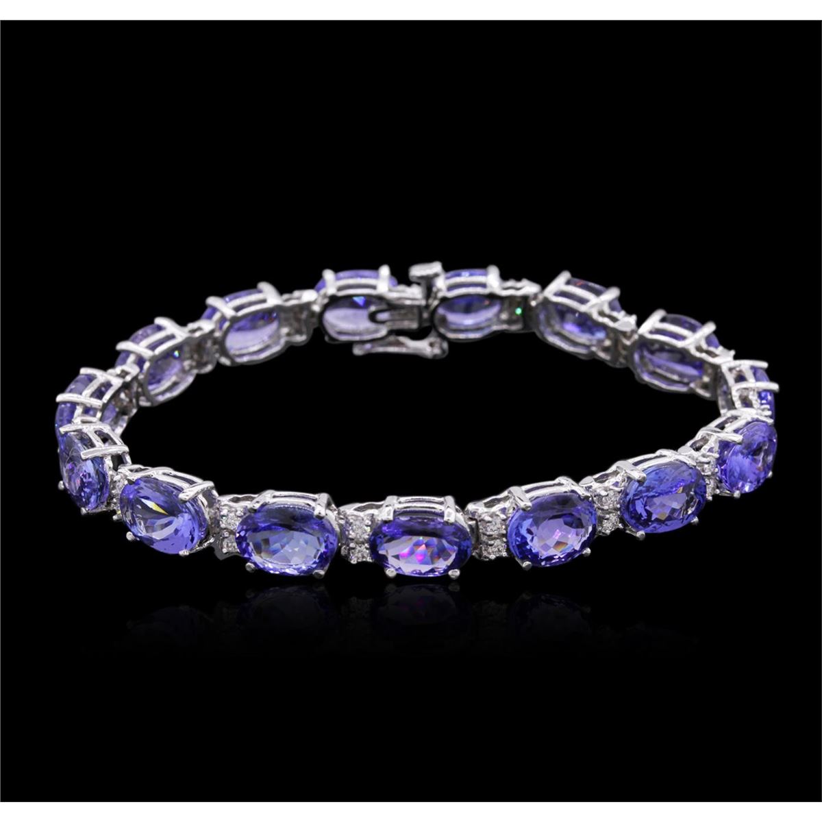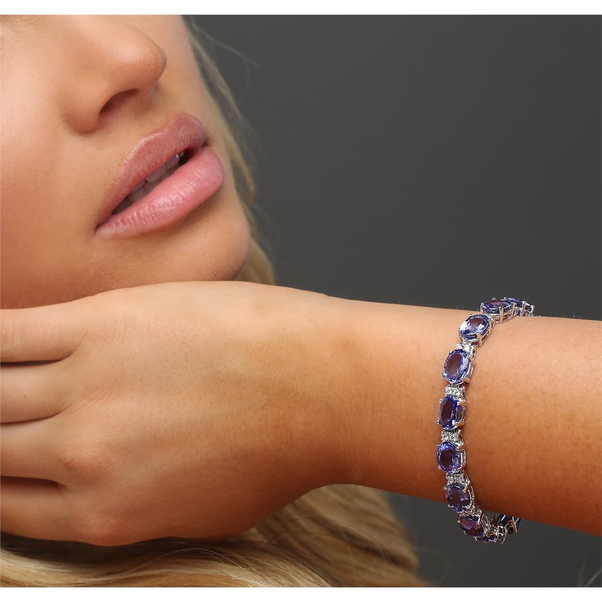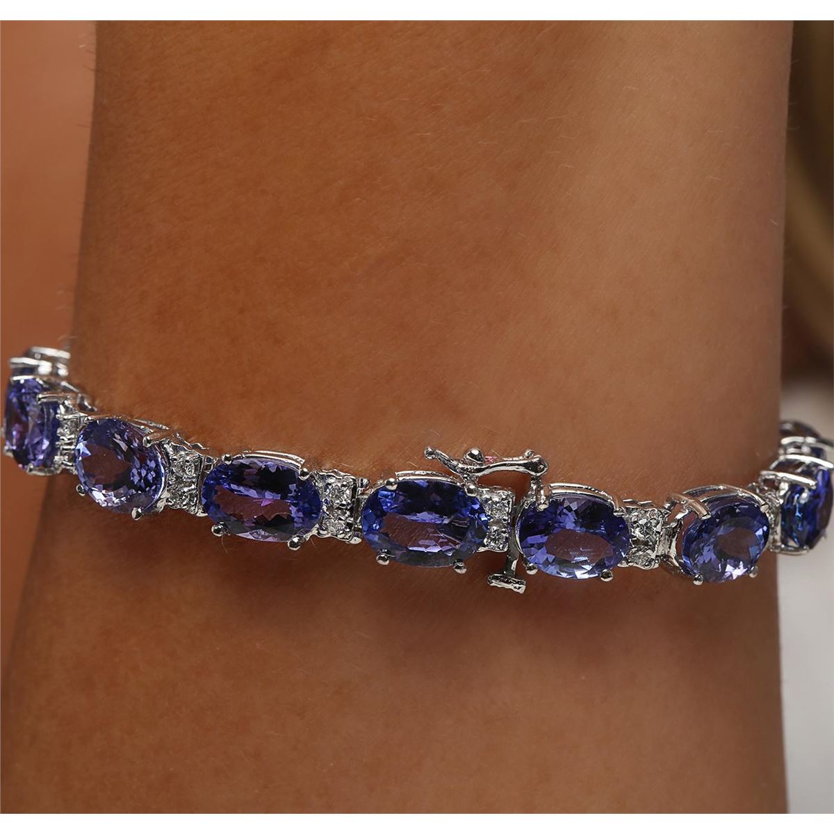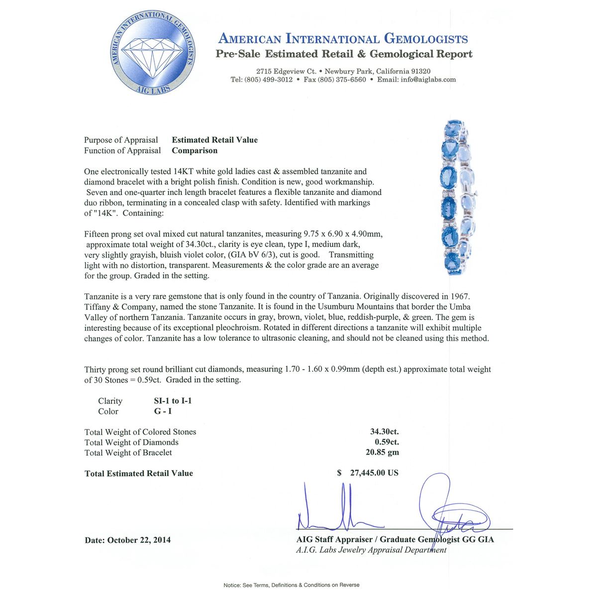 One electronically tested 14KT white gold ladies cast & assembled tanzanite and diamond bracelet with a bright polish finish. Seven and one-quarter inch length bracelet features a flexible tanzanite and diamond duo ribbon, terminating in a concealed clasp with safety. Identified with markings of 14K. Condition is new, good workmanship. Containing: Fifteen prong set oval mixed cut natural tanzanites, measuring 9.75 x 6.90 x 4.90mm, approximate total weight of 34.30ct., clarity is eye clean, type I, medium dark, very slightly grayish, bluish violet color, (GIA bV 6/3), cut is good. Transmitting light with no distortion, transparent. Measurements & the color grade are an average for the group. Graded in the setting. Tanzanite is a very rare gemstone that is only found in the country of Tanzania. Originally discovered in 1967. Tiffany & Company, named the stone Tanzanite. It is found in the Usumburu Mountains that border the Umba Valley of northern Tanzania. Tanzanite occurs in gray, brown, violet, blue, reddish-purple, & green. The gem is interesting because of its exceptional pleochroism. Rotated in different directions a tanzanite will exhibit multiple changes of color. Tanzanite has a low tolerance to ultrasonic cleaning, and should not be cleaned using this method. Thirty prong set round brilliant cut diamonds, measuring 1.70 - 1.60 x 0.99mm (depth est.) approximate total weight of 30 Stones = 0.59ct. Graded in the setting. Clarity: SI-1 to I-1. Color: G - I. Total Weight of Colored Stones 34.30ct. Total Weight of Diamonds 0.59ct. Total Weight of Bracelet 20.85 grams. AIG Appraised at $27,445.00.