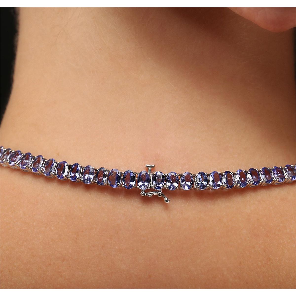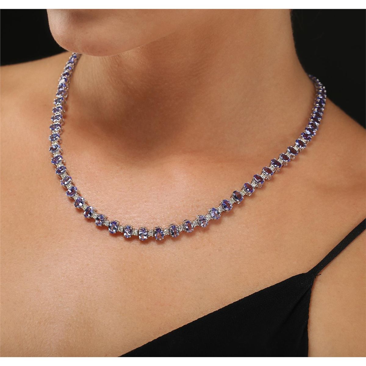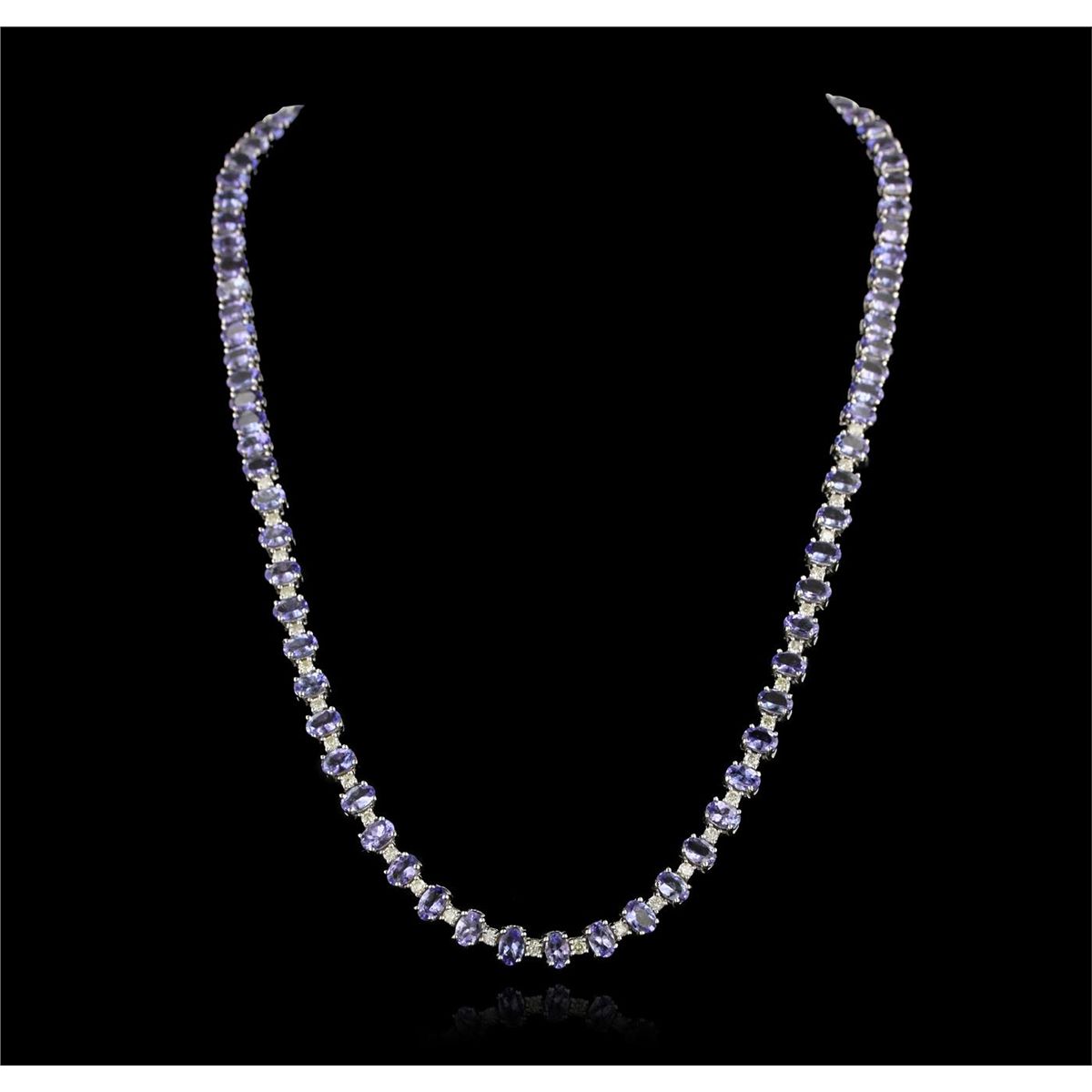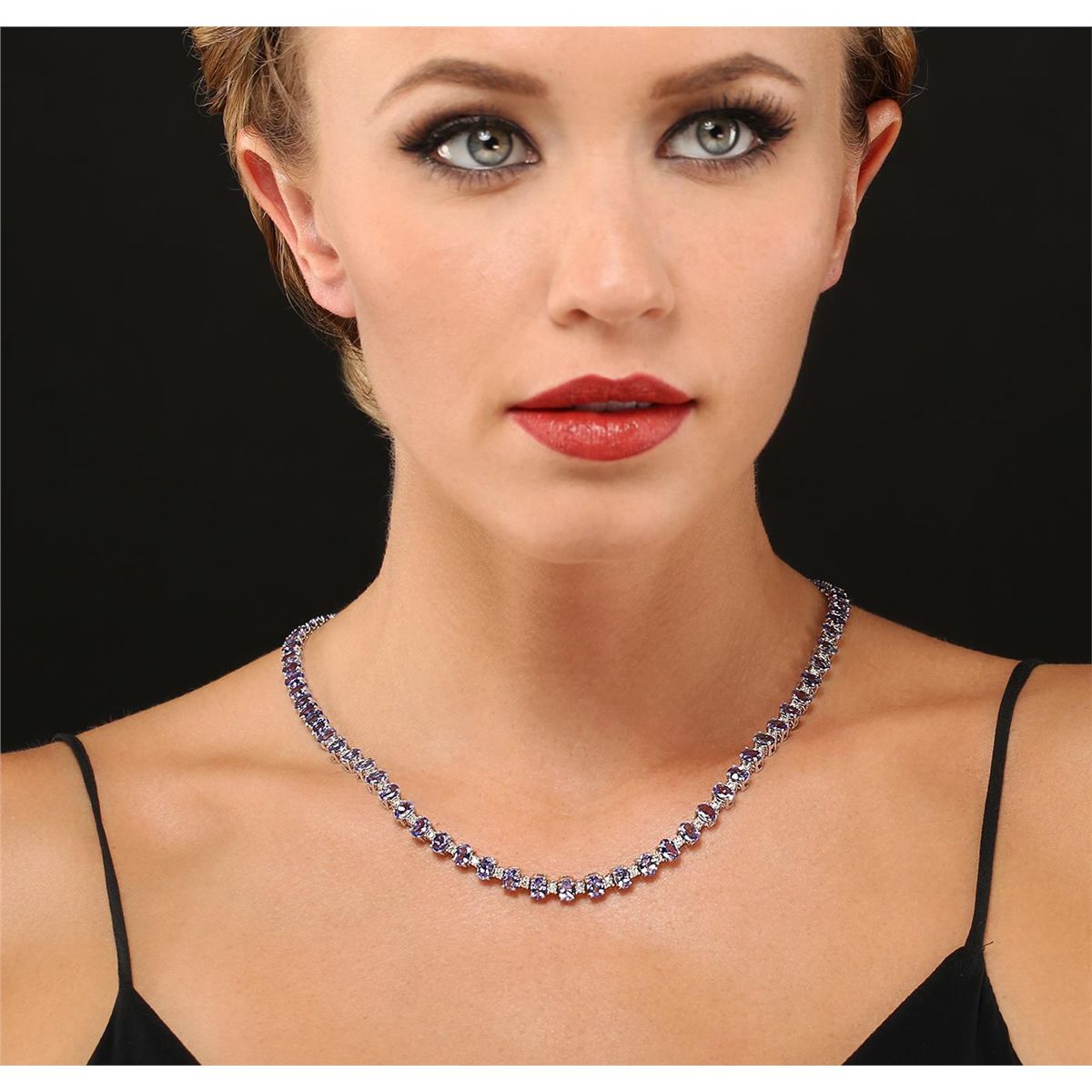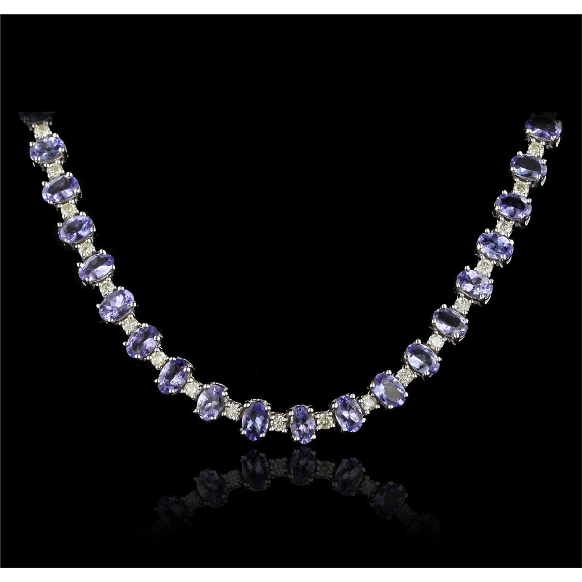 One electronically tested 14KT white gold Ladies combination cast & assembled necklace with a hidden box clasp with a bright polish finish. Identified with markings of "14K". Condition is excellent. Containing: Eighty prong set oval modified brilliant cut natural tanzanites, measuring 6.50 x 4.20 x 2.50mm, approximate total weight of 34.63ct., clarity is eye clean, type I, medium light, very slightly grayish, violet color, (GIA V 4/3), cut is good. Colored gemstones are presumed to have been subjected to commonly used and possible undetectable color/clarity enhancement processes. Thirty-One prong set round brilliant cut diamonds, measuring 2.50 - 2.50 x 1.50mm (depth est.) approximate total weight of 31 Stones = 1.91ct. Clarity of SI-2 to I-2, Color of I - K, Cut is Good. Total Weight of Colored Stones 34.63ct. Total Weight of Diamonds 1.91ct. Total Weight of Necklace 37.30gm. GGL Appraised at $28,660.00.
