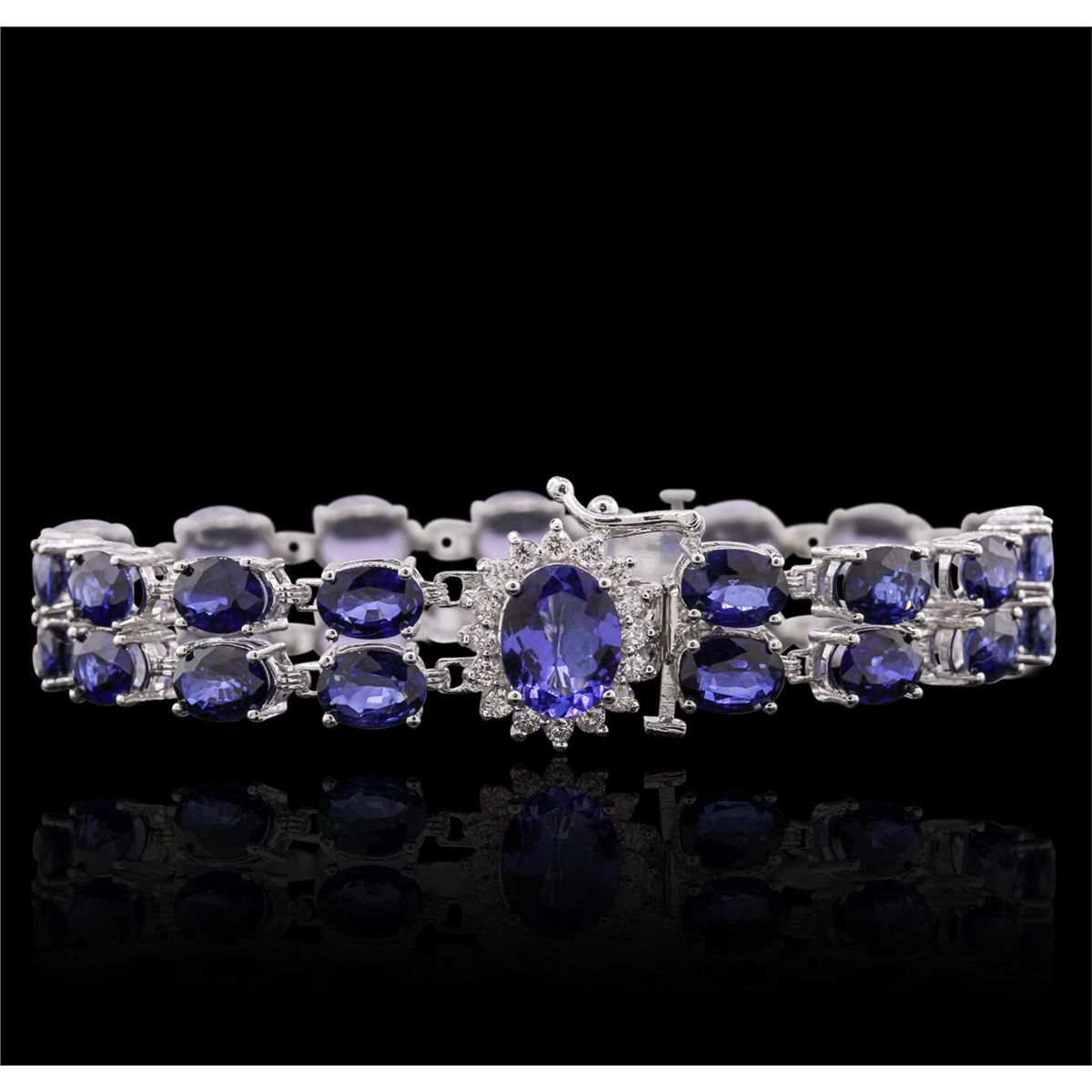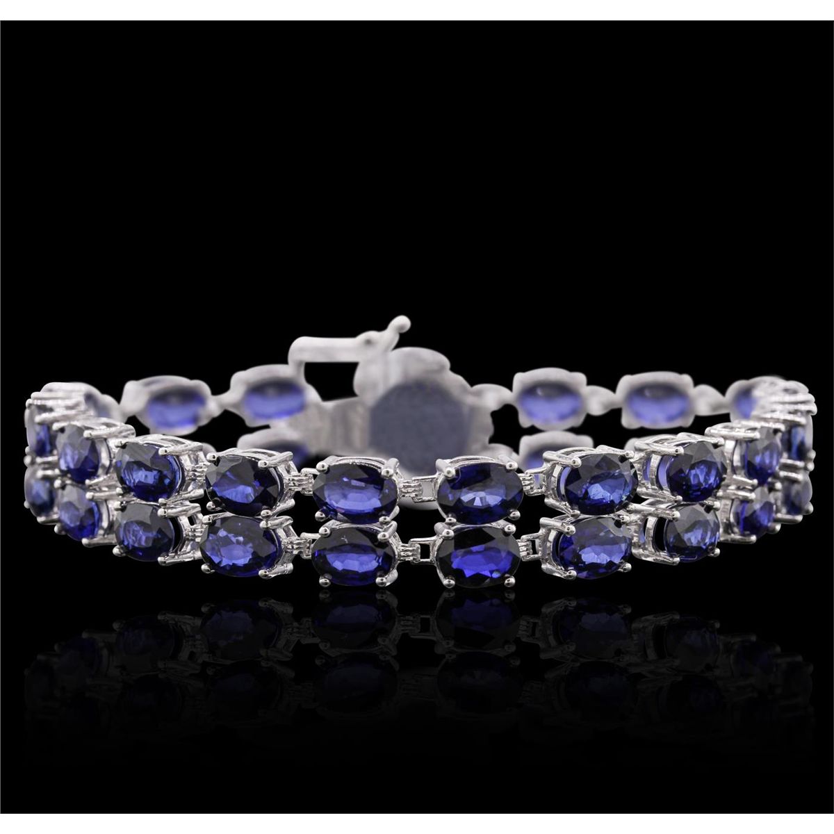 One electronically tested 14KT white gold Ladies combination cast & assembled bracelet with a hidden box clasp with a bright polish finish. Condition is new. Measurements: 7" in length. Containing: One prong set oval modified brilliant cut natural blue sapphire, measuring 9.80 x 7.60 x 5.36mm, approximate weight of 3.25ct., clarity is eye clean, type II, medium, moderately strong, blue color, (GIA B 5/4), cut is very good. Thirty-six prong set oval modified brilliant cut natural blue sapphires, measuring 7.00 x 5.00 x 3.25mm, approximate. Total Weight of 33.84ct., clarity is eye clean, type II, medium, moderately strong, blue color, (GIA B 5/4), cut is very good. Colored gemstones are presumed to have been subjected to commonly used color/clarity enhancement processes. Sixteen prong set round brilliant cut diamonds, measuring 2.00 - 2.00 x 1.20mm (depth est.) approximate. Total Weight of 16 Stones = 0.47ct. Clarity: I-1 to I-2. Color: J - K, Cut is Good. Total Weight of Colored Stones 37.09ct. Total Weight of Diamonds 0.47ct. Total Weight of Bracelet 24.80 grams. GGL Appraised at $40,425.00.