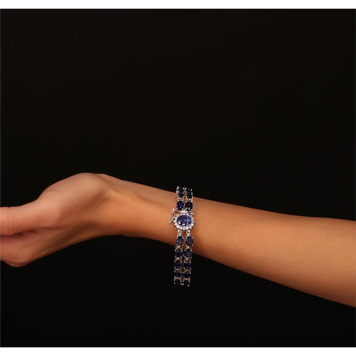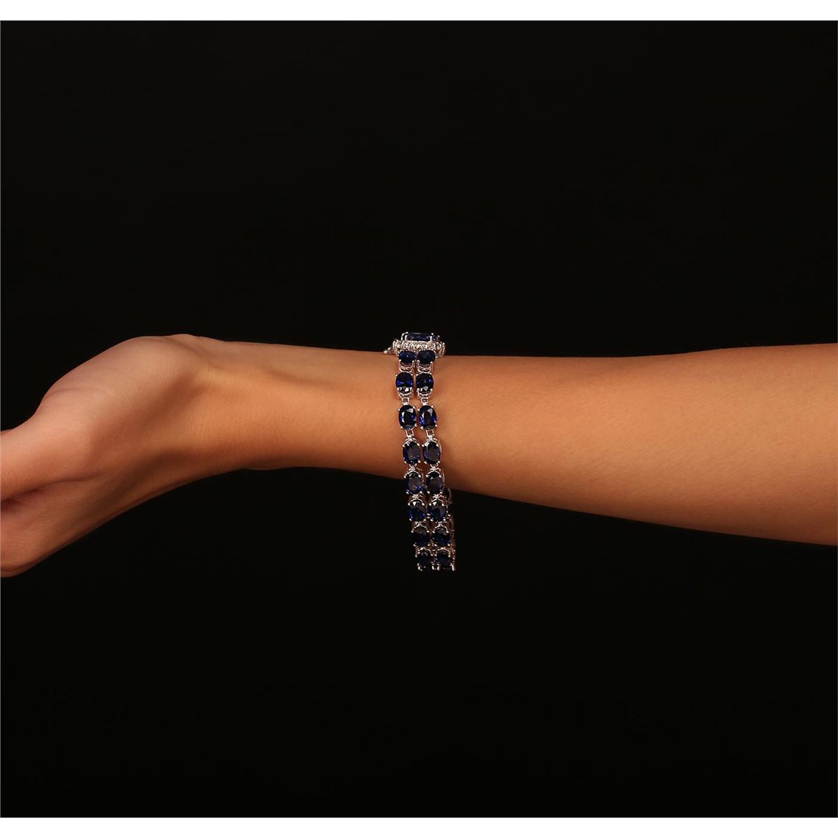 One electronically tested 14KT white gold Ladies combination cast & assembled bracelet with a hidden box clasp with a bright polish finish. Condition is new. Measurements: 7" in length. Containing: One prong set oval modified brilliant cut natural blue sapphire, measuring 9.80 x 7.60 x 5.36mm, approximate weight of 3.25ct., clarity is eye clean, type II, medium, moderately strong, blue color, (GIA B 5/4), cut is very good. Thirty-six prong set oval modified brilliant cut natural blue sapphires, measuring 7.00 x 5.00 x 3.25mm, approximate. Total Weight of 33.84ct., clarity is eye clean, type II, medium, moderately strong, blue color, (GIA B 5/4), cut is very good. Colored gemstones are presumed to have been subjected to commonly used color/clarity enhancement processes. Sixteen prong set round brilliant cut diamonds, measuring 2.00 - 2.00 x 1.20mm (depth est.) approximate. Total Weight of 16 Stones = 0.47ct. Clarity: I-1 to I-2. Color: J - K, Cut is Good. Total Weight of Colored Stones 37.09ct. Total Weight of Diamonds 0.47ct. Total Weight of Bracelet 24.80 grams. GGL Appraised at $40,425.00.