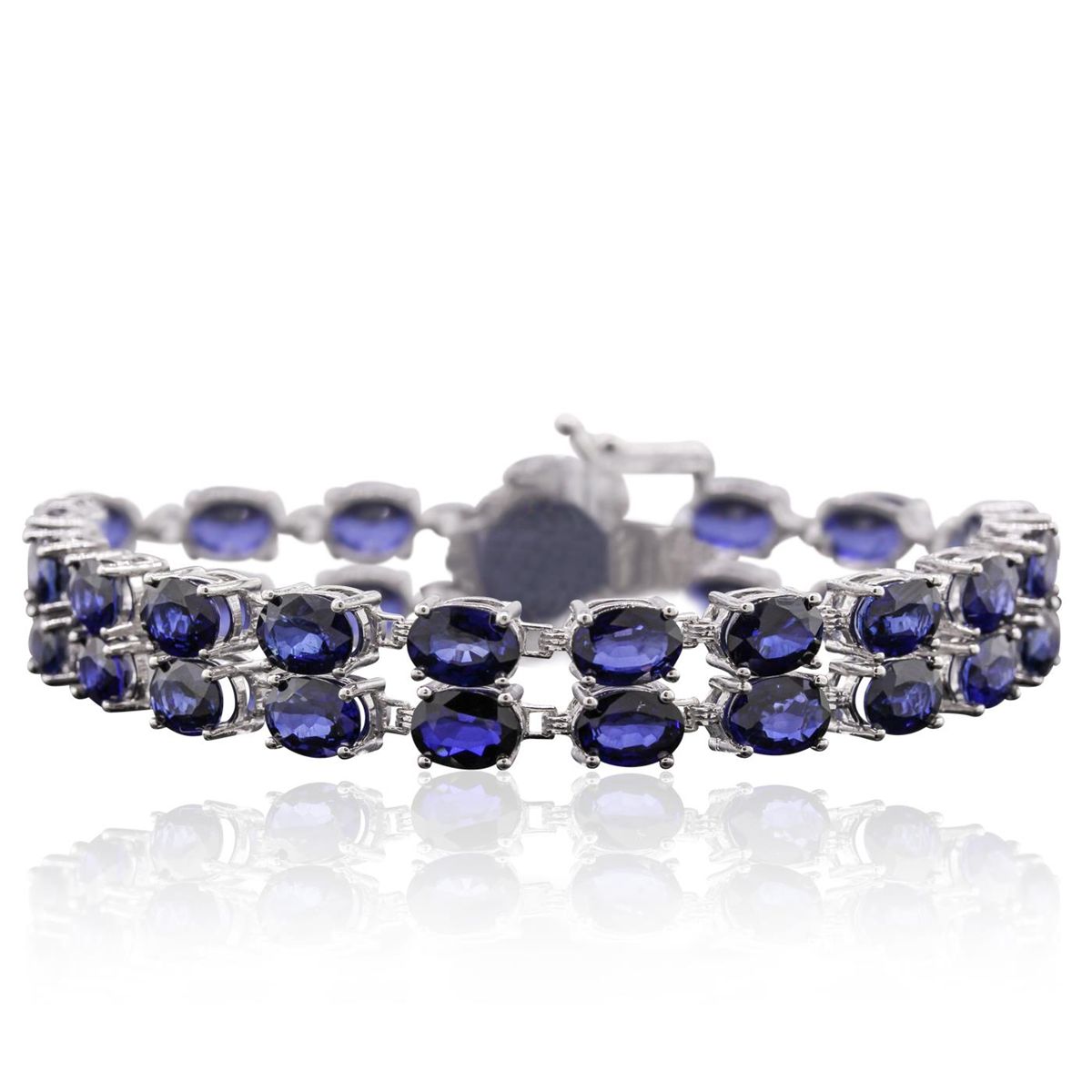 One electronically tested 14KT white gold Ladies combination cast & assembled bracelet with a hidden box clasp with a bright polish finish. Condition is new. Measurements: 7" in length. Containing: One prong set oval modified brilliant cut natural blue sapphire, measuring 9.80 x 7.60 x 5.36mm, approximate weight of 3.25ct., clarity is eye clean, type II, medium, moderately strong, blue color, (GIA B 5/4), cut is very good. Thirty-six prong set oval modified brilliant cut natural blue sapphires, measuring 7.00 x 5.00 x 3.25mm, approximate. Total Weight of 33.84ct., clarity is eye clean, type II, medium, moderately strong, blue color, (GIA B 5/4), cut is very good. Colored gemstones are presumed to have been subjected to commonly used color/clarity enhancement processes. Sixteen prong set round brilliant cut diamonds, measuring 2.00 - 2.00 x 1.20mm (depth est.) approximate. Total Weight of 16 Stones = 0.47ct. Clarity: I-1 to I-2. Color: J - K, Cut is Good. Total Weight of Colored Stones 37.09ct. Total Weight of Diamonds 0.47ct. Total Weight of Bracelet 24.80 grams. GGL Appraised at $40,425.00.