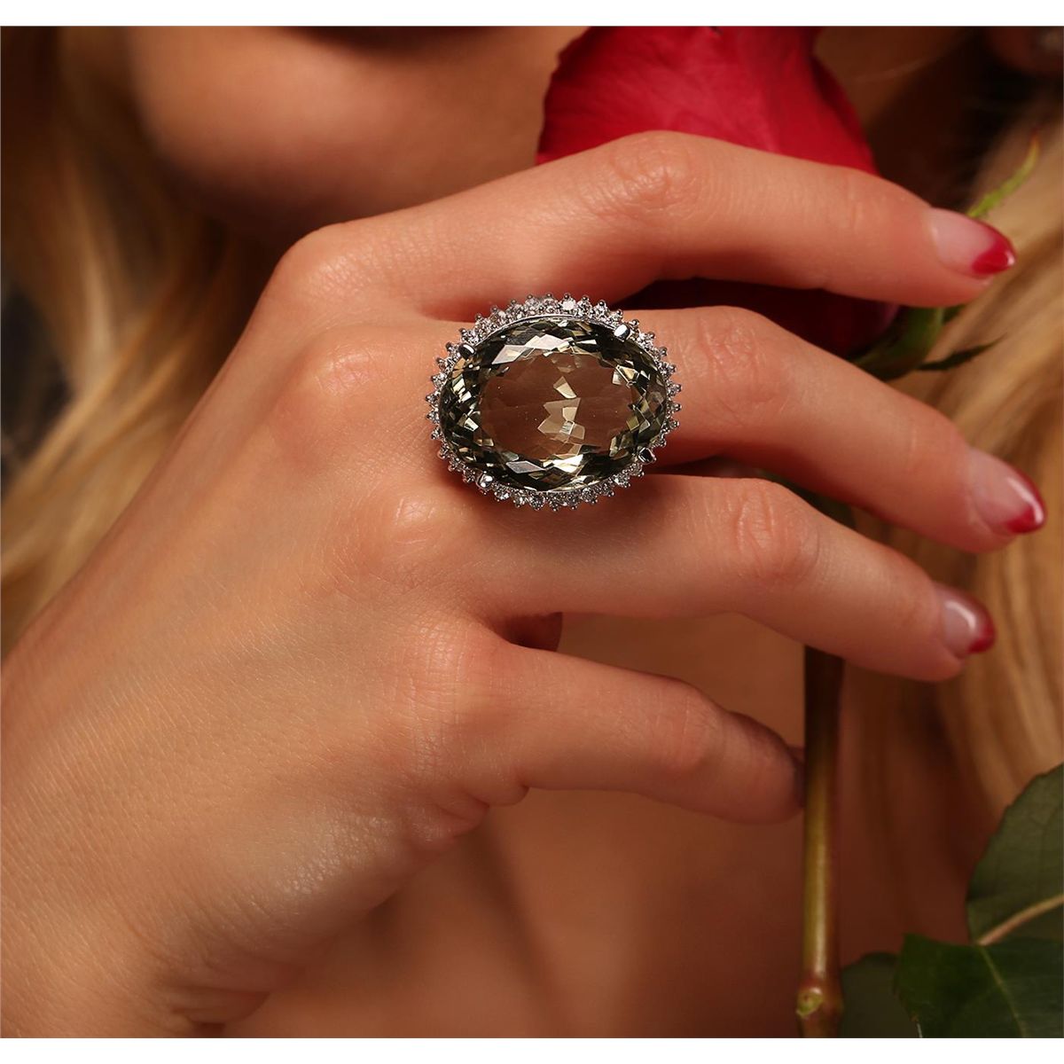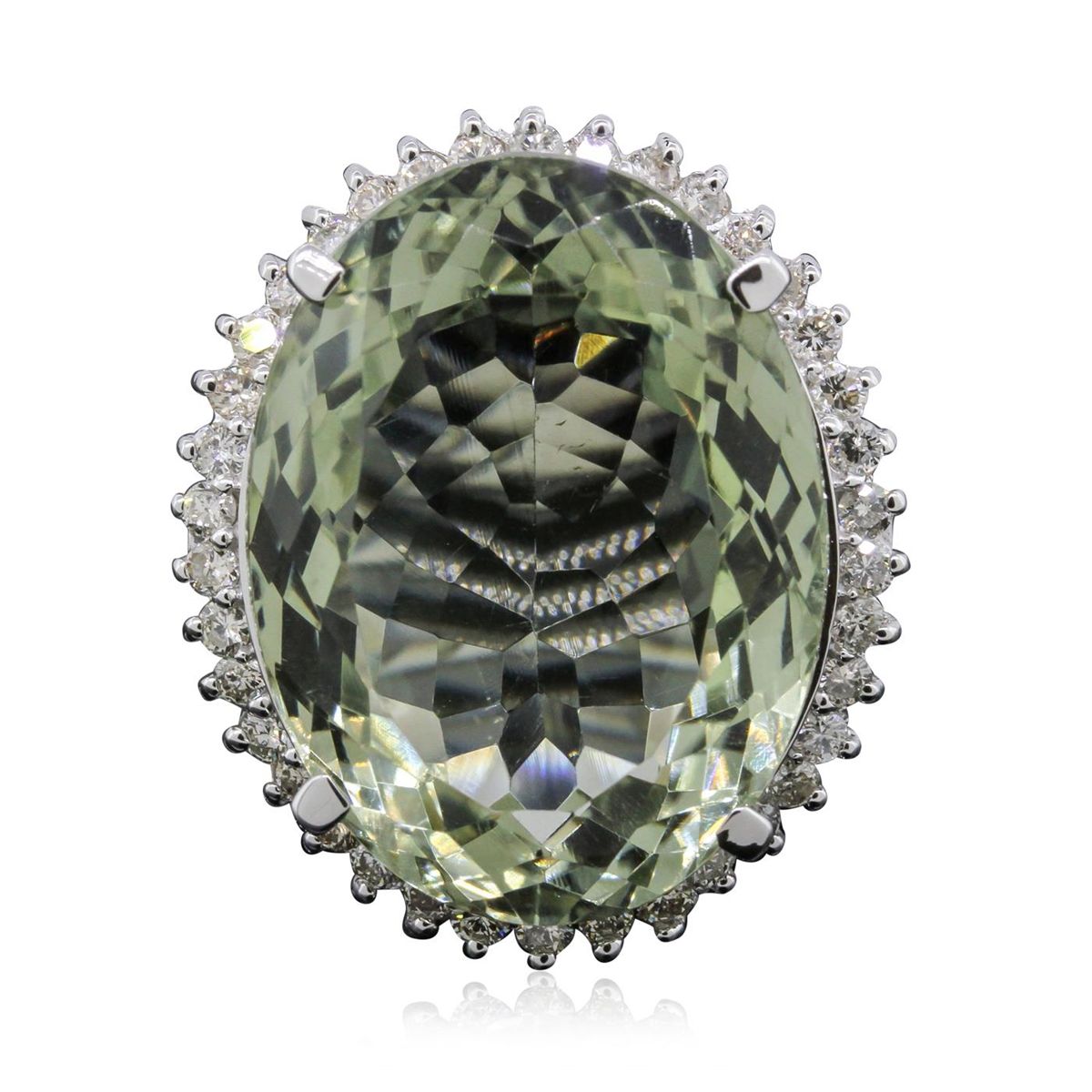 One electronically tested 14KT white gold ladies cast green quartz and diamond ring with a bright polish finish. Condition is new, good workmanship. The featured green quartz is set within a stylized diamond bezel, completed by a three millimeter wide band. Identified with markings of "K14". Containing: One prong set oval mixed cut natural green quartz, measuring 27.00 x 20.00 x 11.65mm, 10%. bulge factor, approximate weight of 37.65ct., clarity is eye clean, medium, very slightly grayish, slightly yellowish green color, (GIA slyG 5/3), cut is good. Transmitting light with no distortion, transparent. Graded in the setting. Thirty-Eight prong set round brilliant cut diamonds, measuring 2.20 - 2.00 x 1.26mm (depth est.) approximate. Total Weight of 38 Stones = 1.38ct. Graded in the setting. Clarity: SI-1 to I-1. Color: H - J. Total Weight of Colored Stones 37.65ct. Total Weight of Diamonds 1.38ct. Total Weight of Ring 20.61 grams. AIG Appraised at $7,470.00.