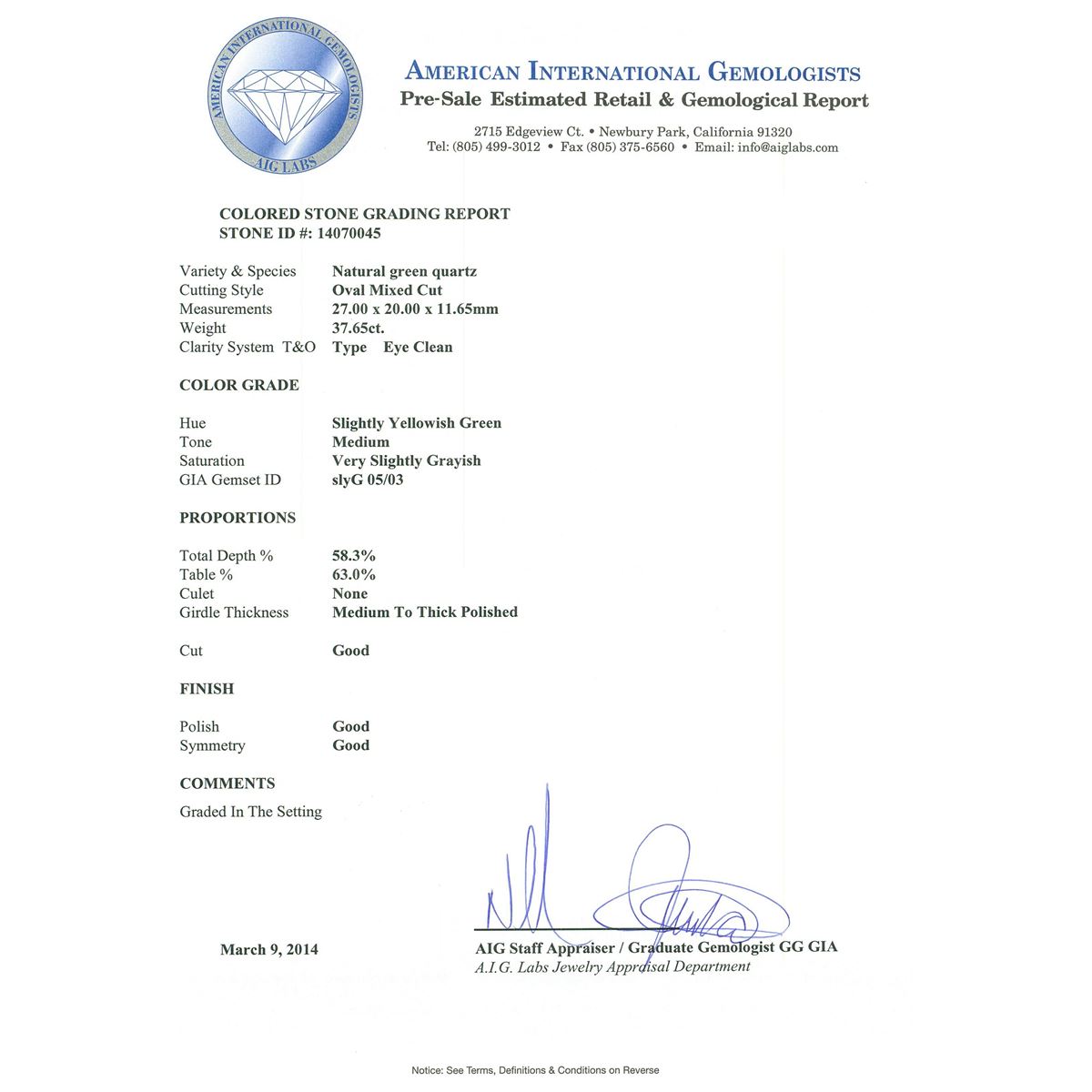 One electronically tested 14KT white gold ladies cast green quartz and diamond ring with a bright polish finish. Condition is new, good workmanship. The featured green quartz is set within a stylized diamond bezel, completed by a three millimeter wide band. Identified with markings of "K14". Containing: One prong set oval mixed cut natural green quartz, measuring 27.00 x 20.00 x 11.65mm, 10%. bulge factor, approximate weight of 37.65ct., clarity is eye clean, medium, very slightly grayish, slightly yellowish green color, (GIA slyG 5/3), cut is good. Transmitting light with no distortion, transparent. Graded in the setting. Thirty-Eight prong set round brilliant cut diamonds, measuring 2.20 - 2.00 x 1.26mm (depth est.) approximate. Total Weight of 38 Stones = 1.38ct. Graded in the setting. Clarity: SI-1 to I-1. Color: H - J. Total Weight of Colored Stones 37.65ct. Total Weight of Diamonds 1.38ct. Total Weight of Ring 20.61 grams. AIG Appraised at $7,470.00.