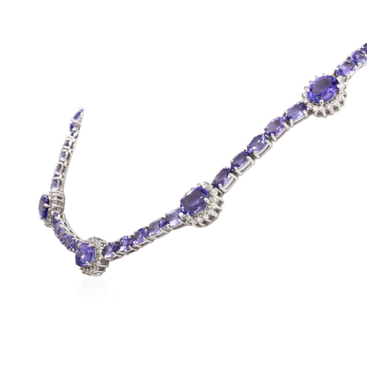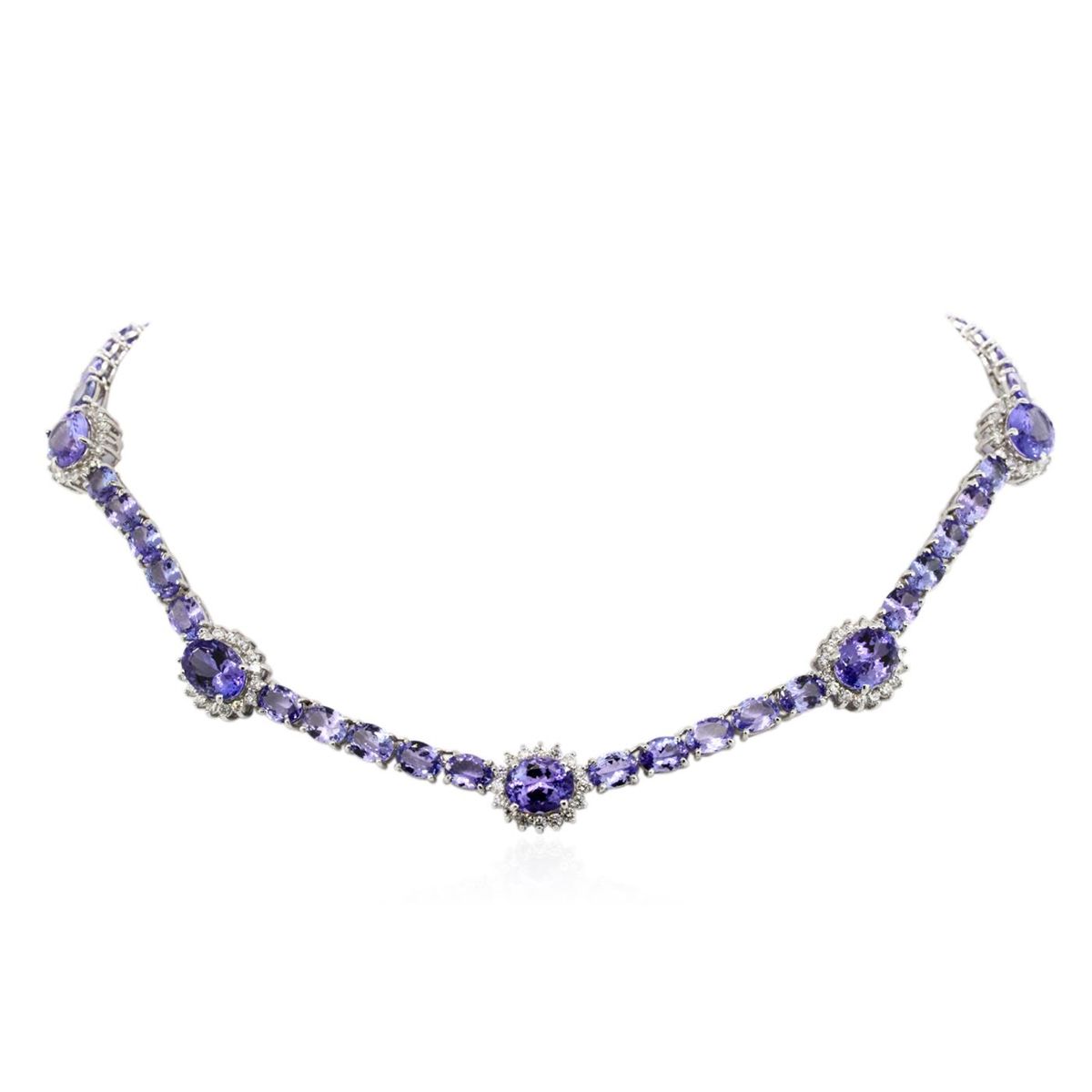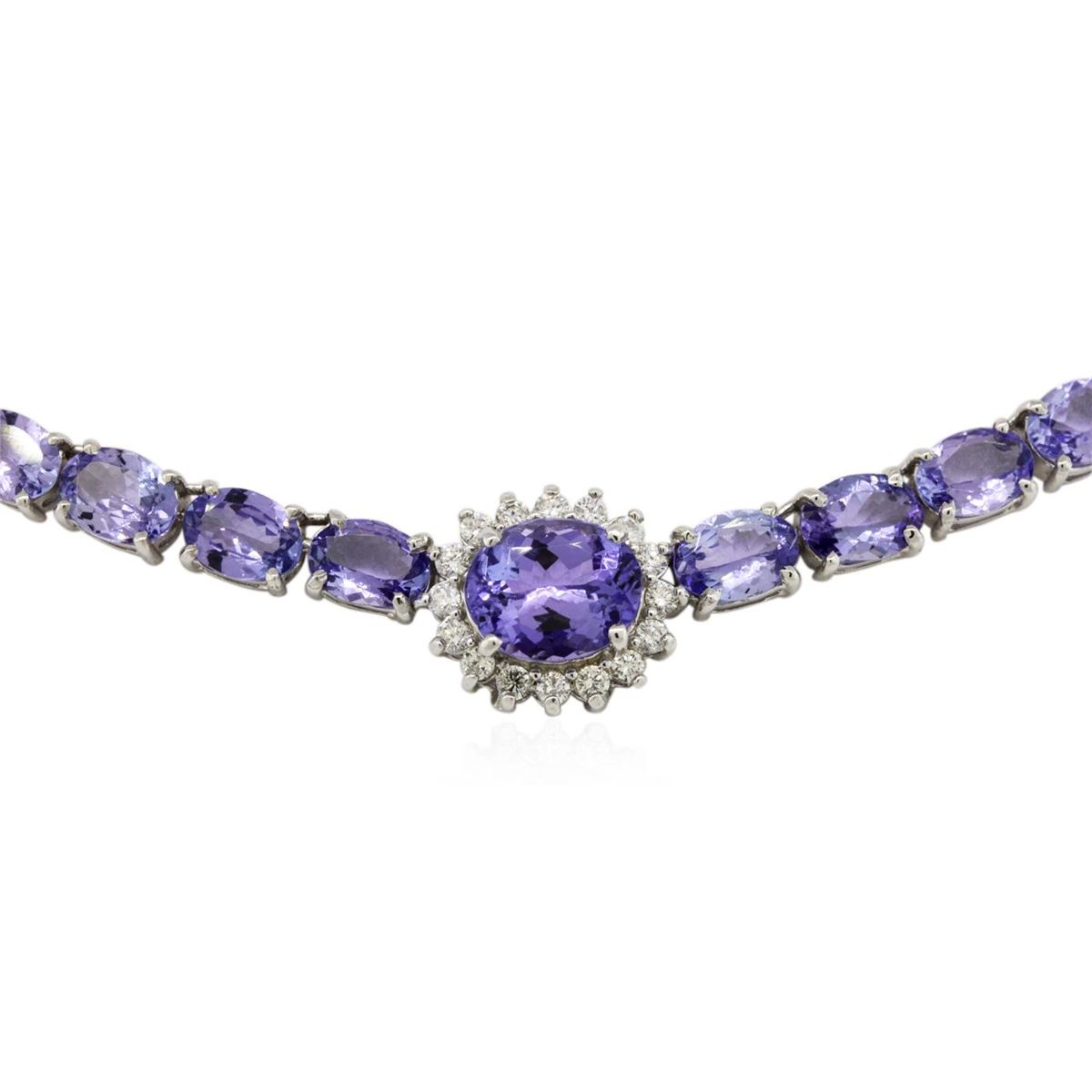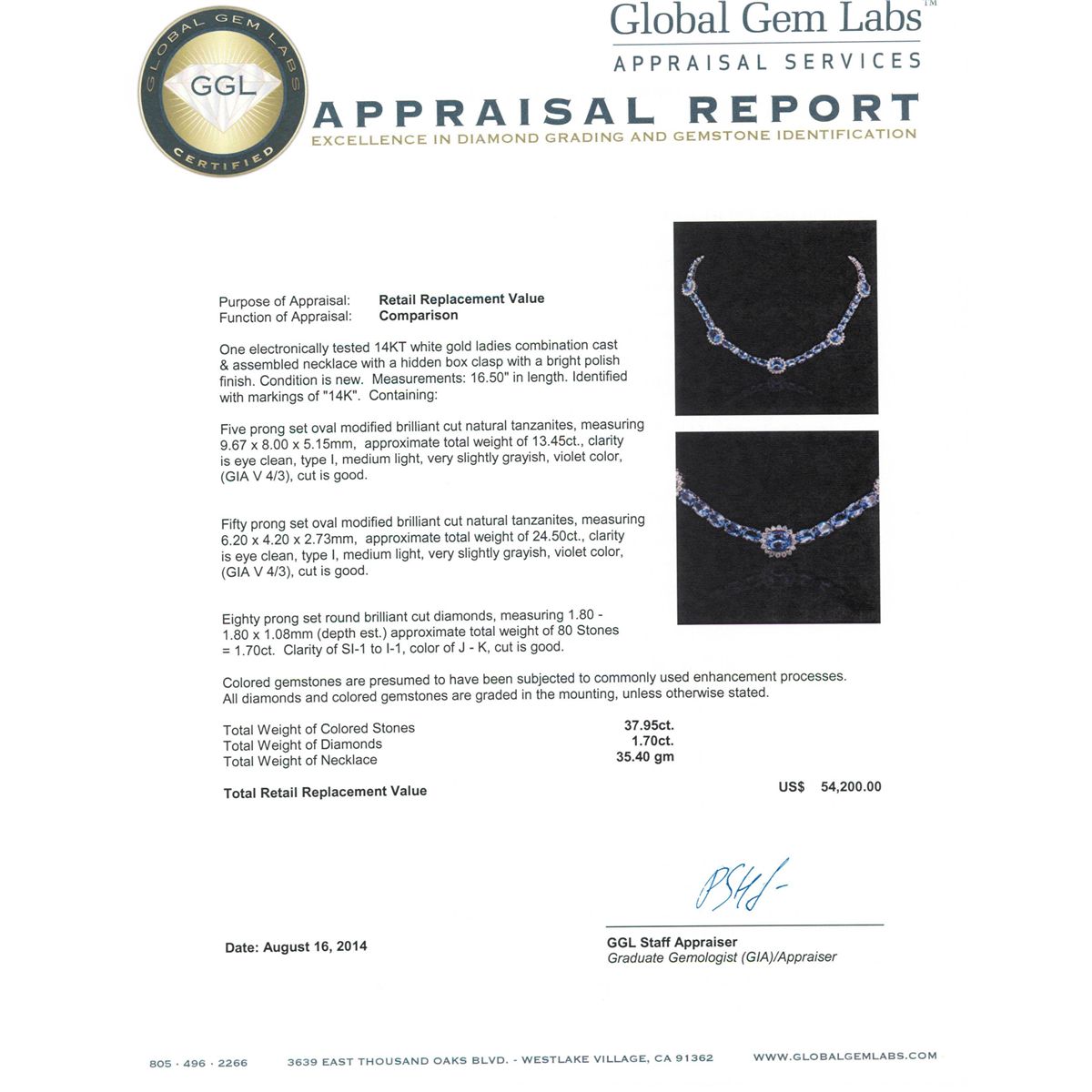 One electronically tested 14KT white gold ladies combination cast & assembled necklace with a hidden box clasp with a bright polish finish. Condition is new. Measurements: 16.50" in length. Identified with markings of "14K". Containing: Five prong set oval modified brilliant cut natural tanzanites, measuring 9.67 x 8.00 x 5.15mm, approximate. Total Weight of 13.45ct., clarity is eye clean, type I, medium light, very slightly grayish, violet color, (GIA V 4/3), cut is good. Fifty prong set oval modified brilliant cut natural tanzanites, measuring 6.20 x 4.20 x 2.73mm, approximate. Total Weight of 24.50ct., clarity is eye clean, type I, medium light, very slightly grayish, violet color, (GIA V 4/3), cut is good. Eighty prong set round brilliant cut diamonds, measuring 1.80 - 1.80 x 1.08mm (depth est.) approximate. Total Weight of 80 Stones = 1.70ct. Clarity: SI-1 to I-1. Color: J - K, Cut is Good. Colored gemstones are presumed to have been subjected to commonly used enhancement processes. All diamonds and colored gemstones are graded in the mounting, unless otherwise stated. Total Weight of Colored Stones 37.95ct. Total Weight of Diamonds 1.70ct. Total Weight of Necklace 35.40 grams. GGL Appraised at $54,200.00.