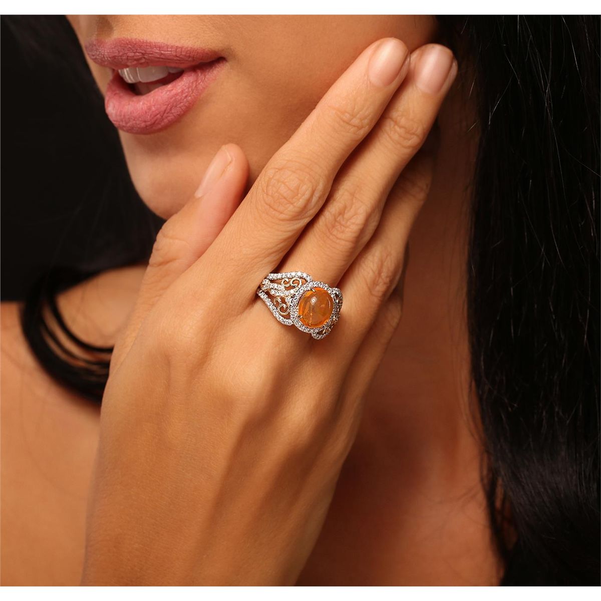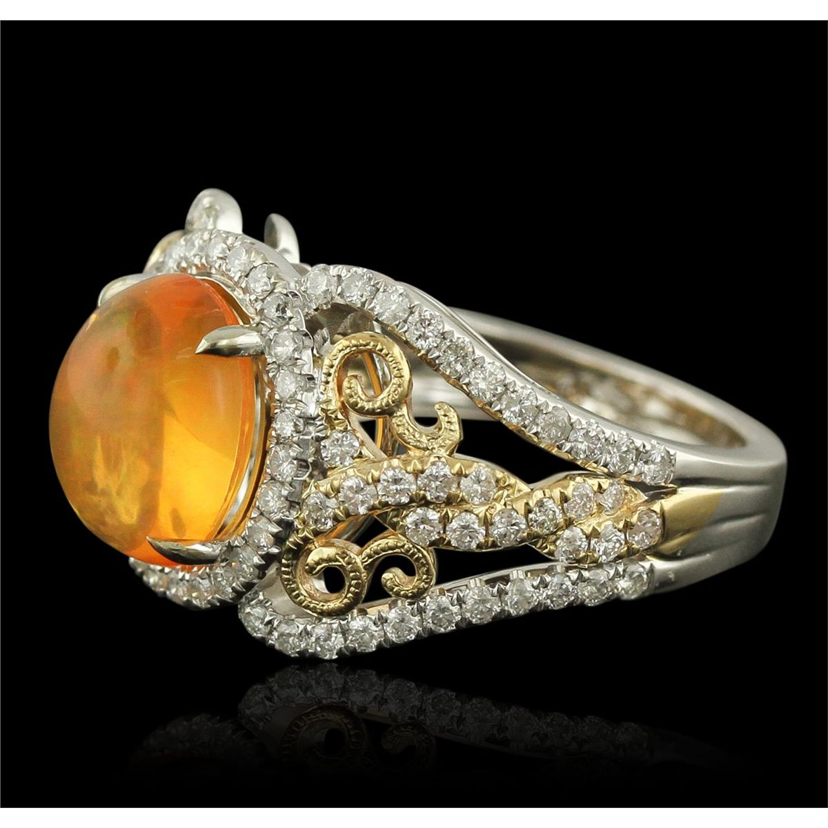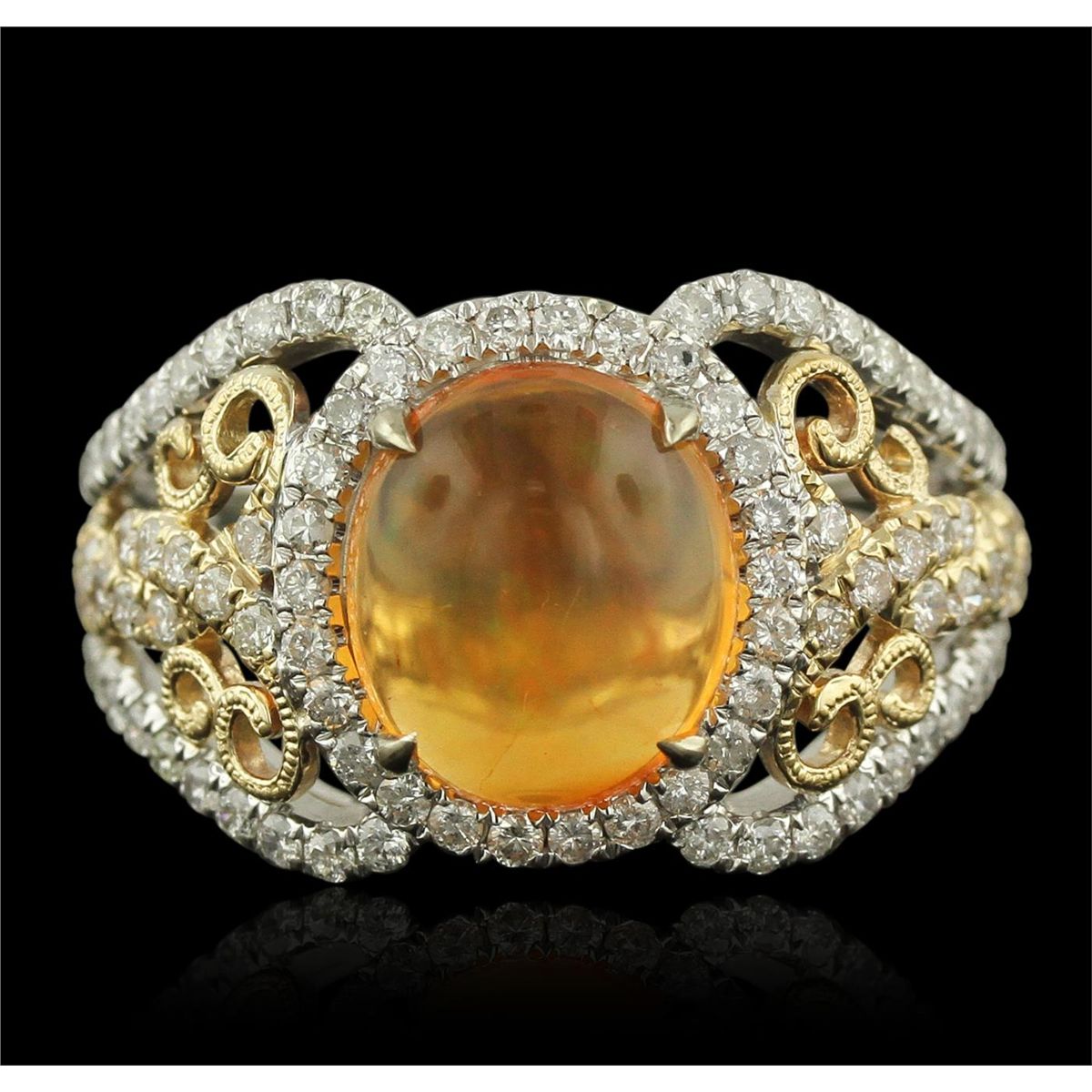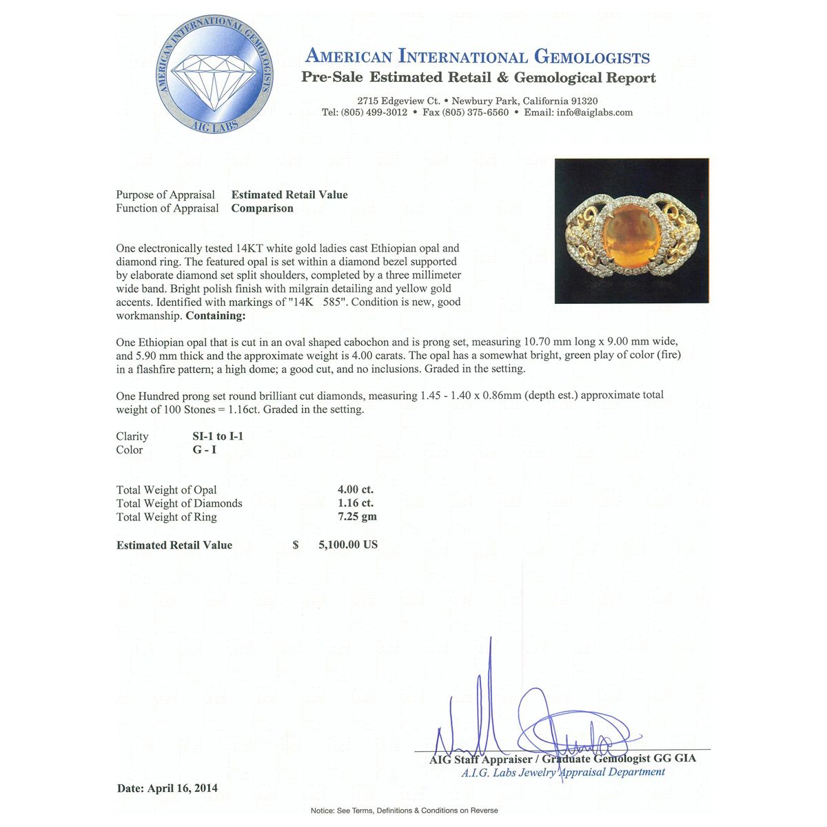One electronically tested 14KT white gold ladies cast opal and diamond ring. Condition is new, good workmanship. The featured opal is set within a diamond bezel supported by elaborate diamond set split shoulders, completed by a three millimeter wide band. Bright polish finish with milgrain detailing and yellow gold accents. Identified with markings of "14K 585". Containing: One crystal opal that is cut in a oval shaped cabochon and is prong set, measuring 10.70 mm long x 9.00 mm wide, and 5.90 mm thick and the approximate weight is 4.00 carats. The opal has a somewhat bright, blue-green play of color (fire) in a flashfire pattern; a high dome; a good cut; no inclusions; minor dull spot in its brightness and pattern; and is somewhat directional. Graded in the setting. One Hundred prong set round brilliant cut diamonds, measuring 1.45 - 1.40 x 0.86mm (depth est.) approximate. Total Weight of 100 Stones = 1.16ct. Graded in the setting. Clarity: SI-1 to I-1. Color: G - I. Total Weight of Diamonds 1.16ct. Total Weight of Opals 4.00ct. Total Weight of Ring 7.25 grams. AIG Appraised at $5,100.00.