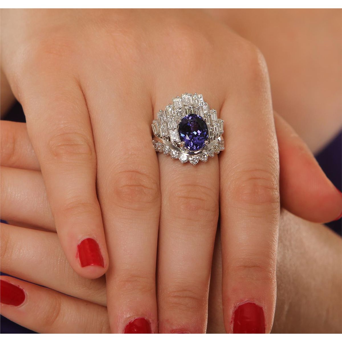 One polished, stamped, and electronically tested solid 14KT White Gold ring mounted with: 1 genuine tanzanite center stone weighing 4.00 carats, 18 genuine baguette cut diamonds weighing 3.08 carats, and 11 genuine round diamonds weighing 0.94 carats. This item weighs 9.6 grams, condition is new, excellent workmanship. AIGL Appraised at $20,930.00.