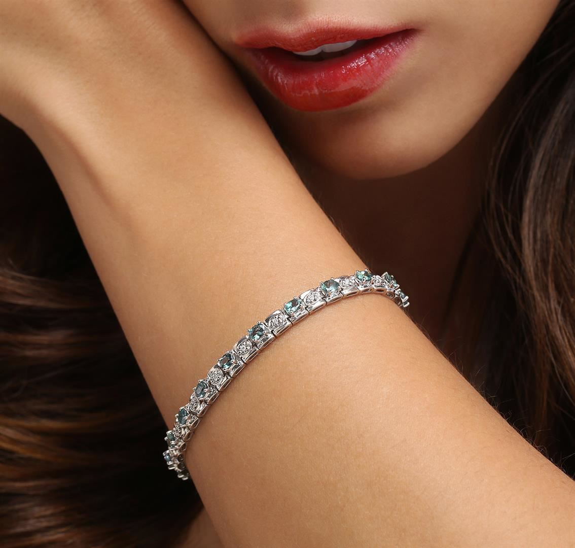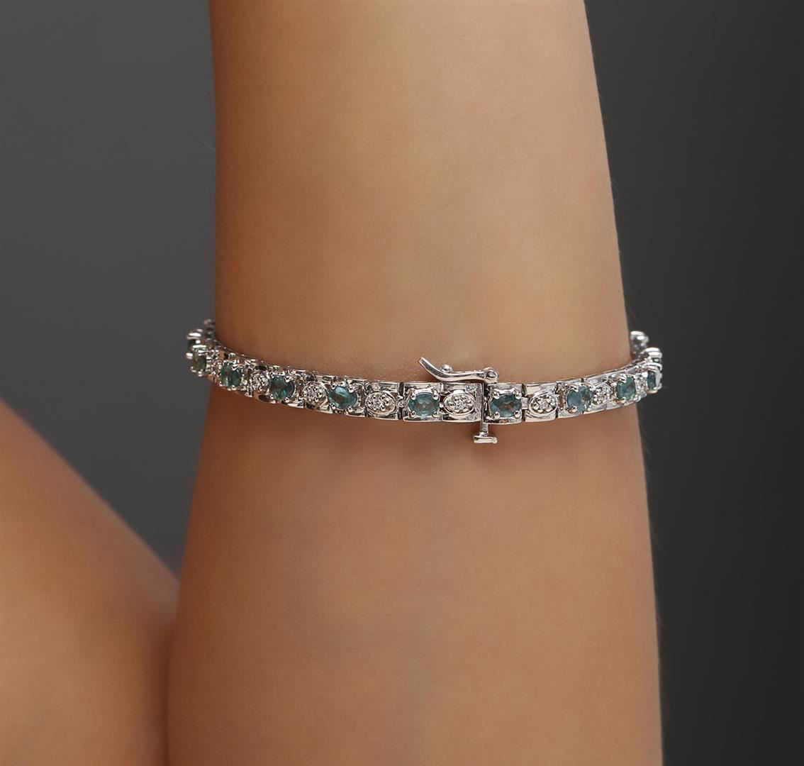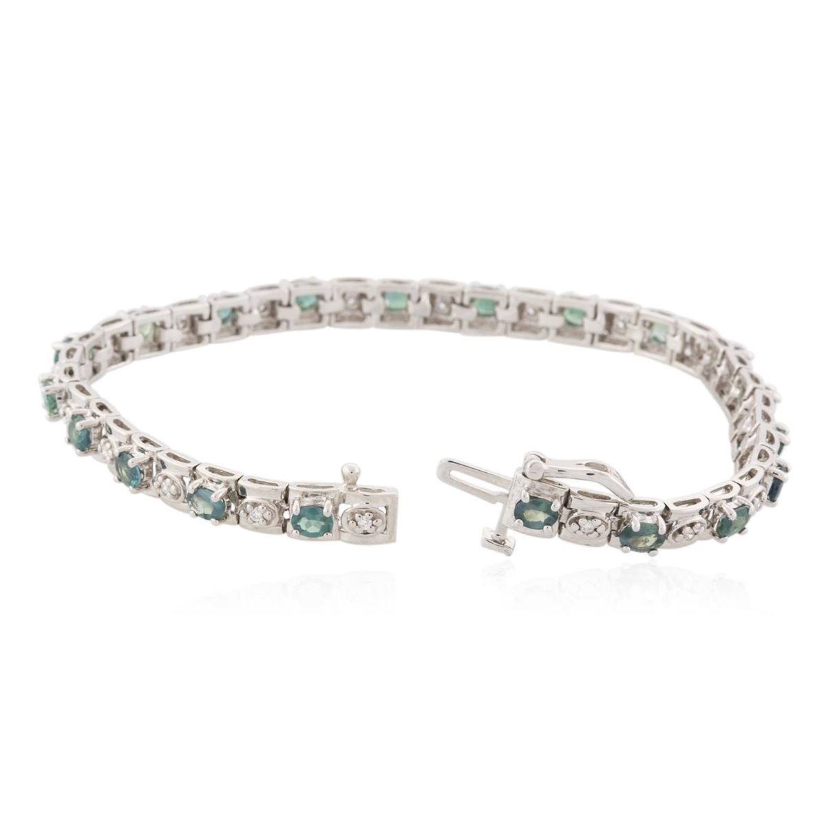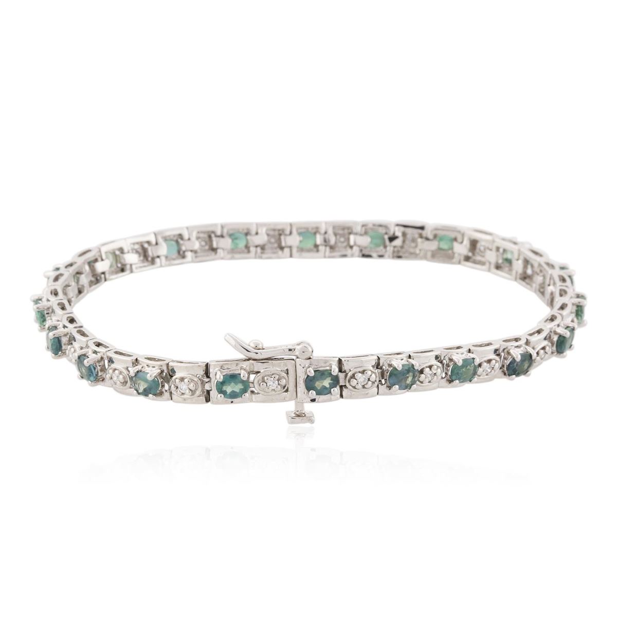 One electronically tested 14KT white gold ladies cast bracelet with a hidden box clasp with safety closer with a bright polish finish. Measurements: 7" in length Identified with markings of "14K". Condition is new. Containing: Twenty prong set oval modified brilliant cut natural green chrysoberyls, measuring 4.40 x 3.00. x 1.95mm,approximate total weight of 4.00.ct., clarity is slightly included, type I, medium light, moderately strong, green color, (GIA YG 4/4), cut is good. Twenty prong set round brilliant cut diamonds, measuring 1.30 - 1.30 x 0.78mm (depth est.) approximate total weight of 20 Stones = 0.16ct. Clarity: SI-1. Color: J - K, Cut is Good. Colored gemstones are presumed to have been subjected to commonly used enhancement processes. All diamonds and colored gemstones are graded in the mounting, unless otherwise stated. Total Weight of Colored Stones 4.00.ct. Total Weight of Diamonds 0.16ct. Total Weight of Bracelet 13.70 grams. GGL Appraised at $3,785.00.