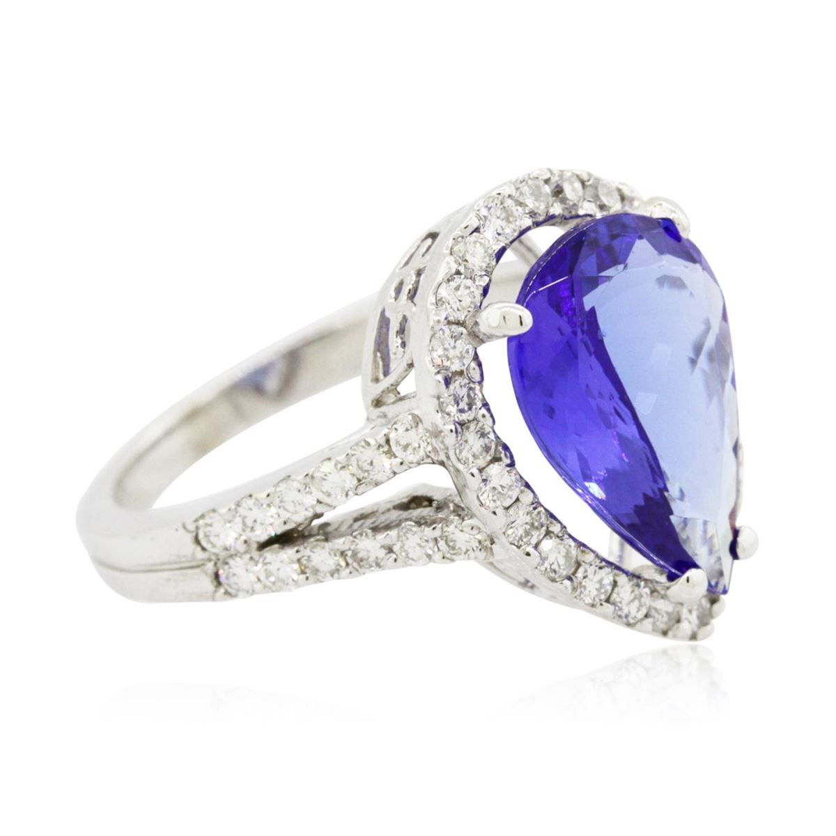 One electronically tested 14KT white gold ladies cast tanzanite & diamond ring with a bright finish. The featured tanzanite is set within a diamond bezel, supported by an elaborate white gold lattice under gallery and split diamond set shoulders, completed by a two millimeter wide band. Identified with markings of "14K". Condition is new, good workmanship. Containing: One prong set pear mixed cut natural tanzanite, measuring 13.60 x 9.52 x 4.40mm, 5%. bulge factor, approximate weight of 4.01ct., clarity is eye clean, type I, dark, moderately strong, blue color, (GIA B 7/4), cut is good. Transmitting light with no distortion, transparent. Graded in the setting. Tanzanite is a very rare gemstone that is only found in the country of Tanzania. Originally discovered in 1967. Tiffany & Company, named the stone Tanzanite. It is found in the Usumburu Mountains that border the Umba Valley of northern Tanzania. Tanzanite occurs in gray, brown, violet, blue, reddish-purple, & green. The gem is interesting because of its exceptional pleochroism. Rotated in different directions a tanzanite will exhibit multiple changes of color. Tanzanite has a low tolerance to ultrasonic cleaning, and should not be cleaned using this method. Forty-Nine prong set round brilliant cut diamonds, measuring 1.70 - 1.60 x 0.99mm (depth est.) approximate total weight of 49 Stones = 0.80ct. Graded in the setting. Clarity: SI-1 to I-1 . Color: G - I. Total Weight of Colored Stones 4.01ct. Total Weight of Diamonds 0.80ct. Total Weight of Ring 5.74 grams. AIG Appraised at $12,450.00.