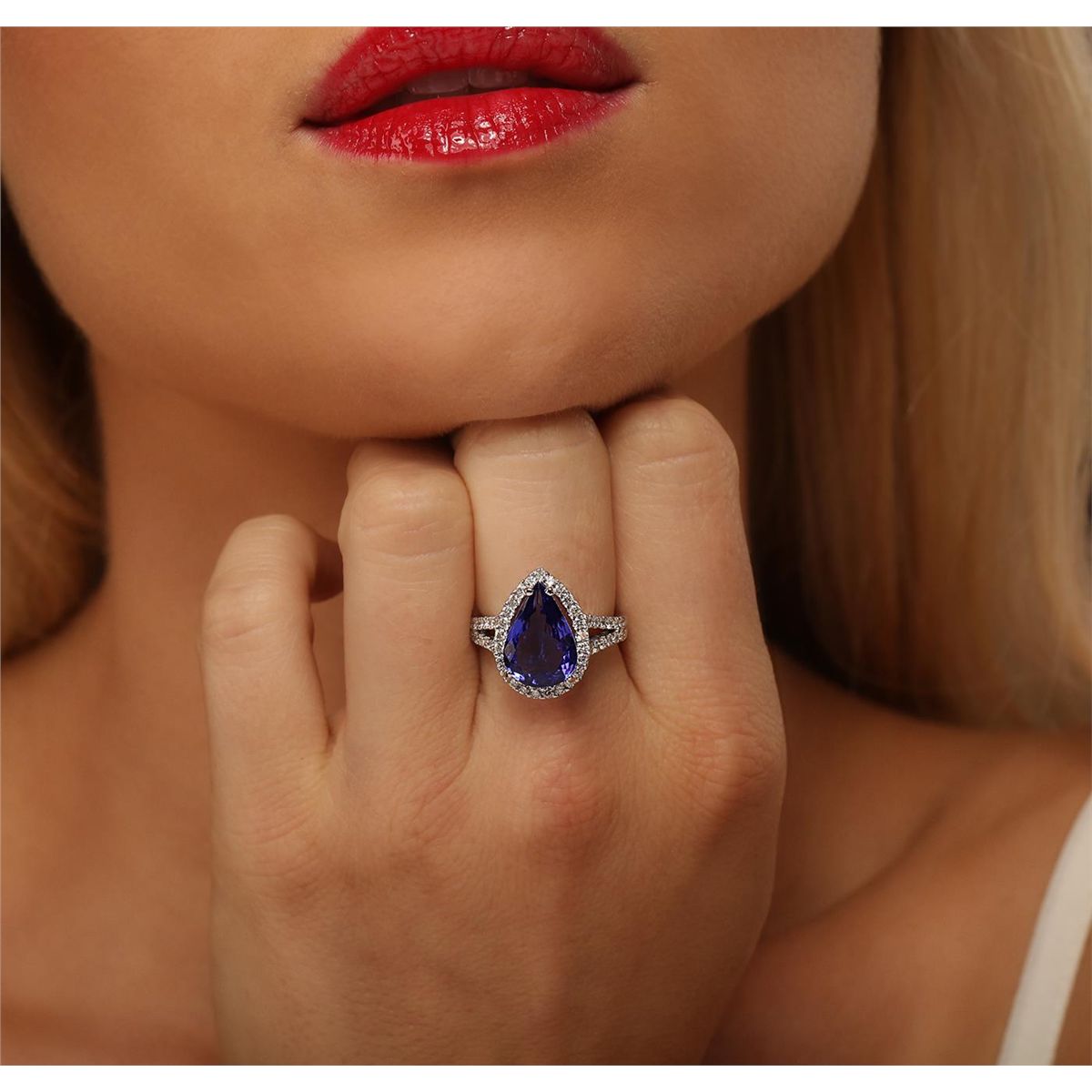 One electronically tested 14KT white gold ladies cast tanzanite & diamond ring with a bright finish. The featured tanzanite is set within a diamond bezel, supported by an elaborate white gold lattice under gallery and split diamond set shoulders, completed by a two millimeter wide band. Identified with markings of "14K". Condition is new, good workmanship. Containing: One prong set pear mixed cut natural tanzanite, measuring 13.60 x 9.52 x 4.40mm, 5%. bulge factor, approximate weight of 4.01ct., clarity is eye clean, type I, dark, moderately strong, blue color, (GIA B 7/4), cut is good. Transmitting light with no distortion, transparent. Graded in the setting. Tanzanite is a very rare gemstone that is only found in the country of Tanzania. Originally discovered in 1967. Tiffany & Company, named the stone Tanzanite. It is found in the Usumburu Mountains that border the Umba Valley of northern Tanzania. Tanzanite occurs in gray, brown, violet, blue, reddish-purple, & green. The gem is interesting because of its exceptional pleochroism. Rotated in different directions a tanzanite will exhibit multiple changes of color. Tanzanite has a low tolerance to ultrasonic cleaning, and should not be cleaned using this method. Forty-Nine prong set round brilliant cut diamonds, measuring 1.70 - 1.60 x 0.99mm (depth est.) approximate total weight of 49 Stones = 0.80ct. Graded in the setting. Clarity: SI-1 to I-1 . Color: G - I. Total Weight of Colored Stones 4.01ct. Total Weight of Diamonds 0.80ct. Total Weight of Ring 5.74 grams. AIG Appraised at $12,450.00.