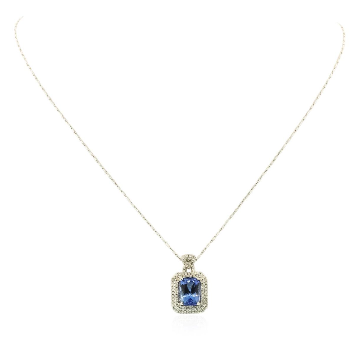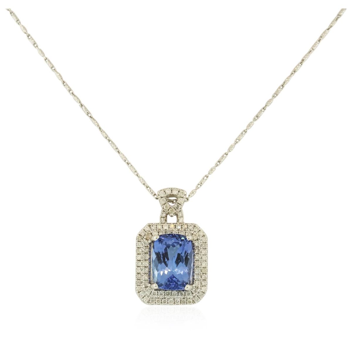 One electronically tested 14KT white gold ladies cast & assembled tanzanite and diamond pendant with chain. The pendant features a tanzanite set within two tiered diamond bezels, completed by a diamond set bail. The pendant is supported by an eighteen inch length 14KT white gold designer style chain, terminating in a lobster claw clasp. Bright polish finish. Trademark is Orianne. Identified with markings of "14K". Condition is new, good workmanship. Containing: One prong set rectangular cushion brilliant cut natural tanzanite, measuring 10.00 x 7.90 x 6.10mm, 6% bulge factor, approximate weight of 4.02ct., clarity is eye clean, type I, medium dark, very slightly grayish, violetish blue color, (GIA vB 6/3), cut is good. Transmitting light with no distortion, transparent. Graded in the setting. Tanzanite is a very rare gemstone that is only found in the country of Tanzania. Originally discovered in 1967. Tiffany & Company, named the stone Tanzanite. It is found in the Usumburu Mountains that border the Umba Valley of northern Tanzania. Tanzanite occurs in gray, brown, violet, blue, reddish-purple, & green. The gem is interesting because of its exceptional pleochroism. Rotated in different directions a tanzanite will exhibit multiple changes of color. Tanzanite has a low tolerance to ultrasonic cleaning, and should not be cleaned using this method. Eighty-Three prong set round brilliant cut diamonds, measuring 1.40 - 1.30 x 0.81mm (depth est.) approximate total weight of 83 Stones = 0.84ct. Graded in the setting. Clarity: I-2 to I-3. Color: H - J. Total Weight of Colored Stones 4.02ct. Total Weight of Diamonds 0.84ct. Total Weight of Pendant With Chain 6.15 grams. AIG Appraised at $12,715.00.