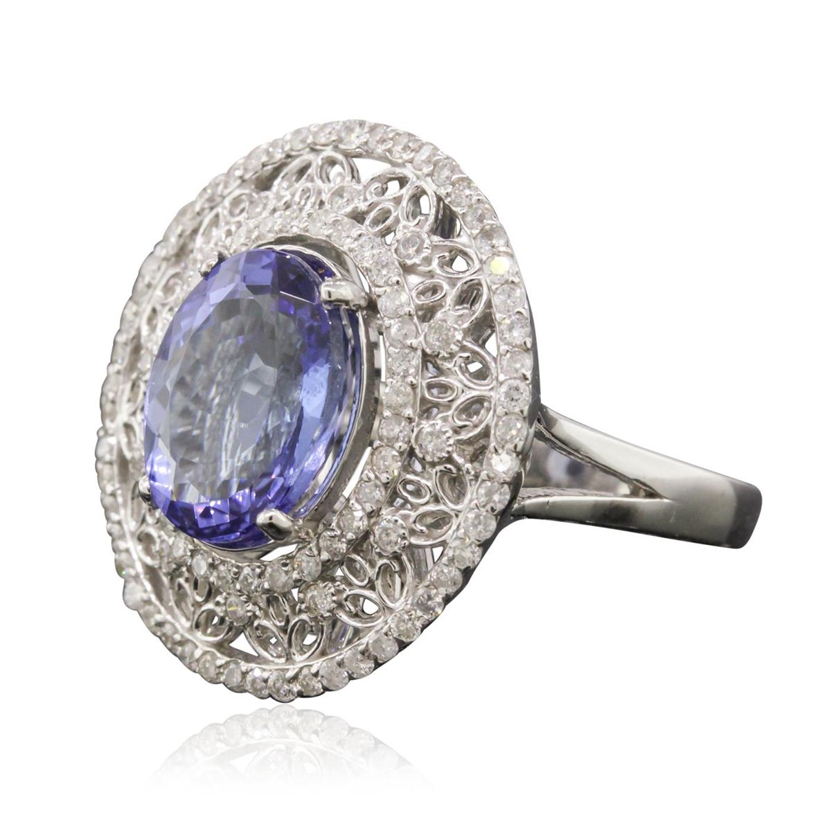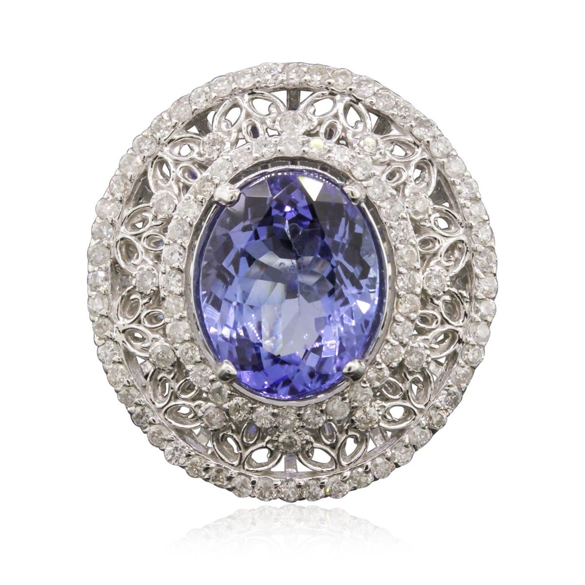 One electronically tested 14KT white gold ladies cast tanzanite and diamond ring with a bright polish finish. The featured tanzanite is set within a diamond lattice, completed by a two and one-half millimeter wide band. Identified with markings of "K14". Condition is new, good workmanship. Containing: One prong set pear mixed cut natural tanzanite, measuring 11.30 x 8.95 x 5.60mm, 6%. bulge factor, approximate weight of 4.02ct., clarity is eye clean, type I, medium, very slightly grayish, bluish violet color, (GIA bV 5/3), cut is good. Transmitting light with no distortion, transparent. Graded in the setting. Tanzanite is a very rare gemstone that is only found in the country of Tanzania. Originally discovered in 1967. Tiffany & Company, named the stone Tanzanite. It is found in the Usumburu Mountains that border the Umba Valley of northern Tanzania. Tanzanite occurs in gray, brown, violet, blue, reddish-purple, & green. The gem is interesting because of its exceptional pleochroism. Rotated in different directions a tanzanite will exhibit multiple changes of color. Tanzanite has a low tolerance to ultrasonic cleaning, and should not be cleaned using this method. Ninety-Six prong and bezel set round brilliant cut diamonds, measuring 1.40 - 1.30 x 0.81mm (depth est.) approximate total weight of 96 Stones = 0.96ct. Graded in the setting. Clarity: SI-1 to I-1 . Color: G - I. Total Weight of Colored Stones 4.02ct. Total Weight of Diamonds 0.96ct. Total Weight of Ring 7.35 grams. AIG Appraised at $13,520.00.