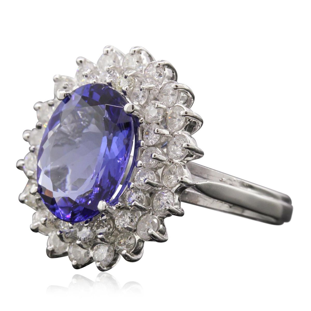 One electronically tested 14KT white gold Ladies combination cast & assembled ring with a bright polish finish. Condition is new. Identified with markings of "K14". Containing: One prong set oval modified brilliant cut natural tanzanite, measuring 12.50 x 9.40 x 5.00mm, approximate weight of 4.02ct., clarity is eye clean, type I, medium, moderately strong, violetish blue color, (GIA vB 5/4), cut is good. Colored gemstones are presumed to have been subjected to commonly used color/clarity enhancement processes. Twenty prong set round brilliant cut diamonds, measuring 2.00 - 2.00 x 1.20mm (depth est.) approximate. Total Weight of 20 Stones = 0.58ct. Clarity: SI-2 to I-2. Color: I - J, Cut is Good. Twenty prong set round brilliant cut diamonds, measuring 1.50 - 1.50 x 0.90mm (depth est.) approximate. Total Weight of 20 Stones = 0.25ct. Clarity: SI-2 to I-2. Color: I - J, Cut is Good. All grading of diamonds and colored gemstones in this piece of jewelry are graded in the mounting, unless otherwise stated. Total Weight of Colored Stones 4.02ct. Total Weight of Diamonds 0.83ct. Total Weight of Ring 6.10 grams. GGL Appraised at $9,090.00.