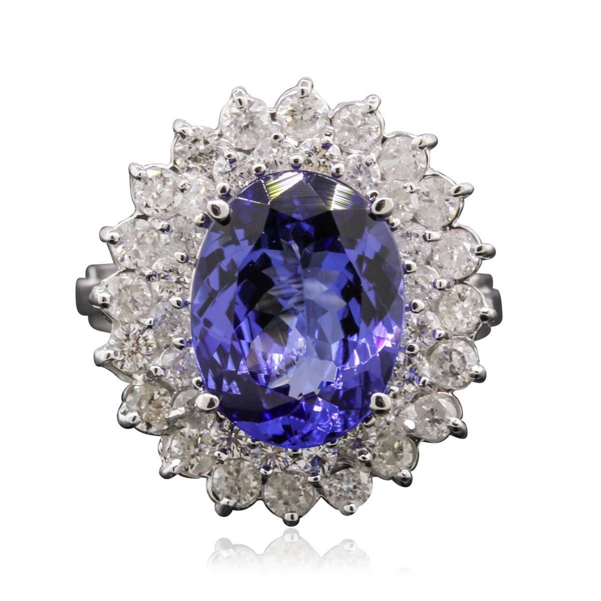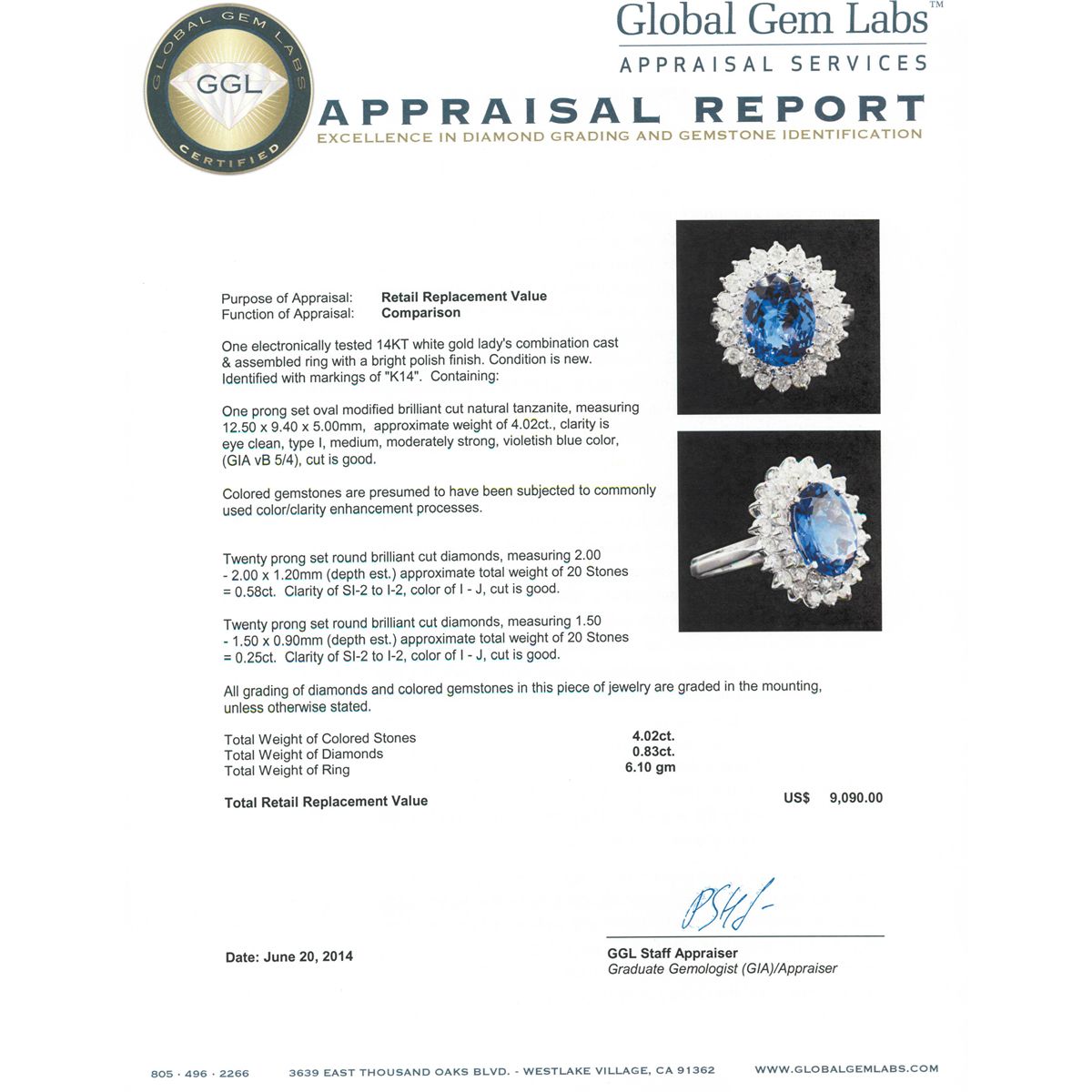One electronically tested 14KT white gold Ladies combination cast & assembled ring with a bright polish finish. Condition is new. Identified with markings of "K14". Containing: One prong set oval modified brilliant cut natural tanzanite, measuring 12.50 x 9.40 x 5.00mm, approximate weight of 4.02ct., clarity is eye clean, type I, medium, moderately strong, violetish blue color, (GIA vB 5/4), cut is good. Colored gemstones are presumed to have been subjected to commonly used color/clarity enhancement processes. Twenty prong set round brilliant cut diamonds, measuring 2.00 - 2.00 x 1.20mm (depth est.) approximate. Total Weight of 20 Stones = 0.58ct. Clarity: SI-2 to I-2. Color: I - J, Cut is Good. Twenty prong set round brilliant cut diamonds, measuring 1.50 - 1.50 x 0.90mm (depth est.) approximate. Total Weight of 20 Stones = 0.25ct. Clarity: SI-2 to I-2. Color: I - J, Cut is Good. All grading of diamonds and colored gemstones in this piece of jewelry are graded in the mounting, unless otherwise stated. Total Weight of Colored Stones 4.02ct. Total Weight of Diamonds 0.83ct. Total Weight of Ring 6.10 grams. GGL Appraised at $9,090.00.