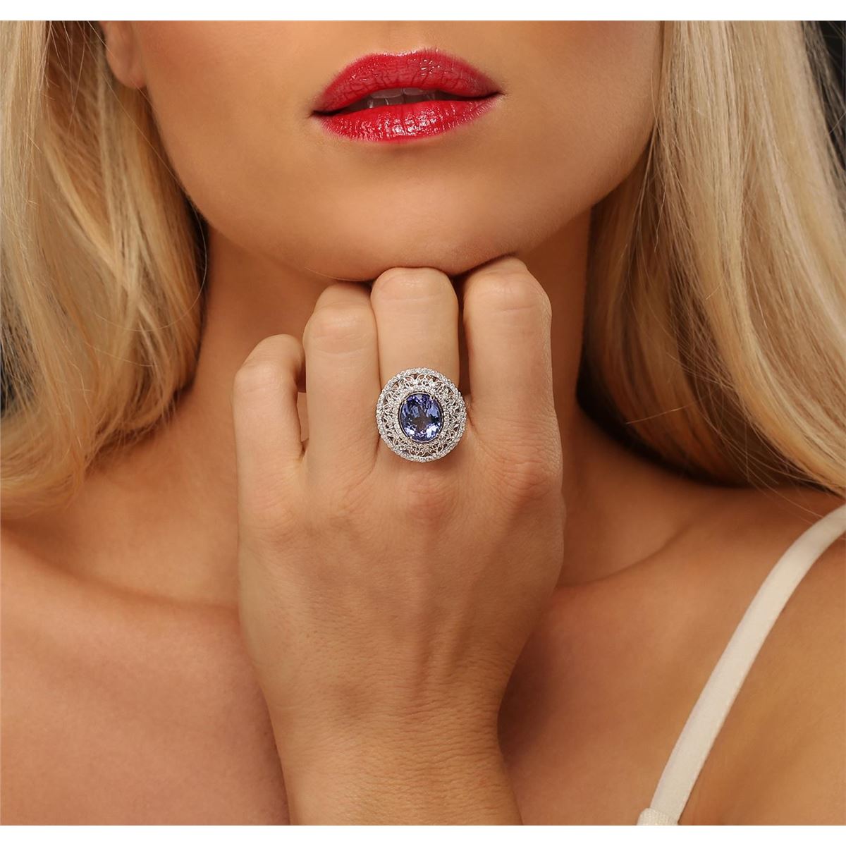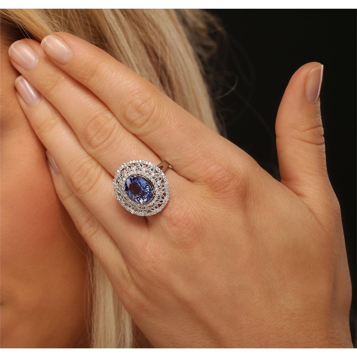 One electronically tested 14KT white gold ladies cast tanzanite and diamond ring with a bright polish finish. The featured tanzanite is set within a diamond lattice, completed by a two and one-half millimeter wide band. Identified with markings of "K14". Condition is new, good workmanship. Containing: One prong set pear mixed cut natural tanzanite, measuring 11.30 x 8.95 x 5.60mm, 6%. bulge factor, approximate weight of 4.02ct., clarity is eye clean, type I, medium, very slightly grayish, bluish violet color, (GIA bV 5/3), cut is good. Transmitting light with no distortion, transparent. Graded in the setting. Tanzanite is a very rare gemstone that is only found in the country of Tanzania. Originally discovered in 1967. Tiffany & Company, named the stone Tanzanite. It is found in the Usumburu Mountains that border the Umba Valley of northern Tanzania. Tanzanite occurs in gray, brown, violet, blue, reddish-purple, & green. The gem is interesting because of its exceptional pleochroism. Rotated in different directions a tanzanite will exhibit multiple changes of color. Tanzanite has a low tolerance to ultrasonic cleaning, and should not be cleaned using this method. Ninety-Six prong and bezel set round brilliant cut diamonds, measuring 1.40 - 1.30 x 0.81mm (depth est.) approximate total weight of 96 Stones = 0.96ct. Graded in the setting. Clarity: SI-1 to I-1 . Color: G - I. Total Weight of Colored Stones 4.02ct. Total Weight of Diamonds 0.96ct. Total Weight of Ring 7.35 grams. AIG Appraised at $13,520.00.