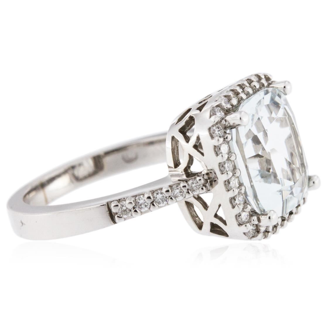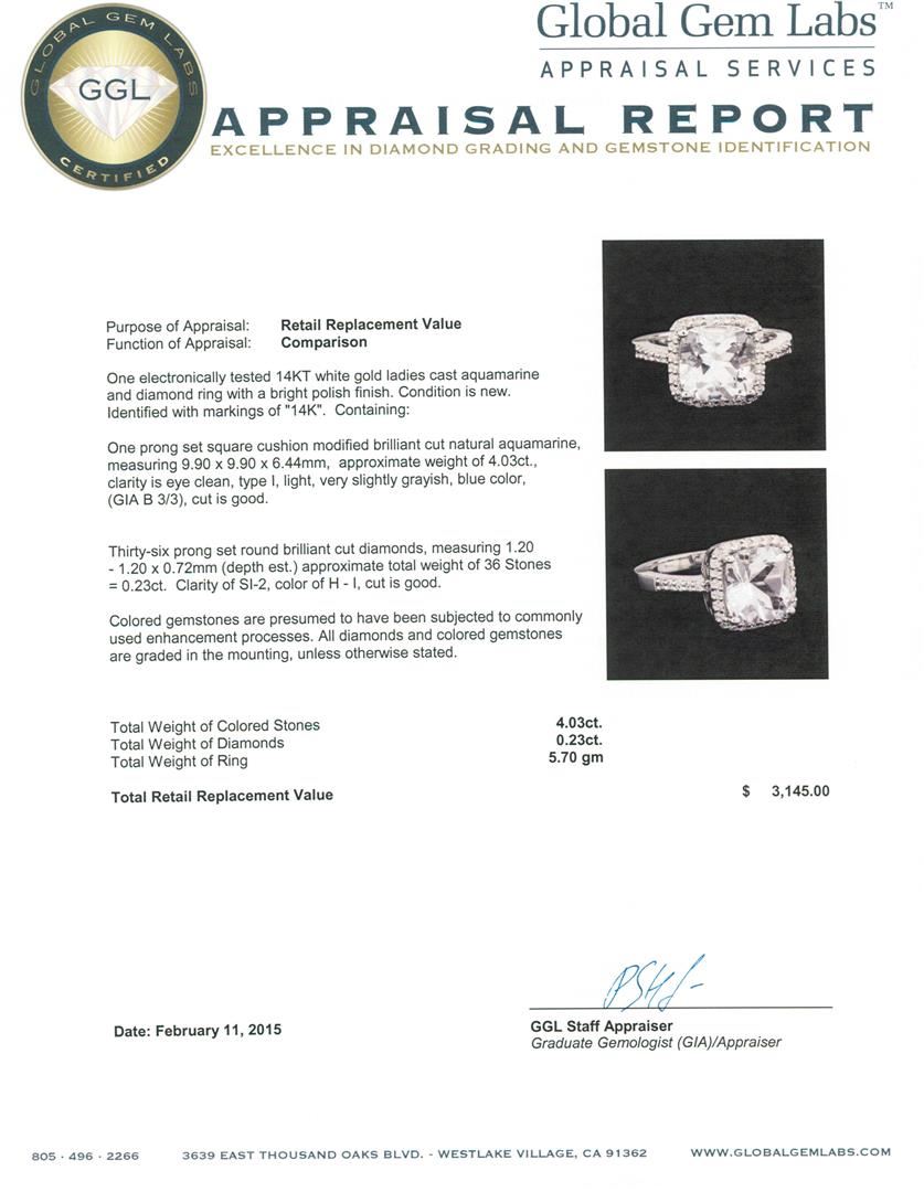 One electronically tested 14KT white gold ladies cast aquamarine and diamond ring with a bright polish finish. Identified with markings of "14K". Condition is new. Containing: One prong set square cushion modified brilliant cut natural aquamarine, measuring 9.90 x 9.90 x 6.44mm, approximate weight of 4.03ct., clarity is eye clean, type I, light, very slightly grayish, blue color, (GIA B 3/3), cut is good. Thirty-Six prong set round brilliant cut diamonds, measuring 1.20 - 1.20 x 0.72mm (depth est.) approximate total weight of 36 Stones = 0.23ct. Clarity: SI-2. Color: H - I, Cut is Good. Colored gemstones are presumed to have been subjected to commonly used enhancement processes. All diamonds and colored gemstones are graded in the mounting, unless otherwise stated. Total Weight of Colored Stones 4.03ct. Total Weight of Diamonds 0.23ct. Total Weight of Ring 5.70 grams. GGL Appraised at $3,145.00.