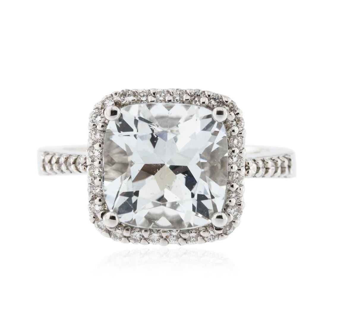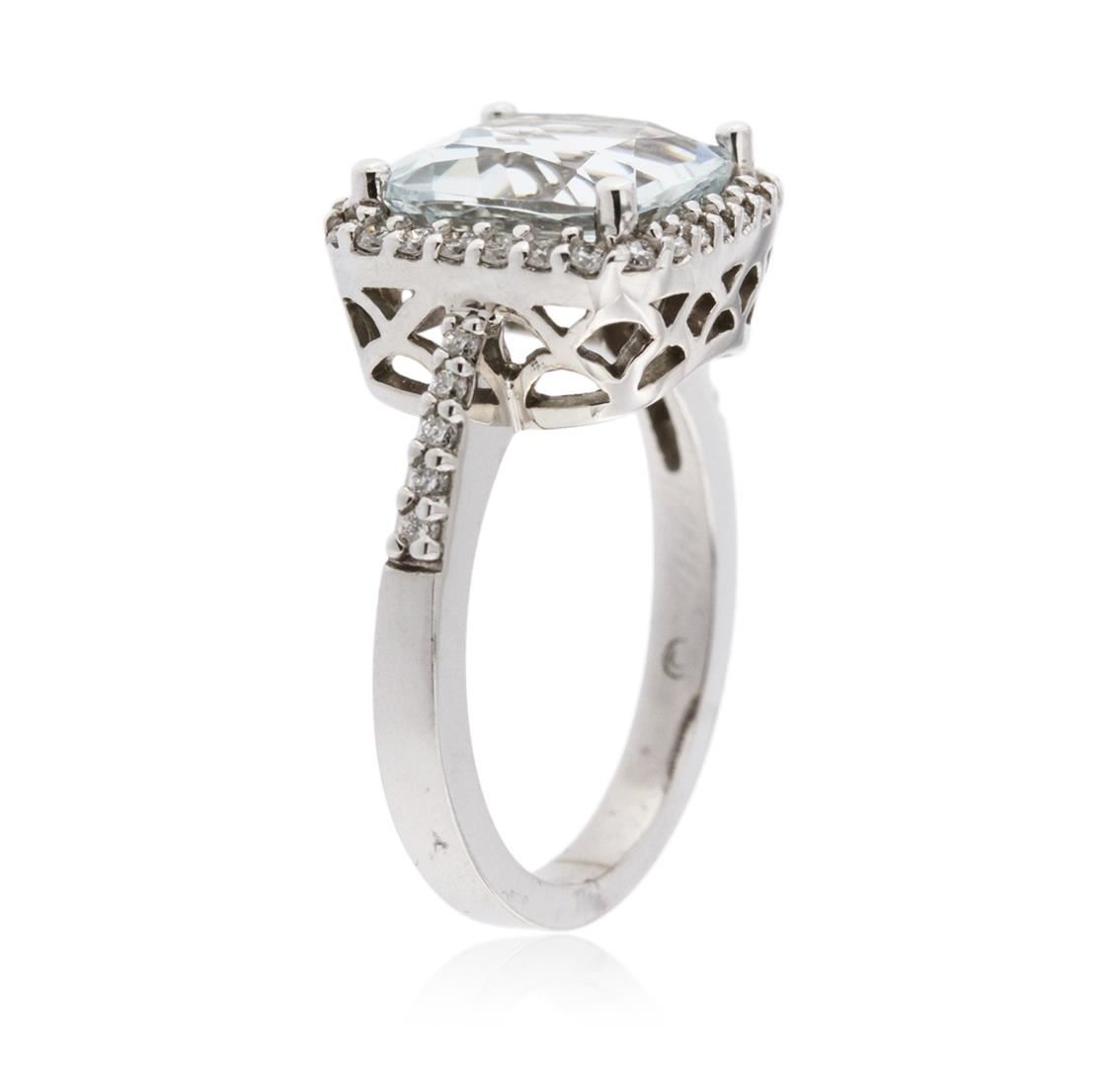 One electronically tested 14KT white gold ladies cast aquamarine and diamond ring with a bright polish finish. Identified with markings of "14K". Condition is new. Containing: One prong set square cushion modified brilliant cut natural aquamarine, measuring 9.90 x 9.90 x 6.44mm, approximate weight of 4.03ct., clarity is eye clean, type I, light, very slightly grayish, blue color, (GIA B 3/3), cut is good. Thirty-Six prong set round brilliant cut diamonds, measuring 1.20 - 1.20 x 0.72mm (depth est.) approximate total weight of 36 Stones = 0.23ct. Clarity: SI-2. Color: H - I, Cut is Good. Colored gemstones are presumed to have been subjected to commonly used enhancement processes. All diamonds and colored gemstones are graded in the mounting, unless otherwise stated. Total Weight of Colored Stones 4.03ct. Total Weight of Diamonds 0.23ct. Total Weight of Ring 5.70 grams. GGL Appraised at $3,145.00.