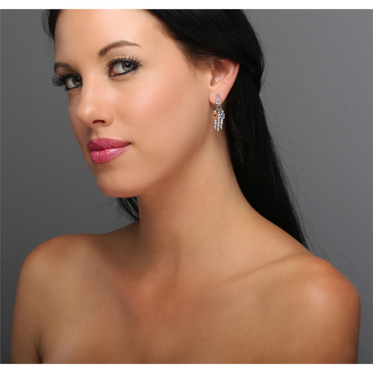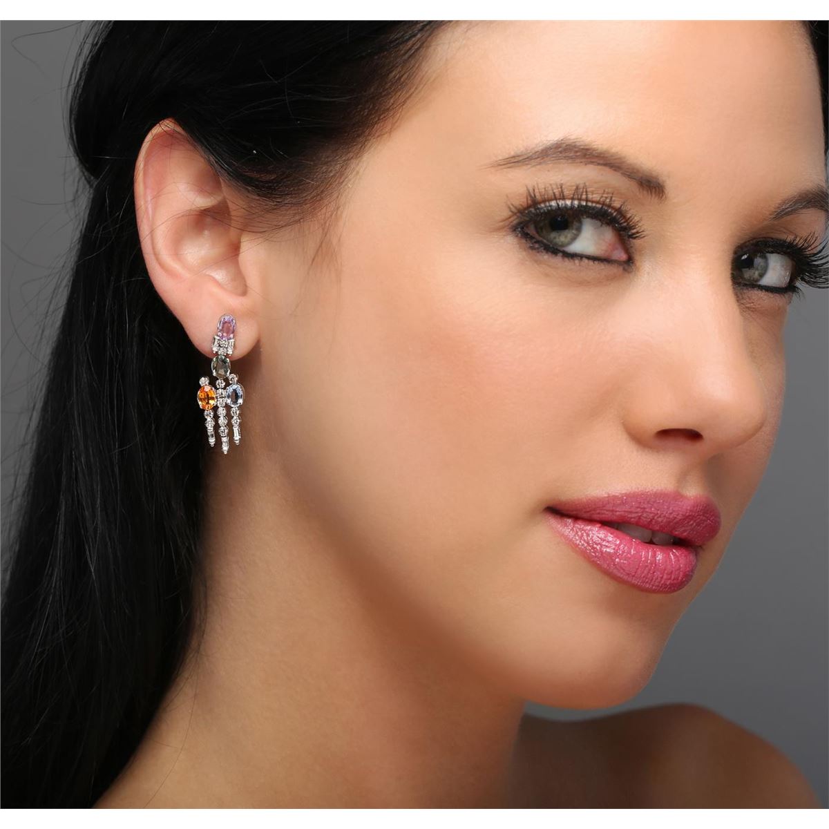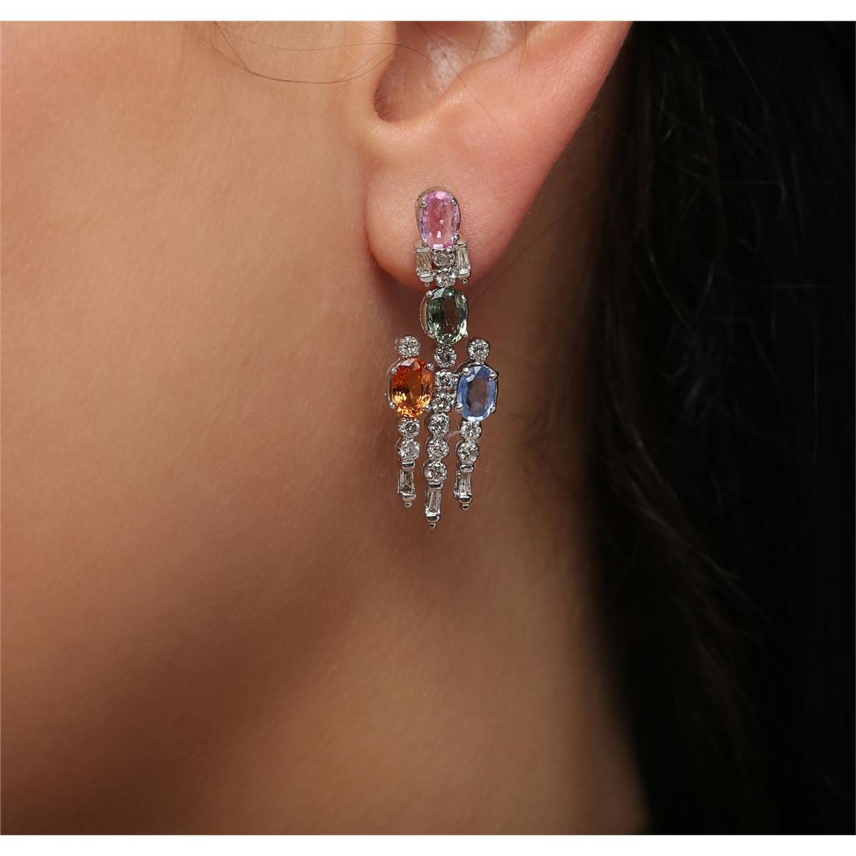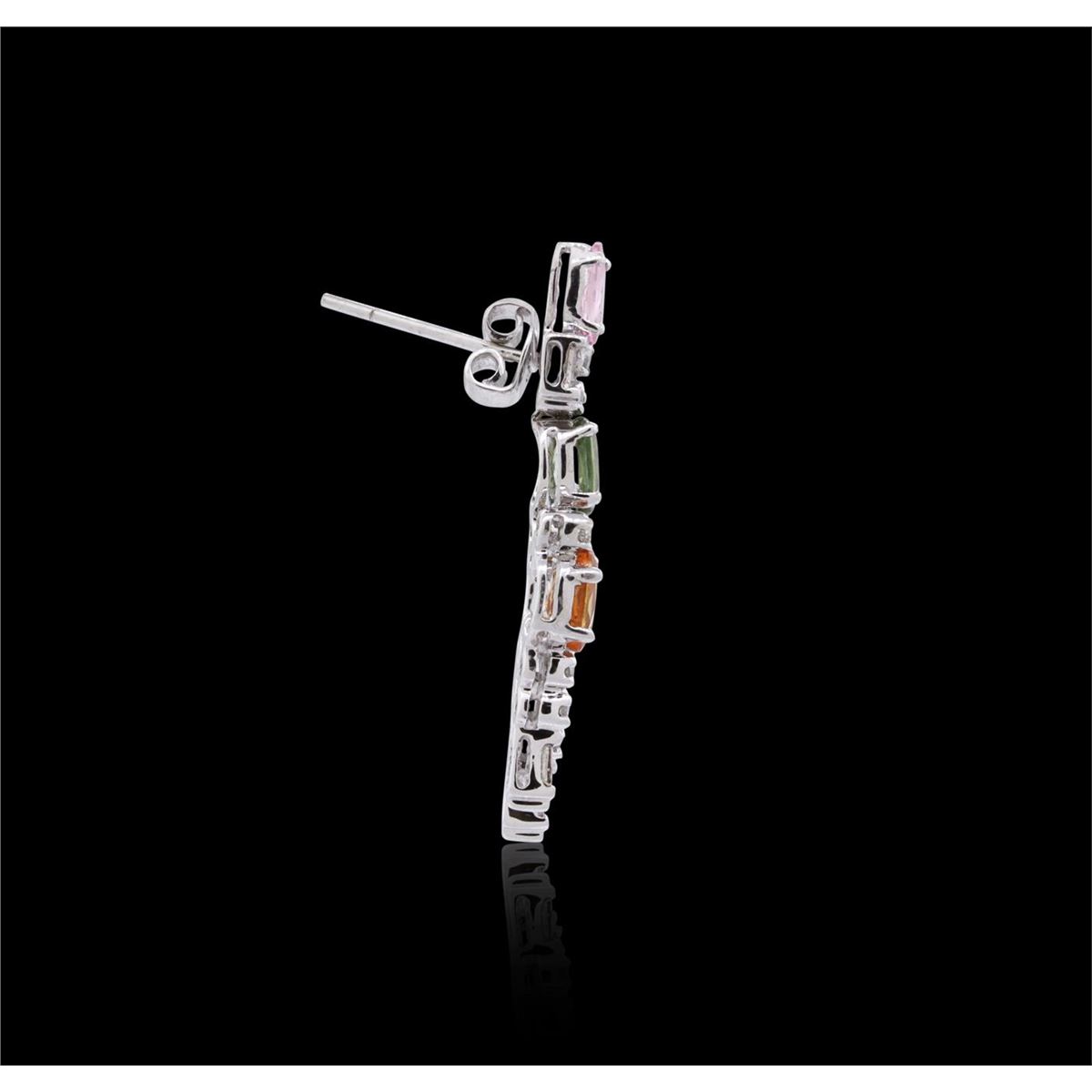 One pair of earrings featuring: 14KT white gold weighing 6.80 grams containing multi-colored sapphires with a total weight of 4.03cts and baguette/round cut diamonds with a total weight of 0.95cts.