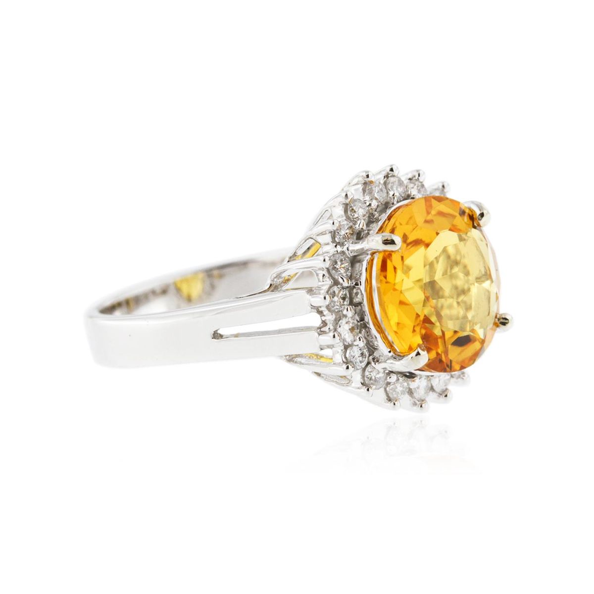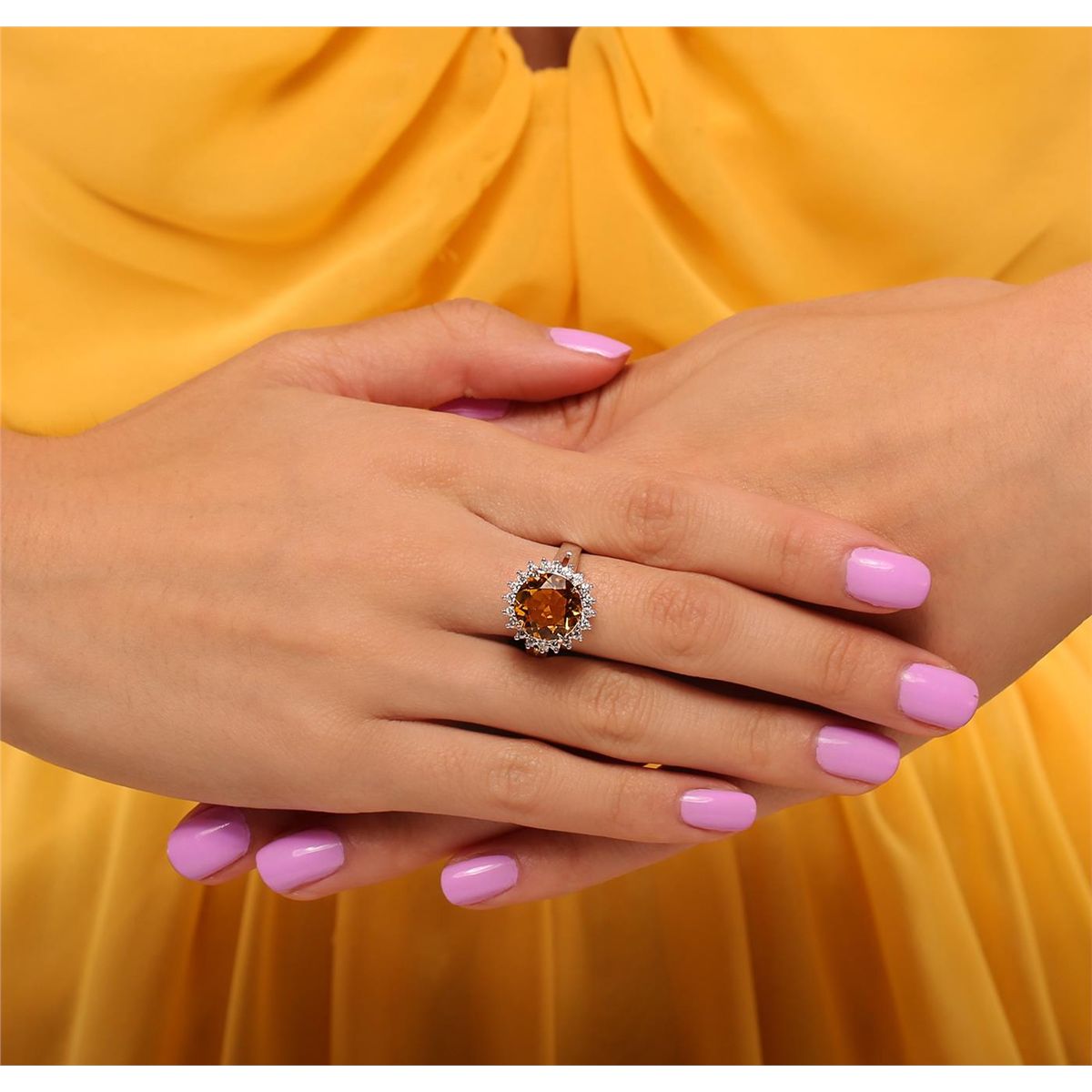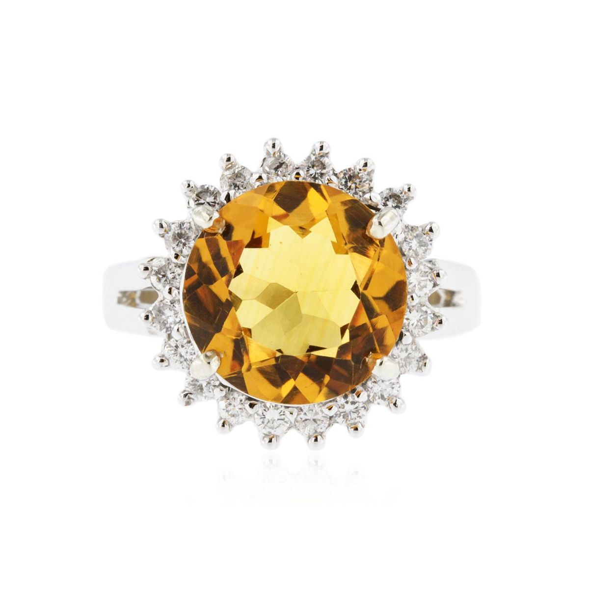 One electronically tested 14KT white gold ladies cast citrine and diamond ring with a bright polish finish. Condition is new, good workmanship. The featured citrine is set within a diamond bezel, supported by split shoulders and completed by a three millimeter wide band. Trademark is Orianne. Identified with markings of "14K". Containing: One prong set round mixed cut natural citrine quartz, measuring 11.00 - 11.00 x 5.80 mm, 8%. bulge factor, approximate weight of 4.03ct., clarity is eye clean, type I, medium dark, slightly brownish, orangy yellow color, (GIA oY 6/2), cut is good. Transmitting light with no distortion, transparent. Graded in the setting. Twenty prong set round brilliant cut diamonds, measuring 1.70 - 1.70 x 1.02mm (depth est.) approximate. Total Weight of 20 Stones = 0.45ct. Graded in the setting. Clarity: I-1 to I-2. Color: G - I. Total Weight of Colored Stones 4.03ct. Total Weight of Diamonds 0.45ct. Total Weight of Ring 6.9 grams. AIG Appraised at $2,515.00.