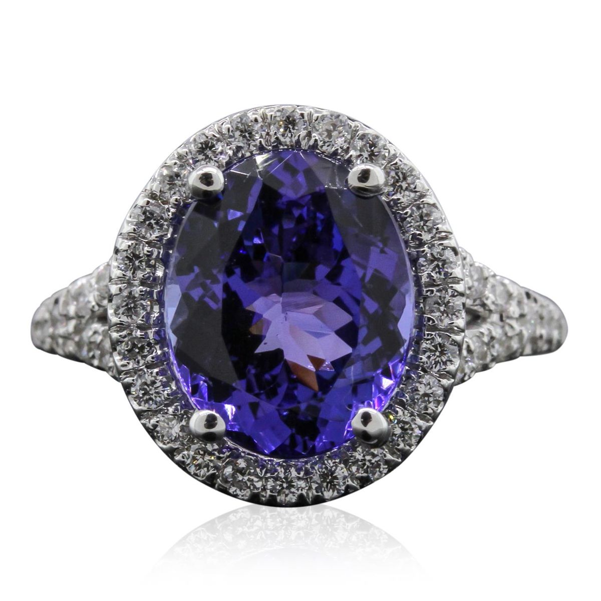 One electronically tested 14KT white gold Ladies combination cast & assembled fashion ring with a bright polish finish. Condition is new. Identified with markings of "14K". Containing: One prong set oval modified brilliant cut natural tanzanite, measuring 11.00 x 9.10 x 5.70mm, approximate weight of 4.03ct., clarity is eye clean, type I, medium, moderately strong, violetish blue color, (GIA vB 5/4), cut is very good. Forty-Eight bead set round brilliant cut diamonds, measuring 1.50 - 1.50 x 0.90mm (depth est.) approximate total weight of 48 Stones = 0.55ct. Clarity of SI-2 to I-1, Color of I - J, Cut is Very Good. Total Weight of Colored Stones 4.03ct. Total Weight of Diamonds 0.55ct. Total Weight of Ring 4.50gm. GGL Appraised at $8,450.00.