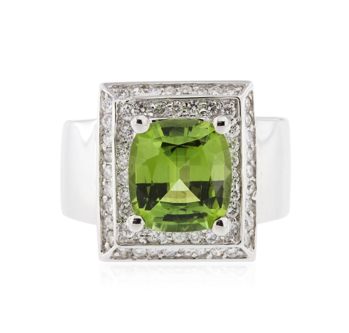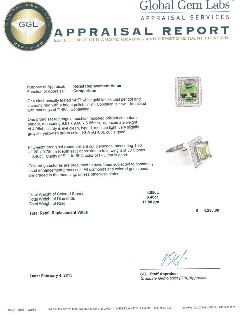 One electronically tested 14KT white gold ladies cast peridot and diamond ring with a bright polish finish. Identified with markings of "14K". Condition is new. Containing: One prong set rectangular cushion modified brilliant cut natural peridot, measuring 9.81 x 9.00 x 5.85mm, approximate weight of 4.05ct., clarity is eye clean, type II, medium light, very slightly grayish, yellowish green color, (GIA yG 4/3), cut is good. Fifty-Eight prong set round brilliant cut diamonds, measuring 1.30 - 1.30 x 0.78mm (depth est.) approximate total weight of 58 Stones = 0.46ct. Clarity: SI-1 to SI-2. Color: I - J, Cut is Good. Colored gemstones are presumed to have been subjected to commonly used enhancement processes. All diamonds and colored gemstones are graded in the mounting, unless otherwise stated. Total Weight of Colored Stones 4.05ct. Total Weight of Diamonds 0.46ct. Total Weight of Ring 11.80 grams. GGL Appraised at $4,290.00.