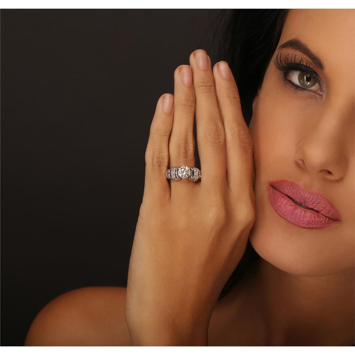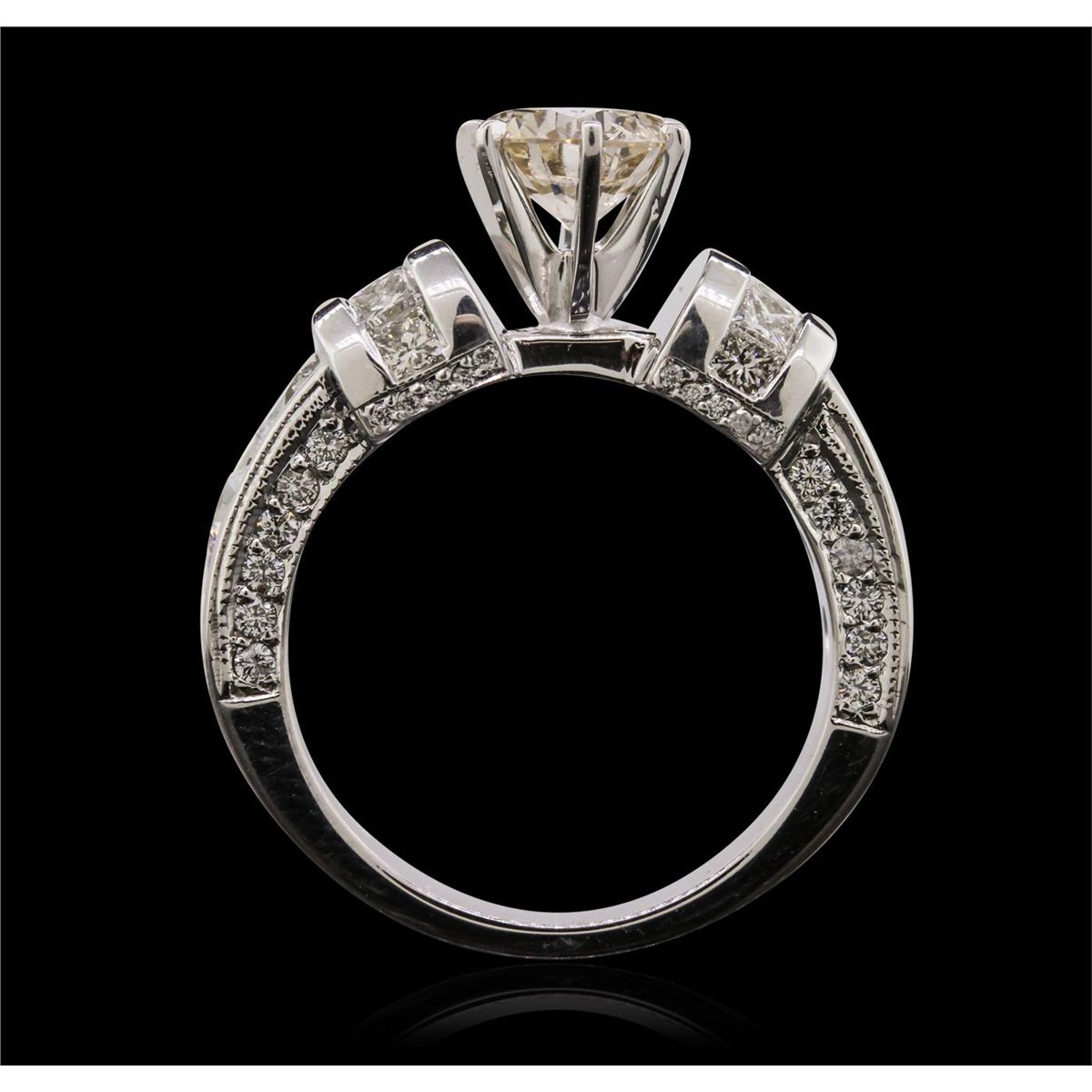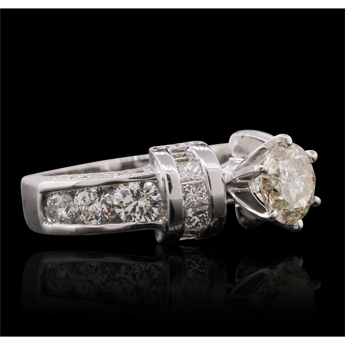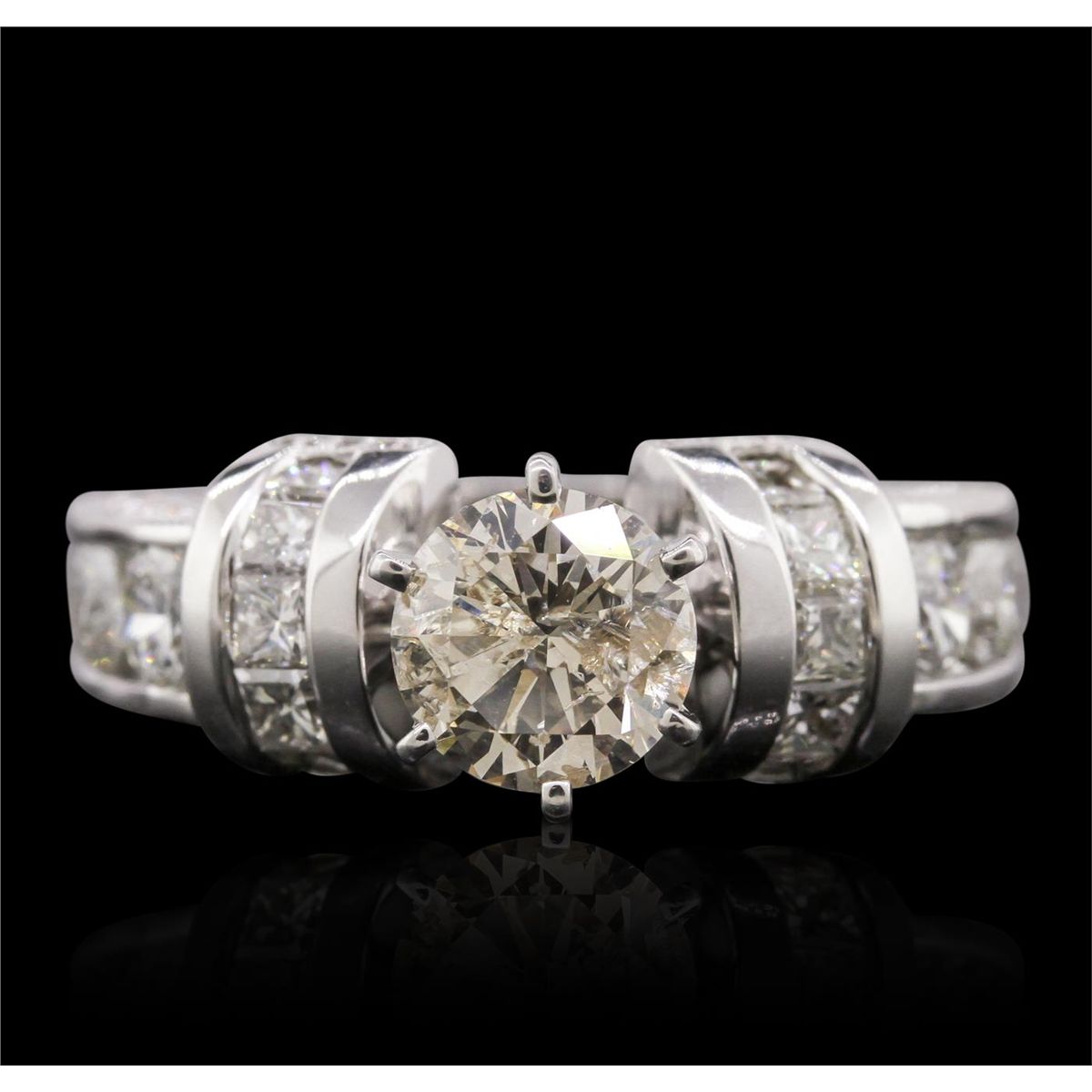 One electronically tested 14KT white gold ladies cast diamond unity ring. The featured diamond is supported by elaborate diamond set shoulders, completed by a four millimeter wide band. Bright polish finish with milgrain detailing. Identified with markings of ""14K"". Condition is good. Containing: One prong set round brilliant cut diamond, measuring 6.90 - 6.85 x 4.50mm (depth est.) approximate weight of 1.39ct with a medium strong blue fluorescence. Faint brown secondary color throughout. Graded in the setting. Clarity: I-1. Color: M Depth 65.4%. Table 64.0%. Two channel set round brilliant cut diamonds, measuring 4.20 - 4.20 x 2.55mm (depth est.) approximate. Total Weight of 2 Stones = 0.64ct. Graded in the setting. Clarity: VS-1 to SI-1. Color: H - I Four channel set round brilliant cut diamonds, measuring 3.70 - 3.40 x 2.13mm (depth est.) approximate. Total Weight of 4 Stones = 0.75ct. Graded in the setting. Clarity: VS-1 to SI-1. Color: H - I Twenty-Four bead set round brilliant cut diamonds, measuring 1.50 - 1.40 x 0.87mm (depth est.) approximate. Total Weight of 24 Stones = 0.36ct. The clarity grade reflects the entire range of clarity for this group. Graded in the setting. Clarity: VS-2 to I-1. Color: H - J Twenty bead set round brilliant cut diamonds, measuring 0.90 - 0.80 x 0.51mm (depth est.) approximate. Total Weight of 20 Stones = 0.10ct. Graded in the setting. Clarity: SI-1 to I-1. Color: H - J Ten channel set princess cut diamonds, measuring 2.40 x 2.20 x 1.65mm (depth est.) approximate. Total Weight of 10 Stones = 0.81ct. Graded in the setting. Clarity: SI-1 to I-1. Color: J - L. Total Weight of Diamonds 4.05ct. Total Weight of Ring 10.17 grams. AIG Appraised at $26,065.00.