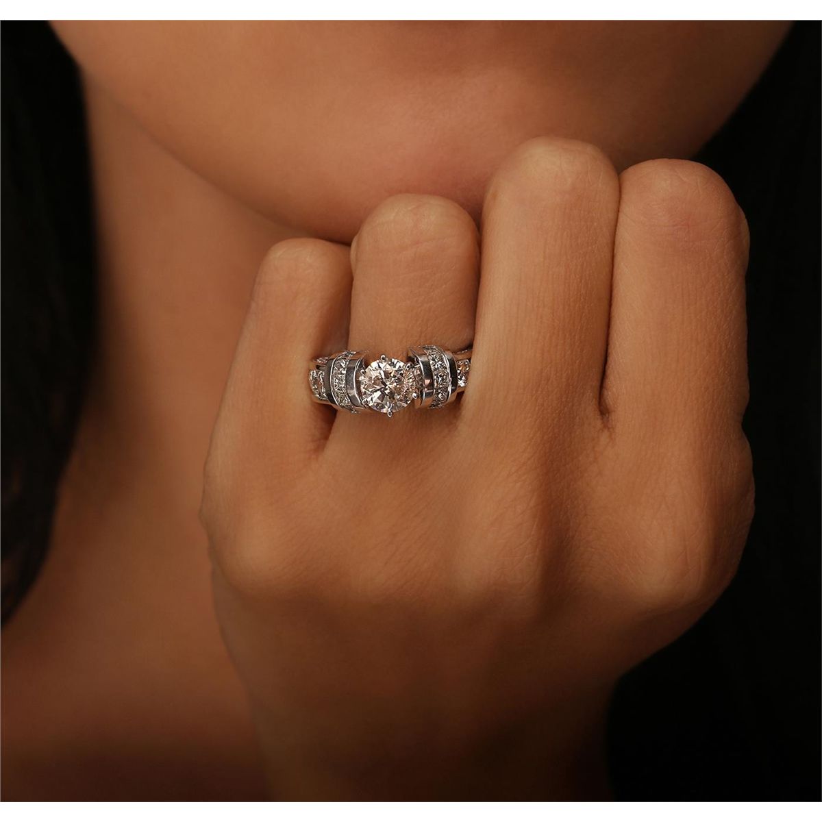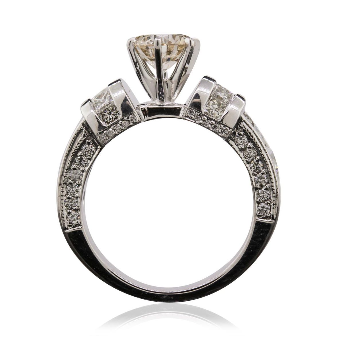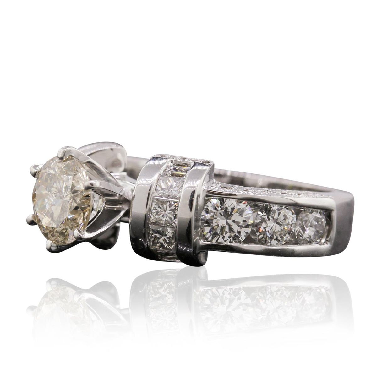One electronically tested 14KT white gold ladies cast diamond unity ring. The featured diamond is supported by elaborate diamond set shoulders, completed by a four millimeter wide band. Bright polish finish with milgrain detailing. Identified with markings of ""14K"". Condition is good. Containing: One prong set round brilliant cut diamond, measuring 6.90 - 6.85 x 4.50mm (depth est.) approximate weight of 1.39ct with a medium strong blue fluorescence. Faint brown secondary color throughout. Graded in the setting. Clarity: I-1. Color: M Depth 65.4%. Table 64.0%. Two channel set round brilliant cut diamonds, measuring 4.20 - 4.20 x 2.55mm (depth est.) approximate. Total Weight of 2 Stones = 0.64ct. Graded in the setting. Clarity: VS-1 to SI-1. Color: H - I Four channel set round brilliant cut diamonds, measuring 3.70 - 3.40 x 2.13mm (depth est.) approximate. Total Weight of 4 Stones = 0.75ct. Graded in the setting. Clarity: VS-1 to SI-1. Color: H - I Twenty-Four bead set round brilliant cut diamonds, measuring 1.50 - 1.40 x 0.87mm (depth est.) approximate. Total Weight of 24 Stones = 0.36ct. The clarity grade reflects the entire range of clarity for this group. Graded in the setting. Clarity: VS-2 to I-1. Color: H - J Twenty bead set round brilliant cut diamonds, measuring 0.90 - 0.80 x 0.51mm (depth est.) approximate. Total Weight of 20 Stones = 0.10ct. Graded in the setting. Clarity: SI-1 to I-1. Color: H - J Ten channel set princess cut diamonds, measuring 2.40 x 2.20 x 1.65mm (depth est.) approximate. Total Weight of 10 Stones = 0.81ct. Graded in the setting. Clarity: SI-1 to I-1. Color: J - L. Total Weight of Diamonds 4.05ct. Total Weight of Ring 10.17 grams. AIG Appraised at $26,065.00.