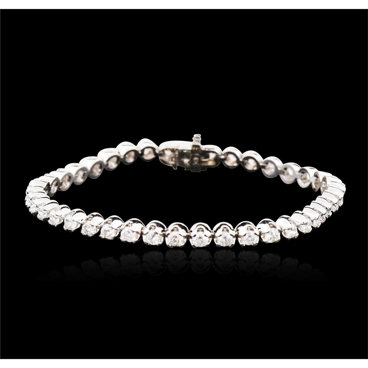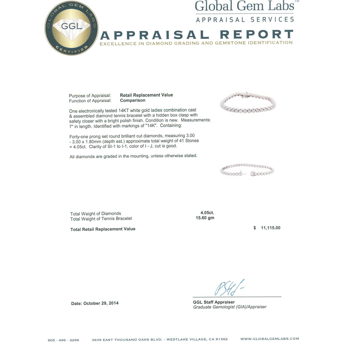 One electronically tested 14KT white gold ladies combination cast & assembled diamond tennis bracelet with a hidden box clasp with safety closer with a bright polish finish. Measurements: 7 in length. Identified with markings of 14K. Condition is new. Containing: Forty-One prong set round brilliant cut diamonds, measuring 3.00 - 3.00 x 1.80mm (depth est.) approximate total weight of 41 Stones = 4.05ct. Clarity: SI-1 to I-1. Color: I - J, Cut is Good. All diamonds are graded in the mounting, unless otherwise stated. Total Weight of Diamonds 4.05ct. Total Weight of Tennis Bracelet 15.60 grams. GGL Appraised at $11,115.00.