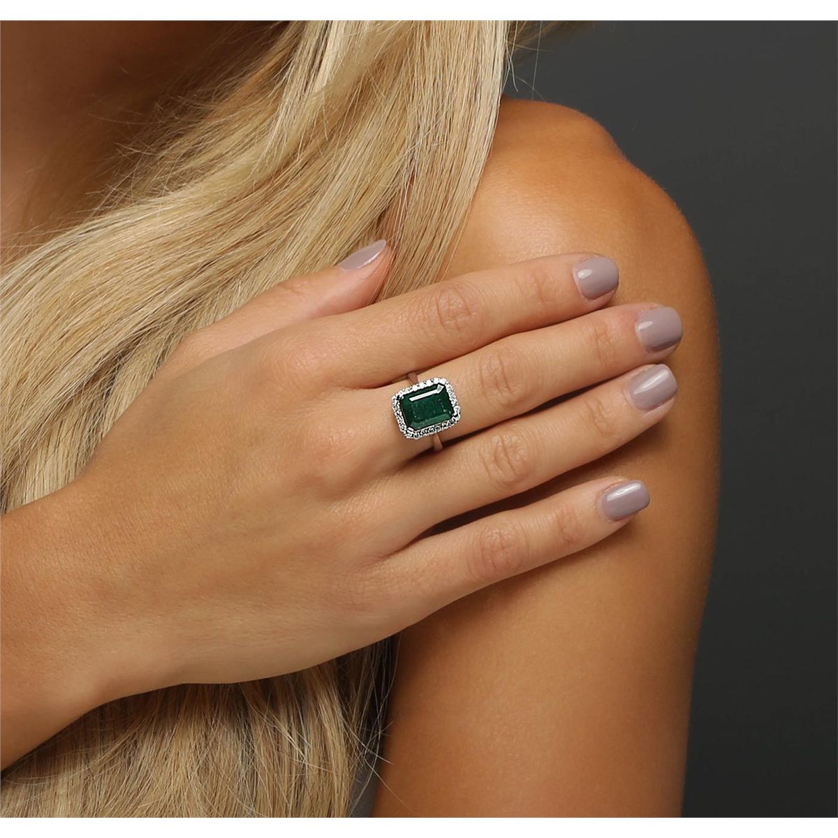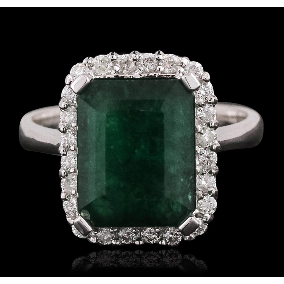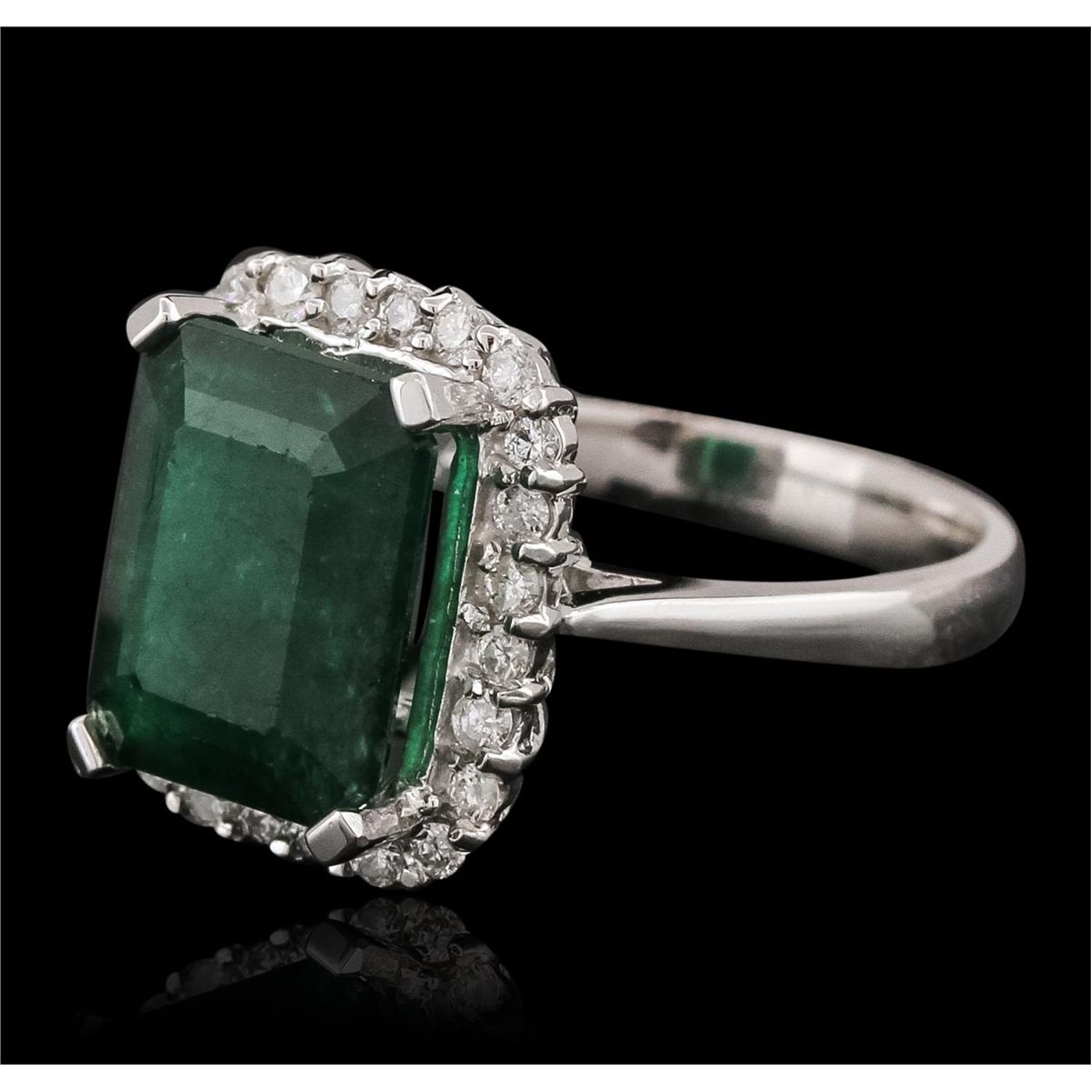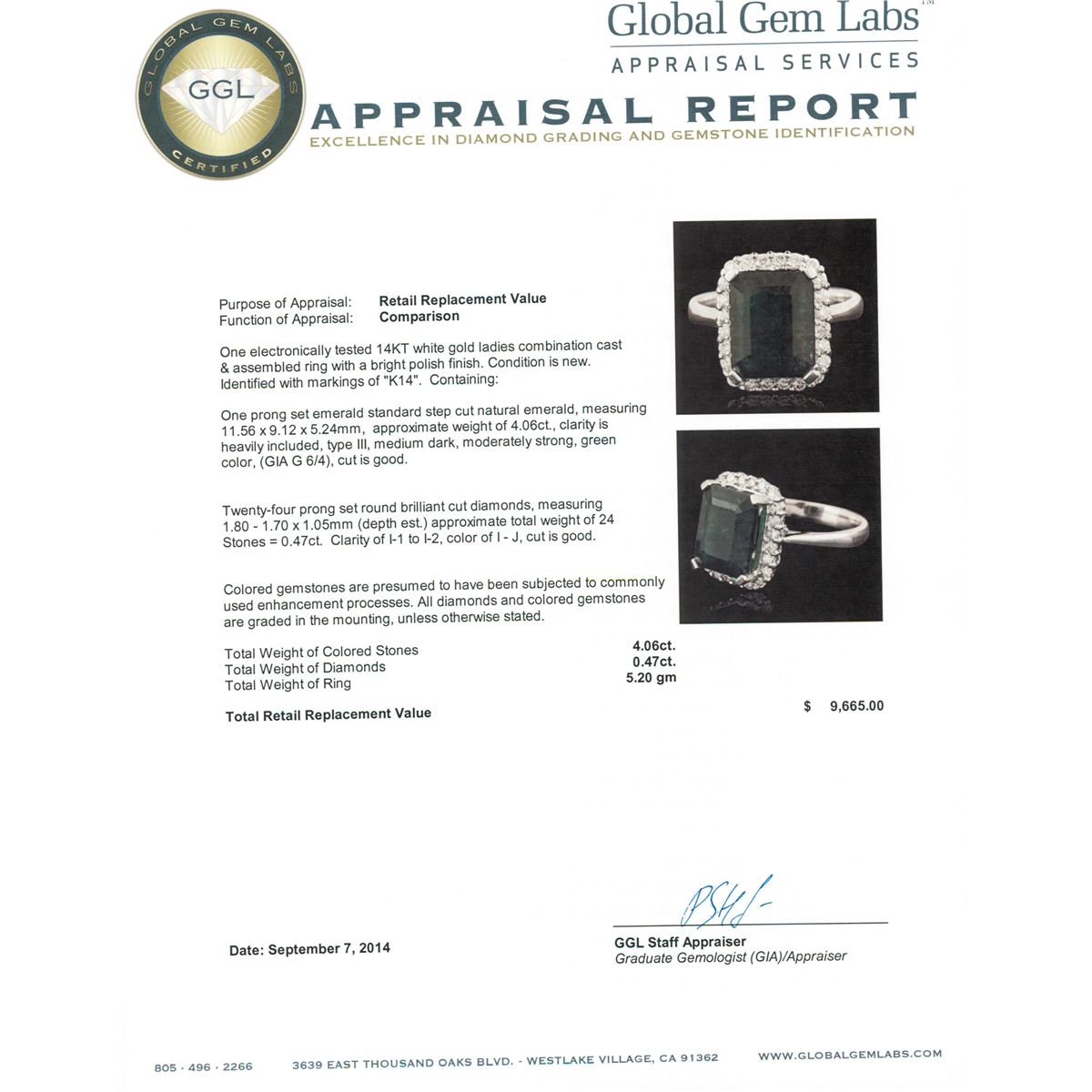 One electronically tested 14KT white gold ladies combination cast & assembled ring with a bright polish finish. Identified with markings of "K14". Condition is new. Containing: One prong set emerald standard step cut natural emerald, measuring 11.56 x 9.12 x 5.24mm, approximate weight of 4.06ct., clarity is heavily included, type III, medium dark, moderately strong, green color, (GIA G 6/4), cut is good. Twenty-Four prong set round brilliant cut diamonds, measuring 1.80 - 1.70 x 1.05mm (depth est.) approximate total weight of 24 Stones = 0.47ct. Clarity: I-1 to I-2. Color: I - J, Cut is Good. Colored gemstones are presumed to have been subjected to commonly used enhancement processes. All diamonds and colored gemstones are graded in the mounting, unless otherwise stated. Total Weight of Colored Stones 4.06ct. Total Weight of Diamonds 0.47ct. Total Weight of Ring 5.20 grams. GGL Appraised at $9,665.00.