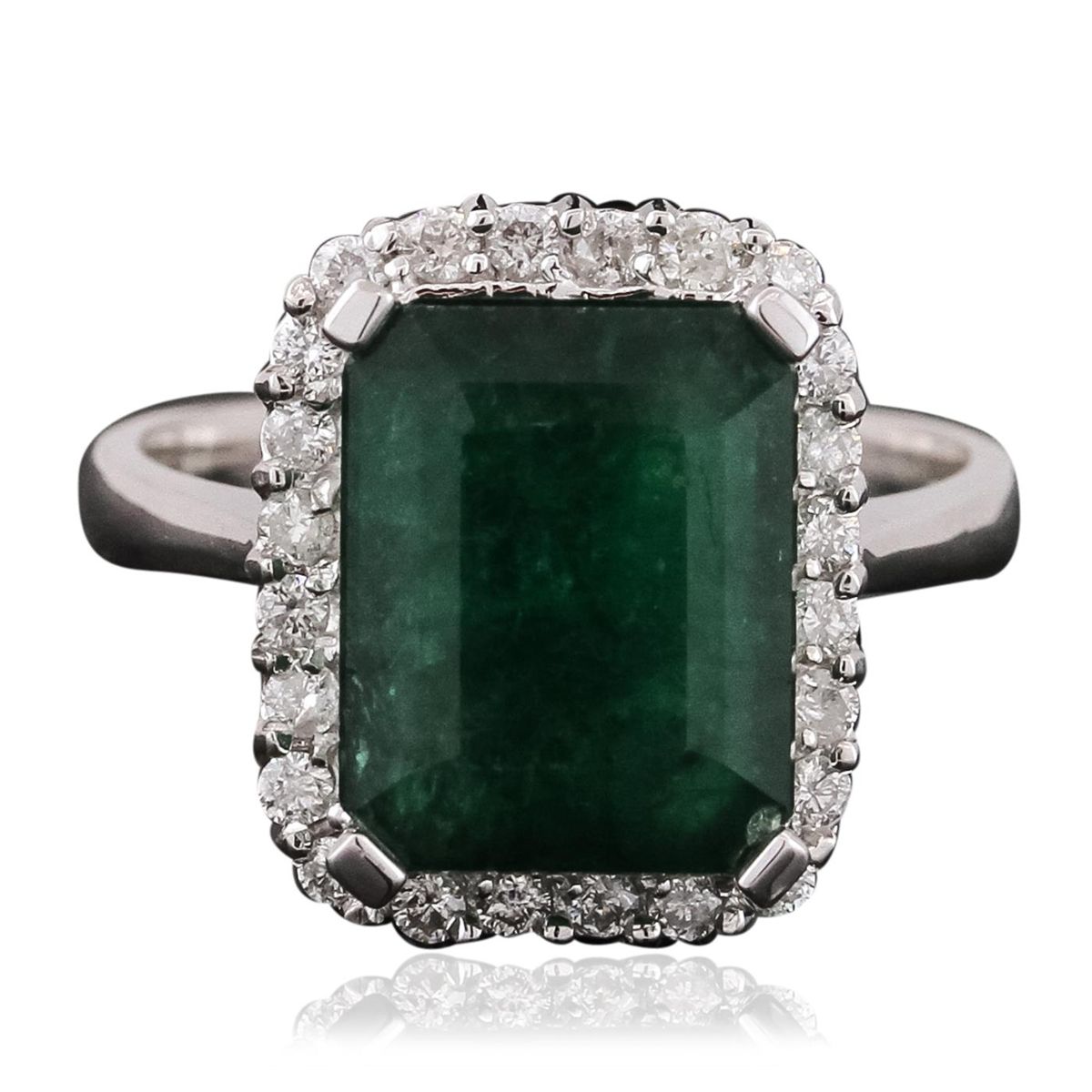 One electronically tested 14KT white gold ladies combination cast & assembled ring with a bright polish finish. Identified with markings of "K14". Condition is new. Containing: One prong set emerald standard step cut natural emerald, measuring 11.56 x 9.12 x 5.24mm, approximate weight of 4.06ct., clarity is heavily included, type III, medium dark, moderately strong, green color, (GIA G 6/4), cut is good. Twenty-Four prong set round brilliant cut diamonds, measuring 1.80 - 1.70 x 1.05mm (depth est.) approximate total weight of 24 Stones = 0.47ct. Clarity: I-1 to I-2. Color: I - J, Cut is Good. Colored gemstones are presumed to have been subjected to commonly used enhancement processes. All diamonds and colored gemstones are graded in the mounting, unless otherwise stated. Total Weight of Colored Stones 4.06ct. Total Weight of Diamonds 0.47ct. Total Weight of Ring 5.20 grams. GGL Appraised at $9,665.00.