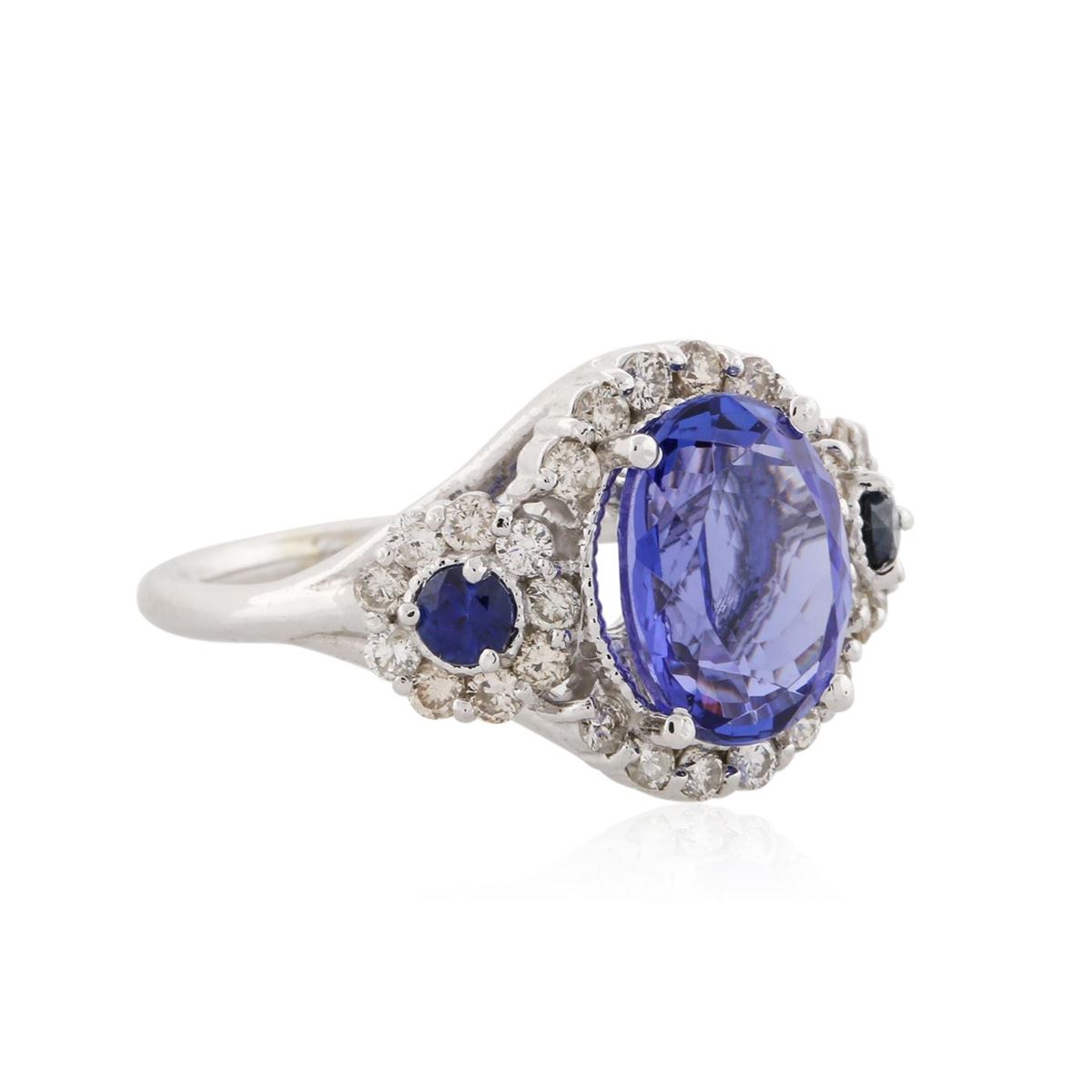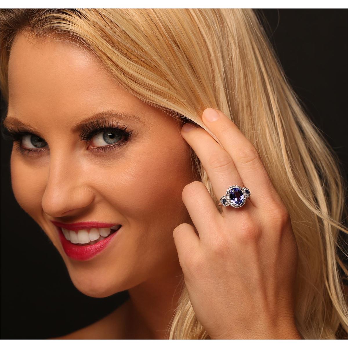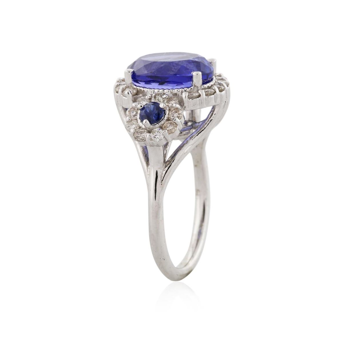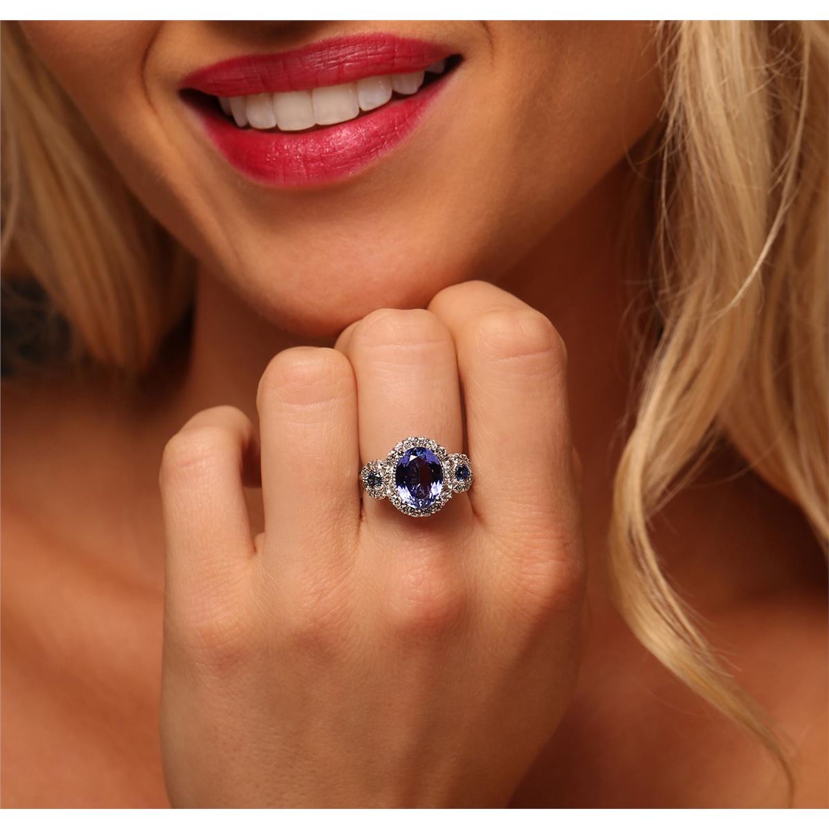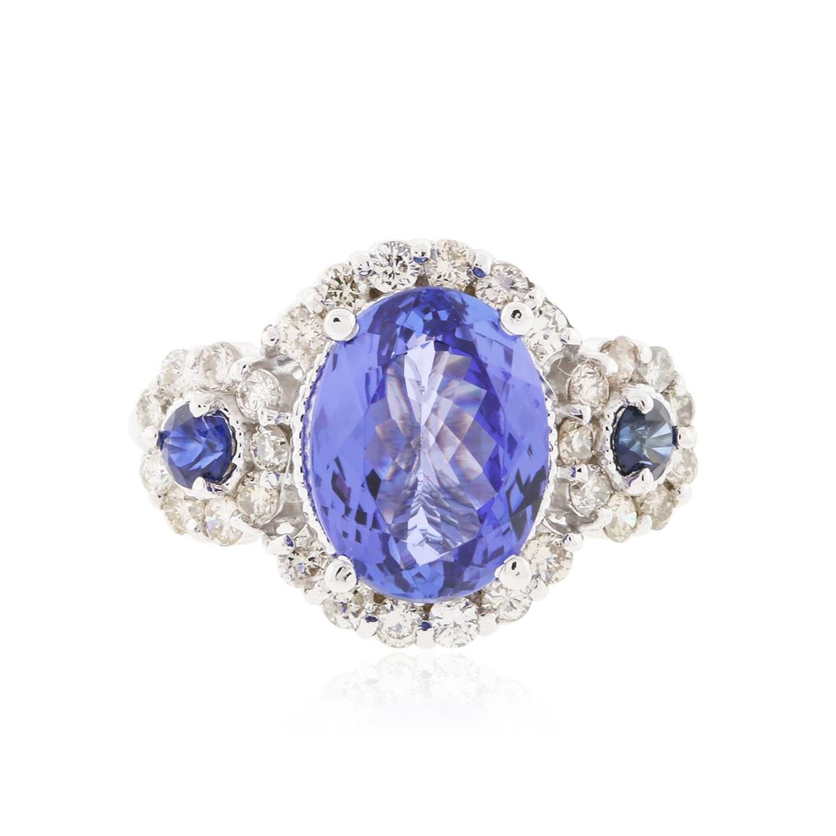 One electronically tested 14KT white gold ladies cast tanzanite and diamond ring with a bright polish finish. Condition is new, good workmanship. The featured tanzanite is set within a diamond bezel, supported by sapphire and diamond bezels, completed by a two millimeter wide band. Identified with markings of "14K". Containing: One prong set oval mixed cut natural tanzanite, measuring 11.00 x 8.25 x 5.30mm, 10%. bulge factor, approximate weight of 4.08ct., clarity is eye clean, type I, medium, very slightly grayish, bluish violet color, (GIA bV 5/3), cut is good. Transmitting light with no distortion, transparent. Graded in the setting. Tanzanite is a very rare gemstone that is only found in the country of Tanzania. Originally discovered in 1967. Tiffany & Company, named the stone Tanzanite. It is found in the Usumburu Mountains that border the Umba Valley of northern Tanzania. Tanzanite occurs in gray, brown, violet, blue, reddish-purple, & green. The gem is interesting because of its exceptional pleochroism. Rotated in different directions a tanzanite will exhibit multiple changes of color. Tanzanite has a low tolerance to ultrasonic cleaning, and should not be cleaned using this method. Two prong set round brilliant cut natural blue sapphires, measuring 3.10 - 3.10 x 2.02 mm, approximate. Total Weight of 0.33ct., clarity is slightly included, type II, medium dark, moderately strong, violetish blue color, (GIA vB 6/4), cut is good. Transmitting light with a minimum of distortion, transparent. Naturally occurring internal & external characteristics are present, including partial color zoning present. Color grade is an average for the group. Graded in the setting. Thirty prong set round brilliant cut diamonds, measuring 1.80 - 1.80 x 1.08mm (depth est.) approximate. Total Weight of 30 Stones = 0.84ct. Graded in the setting. Clarity: SI-2 to I-1. Color: G - I. Total Weight of Colored Stones 4.41ct. Total Weight of Diamonds 0.84ct. Total Weight of Ring 6.50 grams. AIG Appraised at $13,135.00.