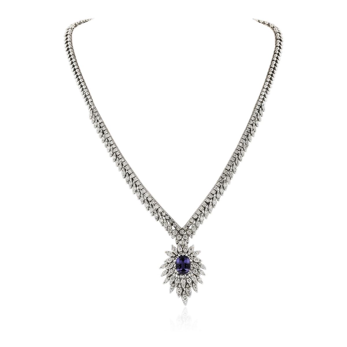 One electronically tested 14KT white gold ladies cast & assembled tanzanite and diamond necklace. Sixteen inch length chevron style necklace features a pendant consisting of a tanzanite set within cascading diamond ribbons supported by a diamond set fringe transitioning into matching white gold links, terminating in a concealed clasp with safety. Bright polish finish. Identified with markings of "K14". Condition is new, good workmanship. Containing: One prong set rectangular cushion mixed cut natural tanzanite, measuring 9.95 x 8.05 x 6.10mm, 6% bulge factor, approximate weight of 4.08ct., clarity is eye clean, type I, medium, very slightly grayish, bluish violet color, (GIA bV 5/3), cut is good. Transmitting light with no distortion, transparent. Graded in the setting. Tanzanite is a very rare gemstone that is only found in the country of Tanzania. Originally discovered in 1967. Tiffany & Company, named the stone Tanzanite. It is found in the Usumburu Mountains that border the Umba Valley of northern Tanzania. Tanzanite occurs in gray, brown, violet, blue, reddish-purple, & green. The gem is interesting because of its exceptional pleochroism. Rotated in different directions a tanzanite will exhibit multiple changes of color. Tanzanite has a low tolerance to ultrasonic cleaning, and should not be cleaned using this method. One Hundred Forty-Six prong set round brilliant cut diamonds, measuring 2.70 - 2.10 x 1.44mm (depth est.) approximate total weight of 146 Stones = 7.48ct. Graded in the setting. Clarity: SI-1 to I-1. Color: H - J One Hundred Fifty-Eight prong set round brilliant cut diamonds, measuring 1.30 - 1.10 x 0.72mm (depth est.) approximate total weight of 158 Stones = 1.09ct. Graded in the setting. Clarity: SI-1 to I-1. Color: H - J. Total Weight of Colored Stones 4.08ct. Total Weight of Diamonds 8.57ct. Total Weight of Necklace 40.01 grams. AIG Appraised at $41,585.00.