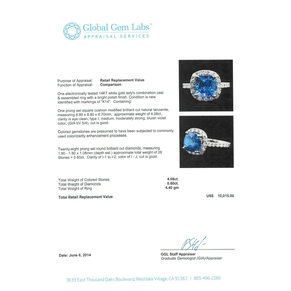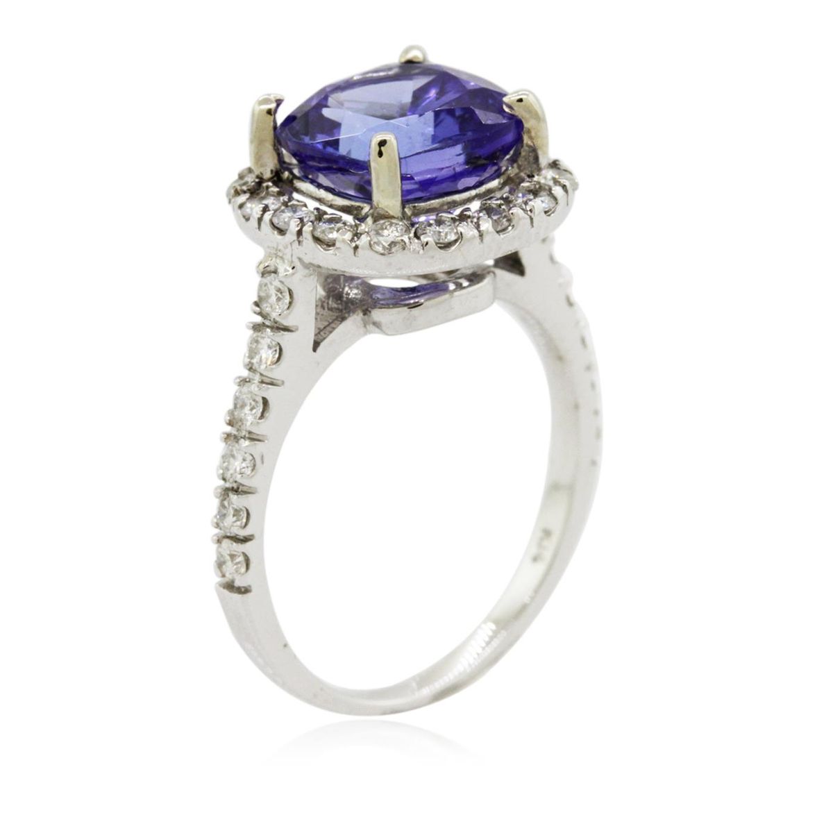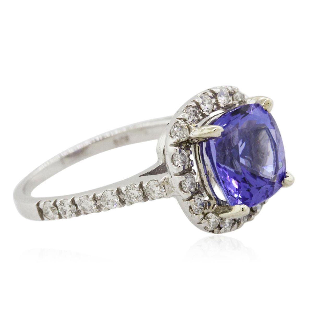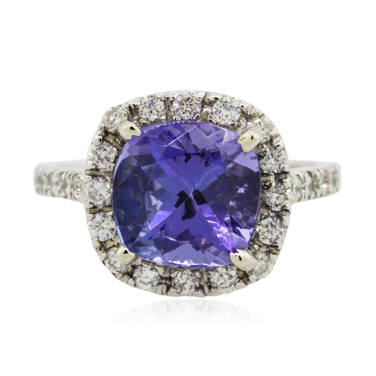 One electronically tested 14KT white gold Ladies combination cast & assembled ring with a bright polish finish. Condition is new. Identified with markings of "K14". Containing: One prong set square cushion modified brilliant cut natural tanzanite, measuring 8.80 x 8.80 x 6.70mm, approximate weight of 4.08ct., clarity is eye clean, type I, medium, moderately strong, bluish violet color, (GIA bV 5/4), cut is good. Colored gemstones are presumed to have been subjected to commonly used color/clarity enhancement processes. Twenty-Eight prong set round brilliant cut diamonds, measuring 1.80 - 1.80 x 1.08mm (depth est.) approximate. Total Weight of 28 Stones = 0.60ct. Clarity: I-1 to I-2. Color: I - J, Cut is Good. Total Weight of Colored Stones 4.08ct. Total Weight of Diamonds 0.60ct. Total Weight of Ring 4.40 grams. GGL Appraised at $10,015.00.