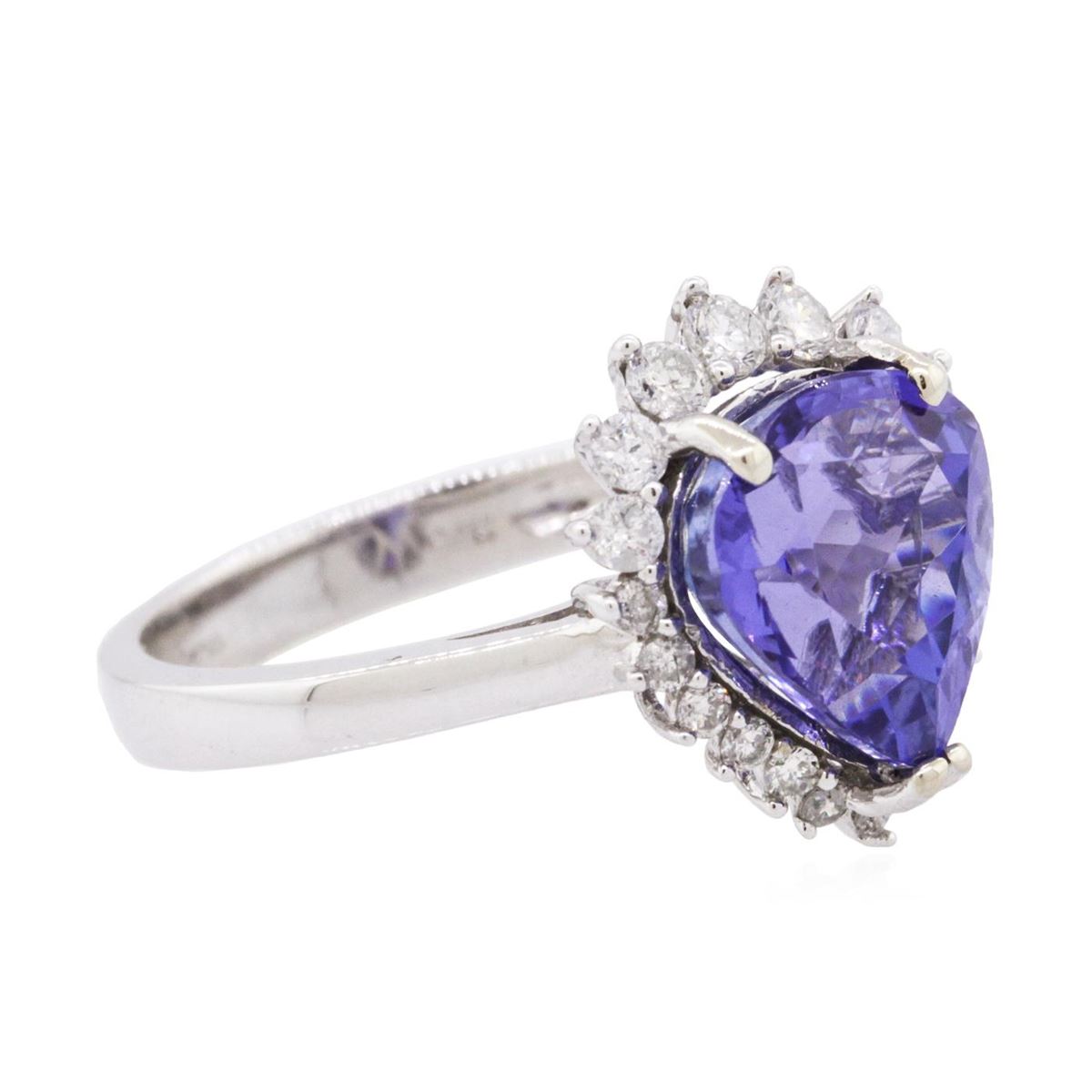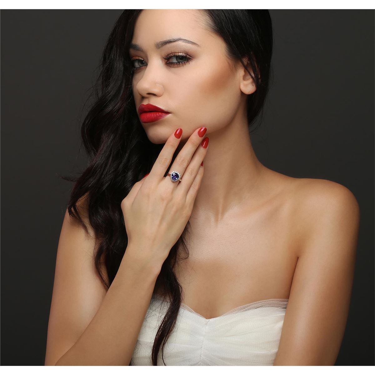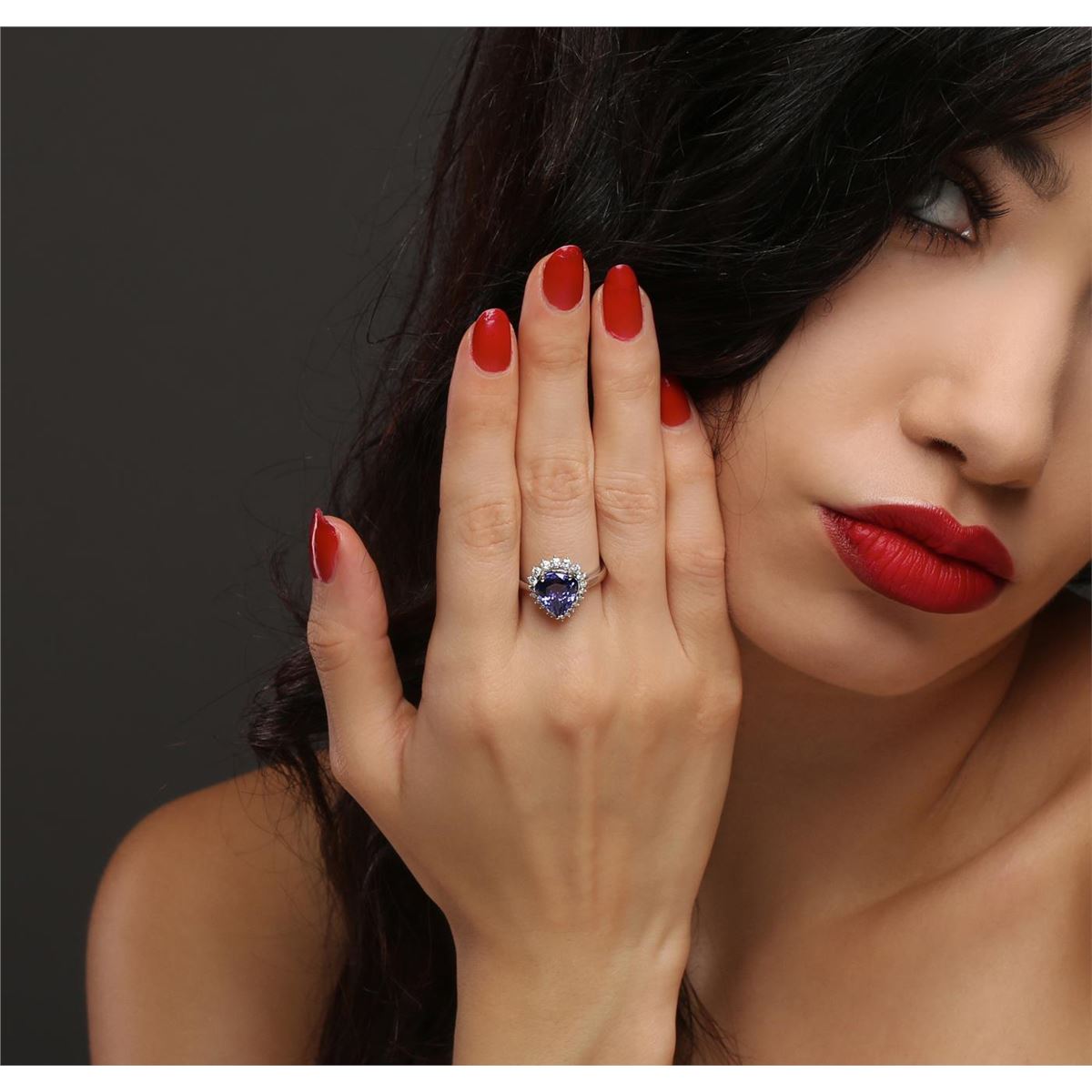 One electronically tested 14KT white gold ladies cast & assembled tanzanite and diamond ring with a bright polish finish. The featured tanzanite is set within a diamond bezel , completed by a two and one-half millimeter wide band. Trademark is Orianne. Identified with markings of "14K". Condition is new, good workmanship. Containing: One prong set pear brilliant cut natural tanzanite, measuring 10.00 x 9.20 x 6.25mm, 6% bulge factor, approximate weight of 4.08ct., clarity is eye clean, type I, medium dark, very slightly grayish, bluish violet color, (GIA bV 6/3), cut is good. Transmitting light with no distortion, transparent. Graded in the setting. Tanzanite is a very rare gemstone that is only found in the country of Tanzania. Originally discovered in 1967. Tiffany & Company, named the stone Tanzanite. It is found in the Usumburu Mountains that border the Umba Valley of northern Tanzania. Tanzanite occurs in gray, brown, violet, blue, reddish-purple, & green. The gem is interesting because of its exceptional pleochroism. Rotated in different directions a tanzanite will exhibit multiple changes of color. Tanzanite has a low tolerance to ultrasonic cleaning, and should not be cleaned using this method. Seven prong set round brilliant cut diamonds, measuring 2.20 - 1.80 x 1.20mm (depth est.) approximate total weight of 7 Stones = 0.30ct. Graded in the setting. Clarity: SI-2 to I-2. Color: H - J Thirteen prong set round brilliant cut diamonds, measuring 1.50 - 1.40 x 0.87mm (depth est.) approximate total weight of 13 Stones = 0.24ct. Graded in the setting. Clarity: I-1 to I-2. Color: H - J. Total Weight of Colored Stones 4.08ct. Total Weight of Diamonds 0.54ct. Total Weight of Ring 3.60 grams. AIG Appraised at $12,050.00.