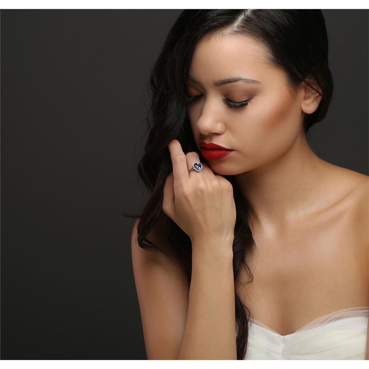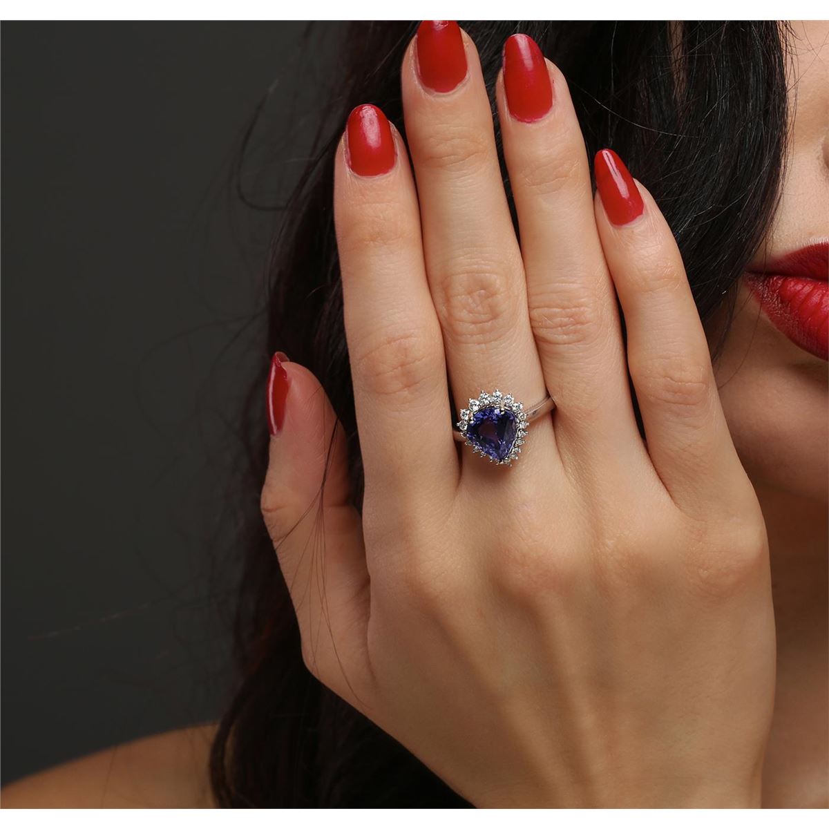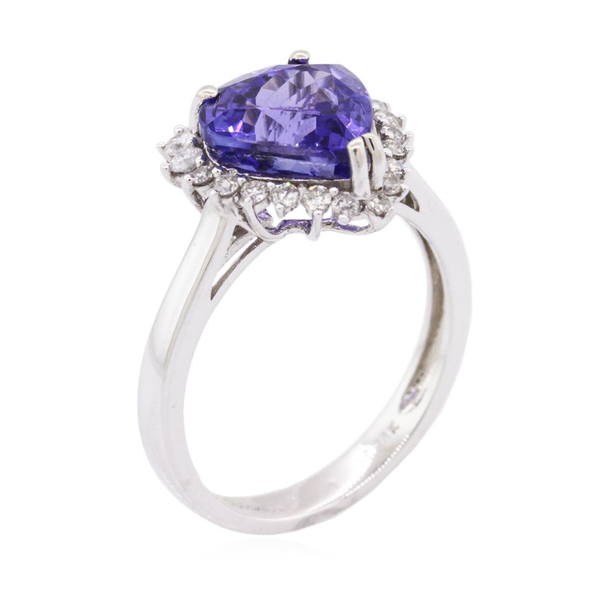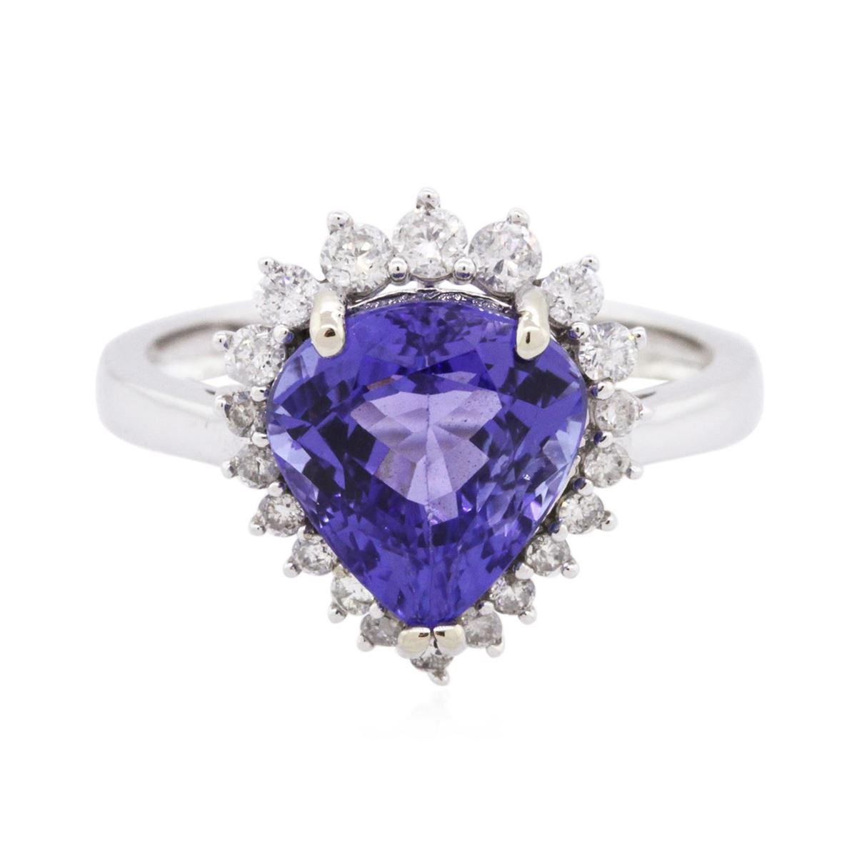 One electronically tested 14KT white gold ladies cast & assembled tanzanite and diamond ring with a bright polish finish. The featured tanzanite is set within a diamond bezel , completed by a two and one-half millimeter wide band. Trademark is Orianne. Identified with markings of "14K". Condition is new, good workmanship. Containing: One prong set pear brilliant cut natural tanzanite, measuring 10.00 x 9.20 x 6.25mm, 6% bulge factor, approximate weight of 4.08ct., clarity is eye clean, type I, medium dark, very slightly grayish, bluish violet color, (GIA bV 6/3), cut is good. Transmitting light with no distortion, transparent. Graded in the setting. Tanzanite is a very rare gemstone that is only found in the country of Tanzania. Originally discovered in 1967. Tiffany & Company, named the stone Tanzanite. It is found in the Usumburu Mountains that border the Umba Valley of northern Tanzania. Tanzanite occurs in gray, brown, violet, blue, reddish-purple, & green. The gem is interesting because of its exceptional pleochroism. Rotated in different directions a tanzanite will exhibit multiple changes of color. Tanzanite has a low tolerance to ultrasonic cleaning, and should not be cleaned using this method. Seven prong set round brilliant cut diamonds, measuring 2.20 - 1.80 x 1.20mm (depth est.) approximate total weight of 7 Stones = 0.30ct. Graded in the setting. Clarity: SI-2 to I-2. Color: H - J Thirteen prong set round brilliant cut diamonds, measuring 1.50 - 1.40 x 0.87mm (depth est.) approximate total weight of 13 Stones = 0.24ct. Graded in the setting. Clarity: I-1 to I-2. Color: H - J. Total Weight of Colored Stones 4.08ct. Total Weight of Diamonds 0.54ct. Total Weight of Ring 3.60 grams. AIG Appraised at $12,050.00.