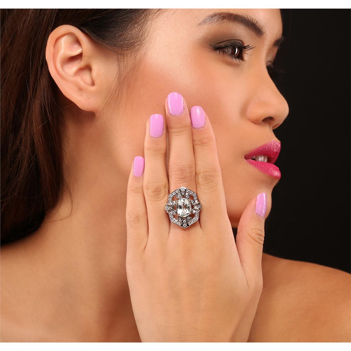 One electronically tested 14KT white gold ladies cast aquamarine & diamond ring with a bright polish finish. Condition is new, good workmanship. The featured aquamarine is set within a diamond set shield style bezel completed by three millimeter wide band. Identified with markings of "14K". Containing: One prong set oval mixed cut natural aquamarine, measuring 12.00 x 8.80 x 6.50mm, 7%. bulge factor, approximate weight of 4.09ct., clarity is eye clean, type I, medium light, slightly grayish, very slightly greenish blue color, (GIA vslgB 4/2), cut is good. Transmitting light with no distortion, transparent. Refractive index testing results of 1.55 to 1.56. This is a conclusive result for (beryl) aquamarine. Graded in the setting. Thirty-Six prong set round brilliant cut diamonds, measuring 2.30 - 1.80 x 1.25mm (depth est.) approximate. Total Weight of 36 Stones = 1.25ct. Graded in the setting. Clarity: SI-2 to I-1. Color: F - H. Total Weight of Colored Stones 4.09ct. Total Weight of Diamonds 1.25ct. Total Weight of Ring 8.96 grams. AIG Appraised at $7,300.00.