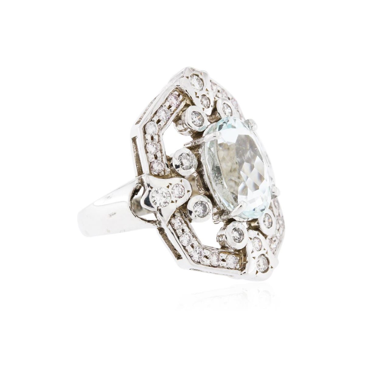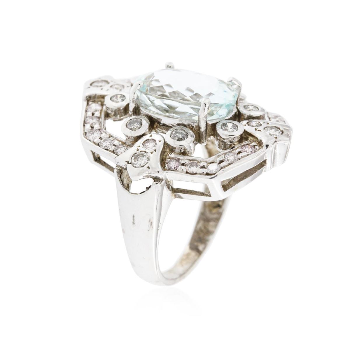 One electronically tested 14KT white gold ladies cast aquamarine & diamond ring with a bright polish finish. Condition is new, good workmanship. The featured aquamarine is set within a diamond set shield style bezel completed by three millimeter wide band. Identified with markings of "14K". Containing: One prong set oval mixed cut natural aquamarine, measuring 12.00 x 8.80 x 6.50mm, 7%. bulge factor, approximate weight of 4.09ct., clarity is eye clean, type I, medium light, slightly grayish, very slightly greenish blue color, (GIA vslgB 4/2), cut is good. Transmitting light with no distortion, transparent. Refractive index testing results of 1.55 to 1.56. This is a conclusive result for (beryl) aquamarine. Graded in the setting. Thirty-Six prong set round brilliant cut diamonds, measuring 2.30 - 1.80 x 1.25mm (depth est.) approximate. Total Weight of 36 Stones = 1.25ct. Graded in the setting. Clarity: SI-2 to I-1. Color: F - H. Total Weight of Colored Stones 4.09ct. Total Weight of Diamonds 1.25ct. Total Weight of Ring 8.96 grams. AIG Appraised at $7,300.00.
